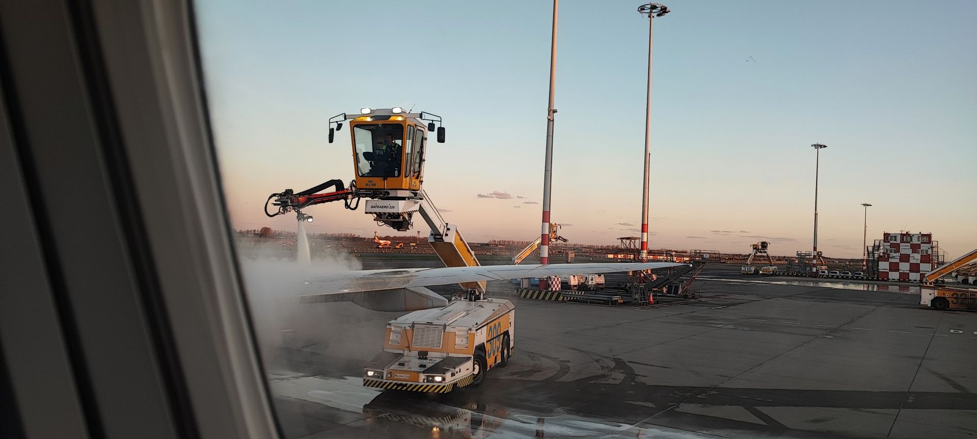 ...maar we hebben toch nog enige vertraging doordat we in de file stonden bij het ontijzen van de vleugels van het vliegtuig.