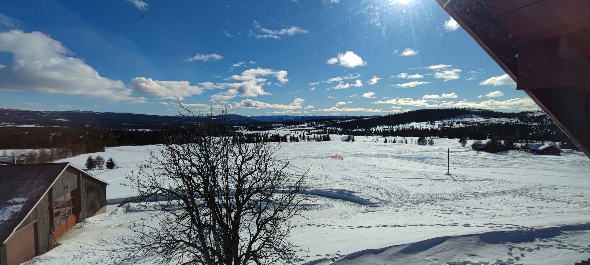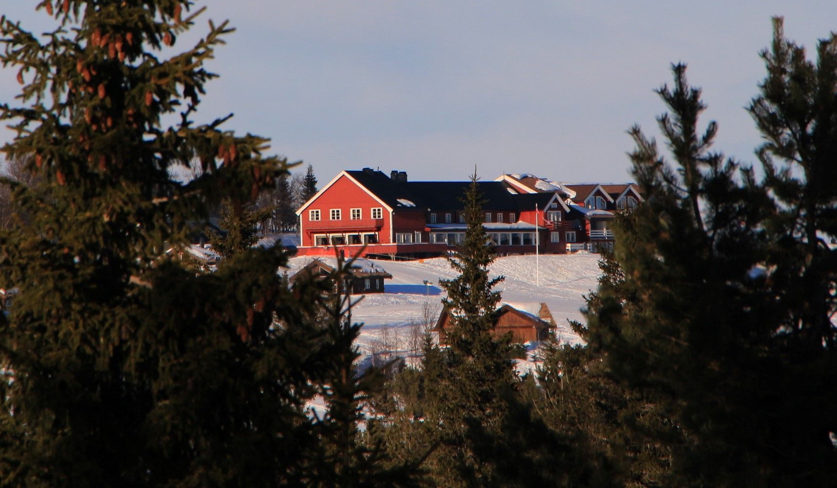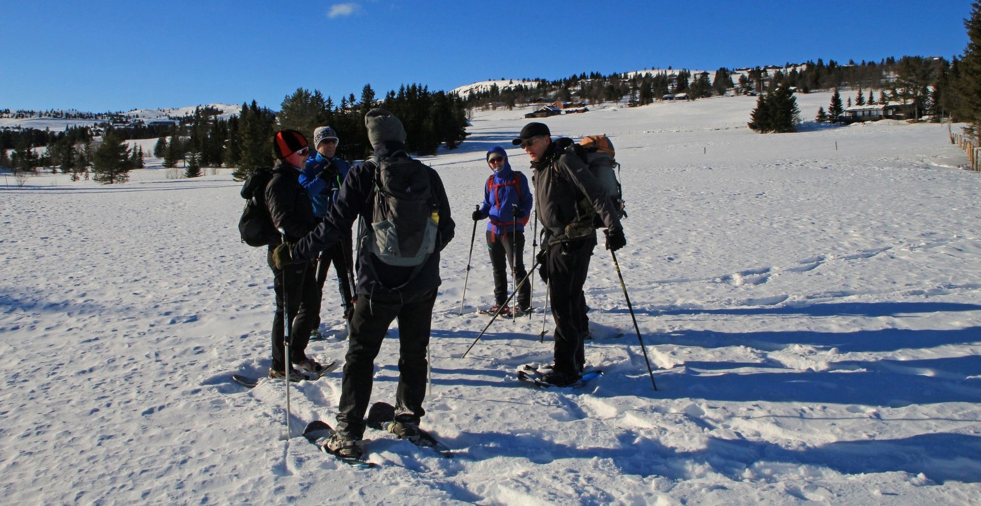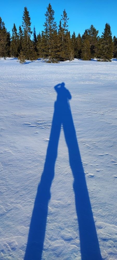 Op het vliegveld van Oslo worden we opgehaald door het hotelbusje dat ons in 3 uur naar het hotel brengt. We kunnen meteen op de kamers en ik heb een kamer met een prachtig weids uitzicht over de omgeving. Het is prachtig zonnig weer en er licht veel sneeuw. Dus een prima reden om in de middag alvast de sneeuwschoenen te passen en een korte wandeling te maken. De eerste stappen is altijd even wennen, maar na een korte instructie van Jan Karel, zoals over een hekje stappen en de langlaufloipes vermijden, stappen we vrolijk rond. De laagstaande zon geeft een mooi strijklicht en lange schaduwen. Na ruim 1,5 uur zien we het hotel tussen de dennenbomen te voorschijn komen, een prima inloop tochtje.