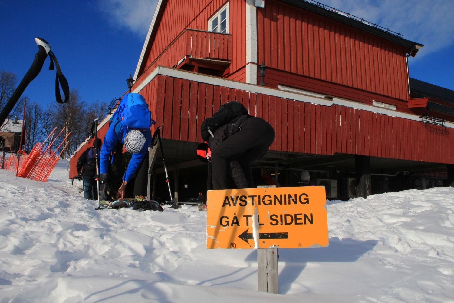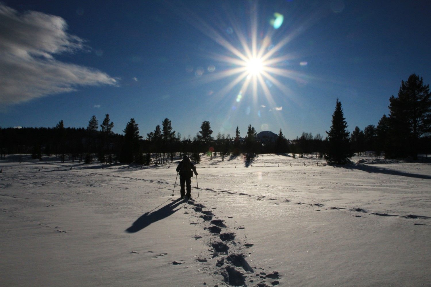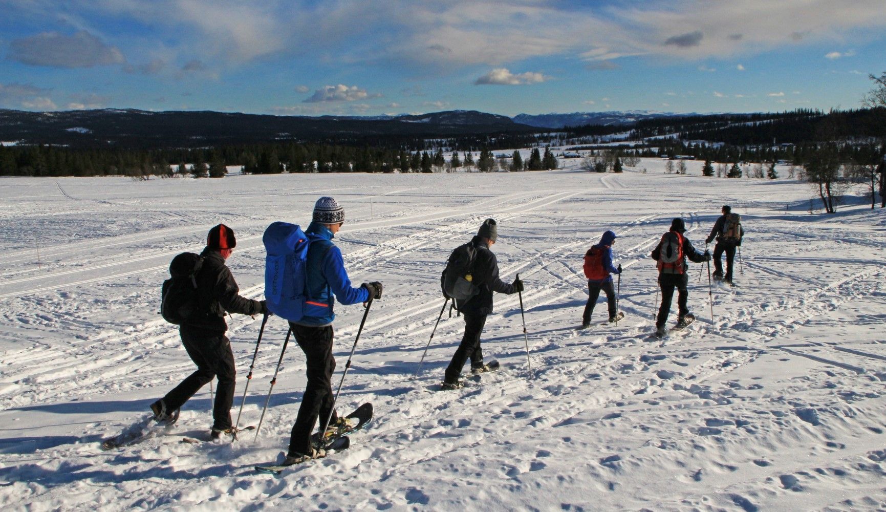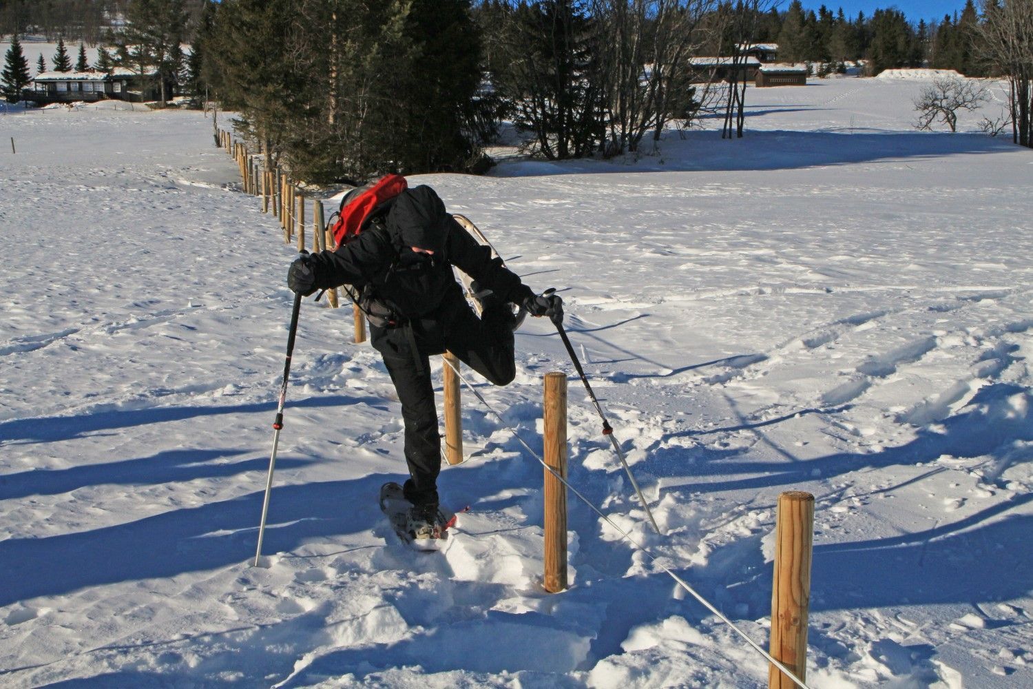Op het vliegveld van Oslo worden we opgehaald door het hotelbusje dat ons in 3 uur naar het hotel brengt. We kunnen meteen op de kamers en ik heb een kamer met een prachtig weids uitzicht over de omgeving. Het is prachtig zonnig weer en er licht veel sneeuw. Dus een prima reden om in de middag alvast de sneeuwschoenen te passen en een korte wandeling te maken. De eerste stappen is altijd even wennen, maar na een korte instructie van Jan Karel, zoals over een hekje stappen en de langlaufloipes vermijden, stappen we vrolijk rond. De laagstaande zon geeft een mooi strijklicht en lange schaduwen. Na ruim 1,5 uur zien we het hotel tussen de dennenbomen te voorschijn komen, een prima inloop tochtje.