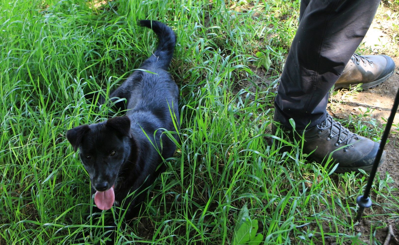 Een zwarte hond bietst om eten en loopt de rest van wandeling met ons mee.
