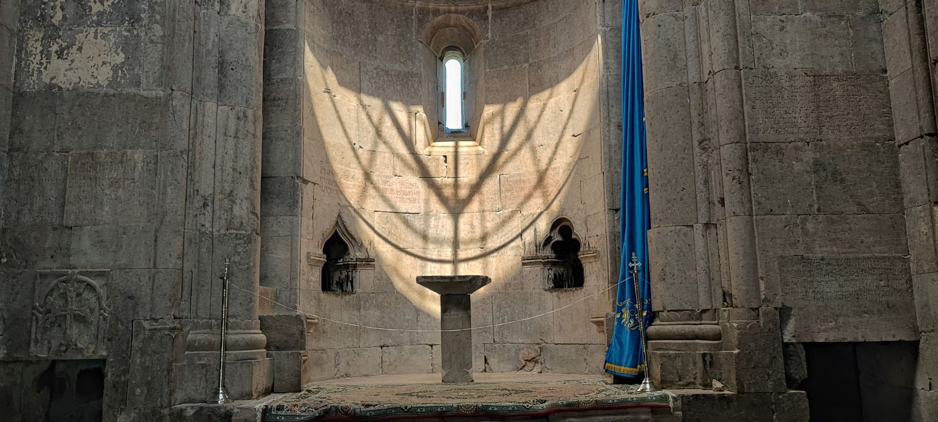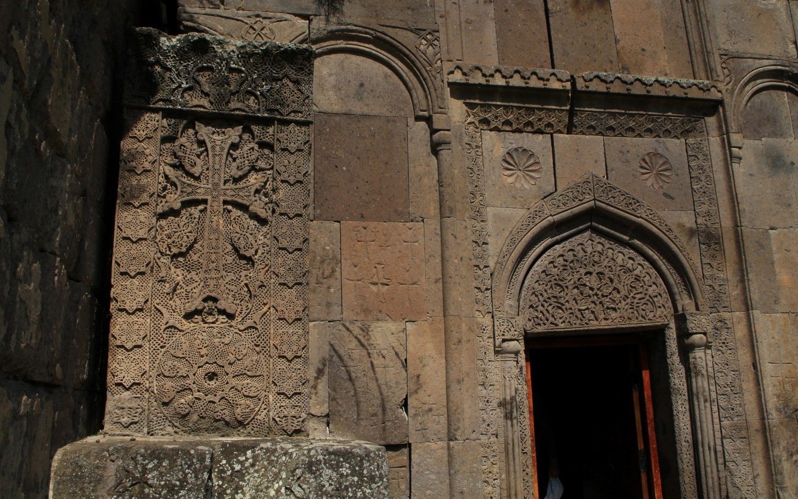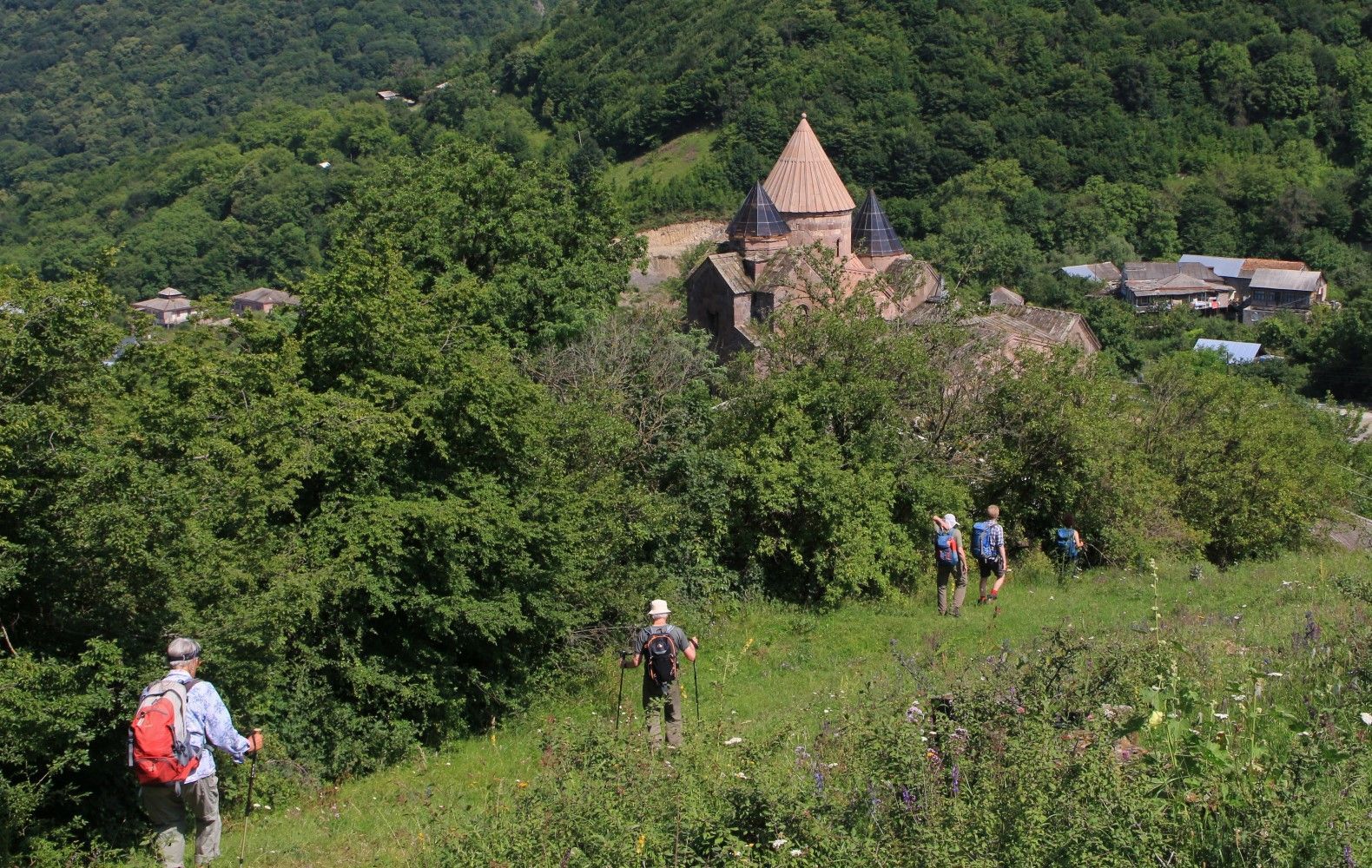 We lopen verder en dalen richting het dorpje Goshavank, het einddoel van de wandeling van vandaag. Beneden zien we het twaalfde-eeuwse klooster Goshavank. Afgelegen, maar ooit was het een van de belangrijkste culturele centra van het land, met een bibliotheek met meer dan vijftienduizend werken! Het klooster is genoemd naar de rechtsgeleerde/theoloog en monnik, Gosh. Dat vertelt tenminste onze Armeense gids Annie. Ook moeten we van haar de bijzonder mooi versierde kruissteen niet vergeten te bewonderen.