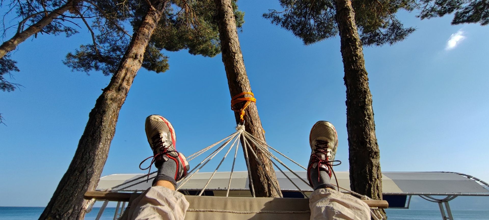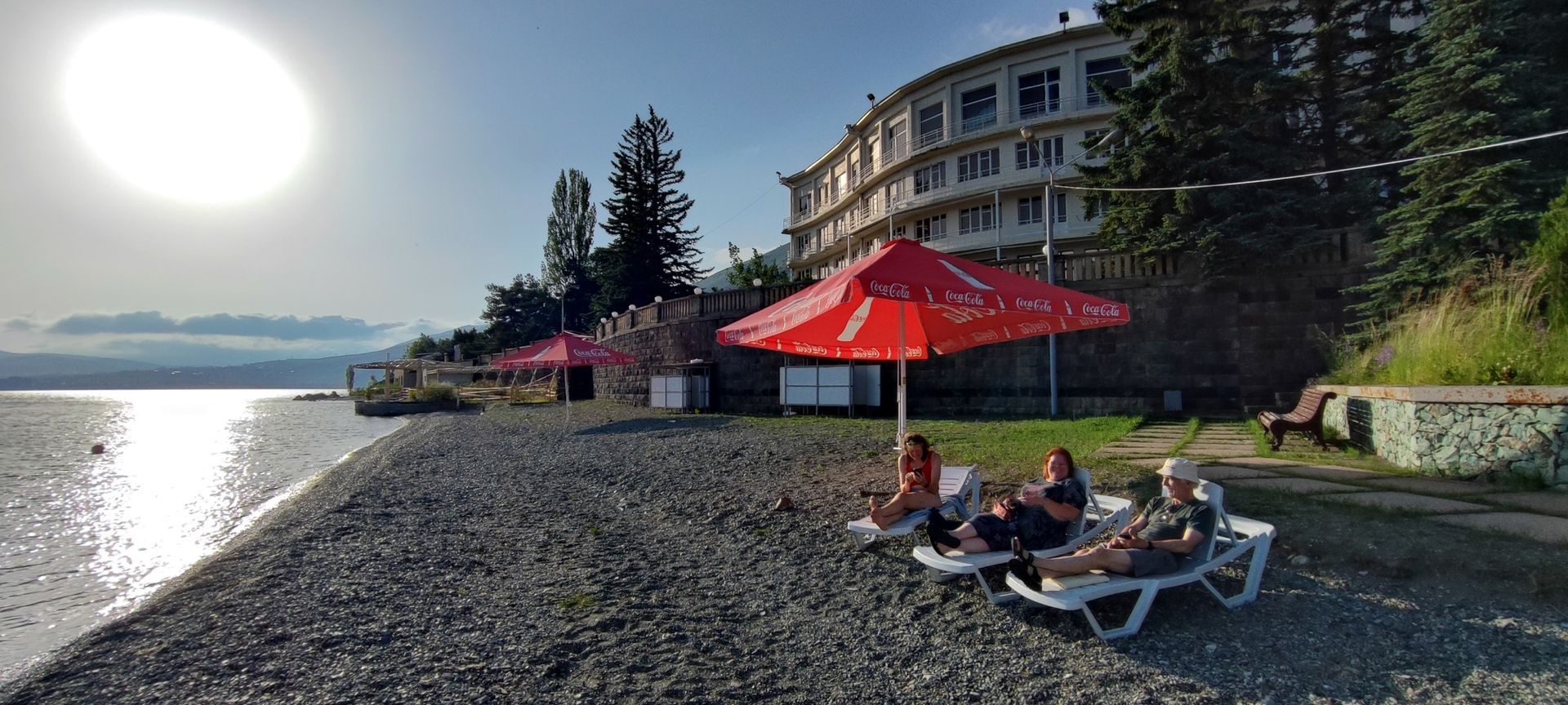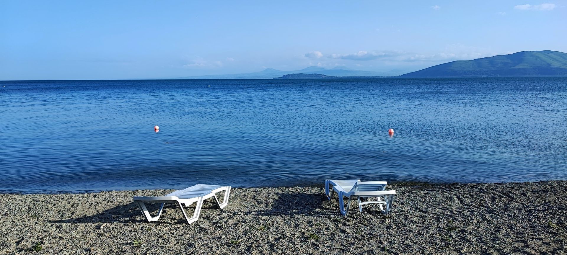 Na het kerk en een terras bezoek rijden we in een uur naar het grote Meer van Sevan. Op 1900 meter hoogte gelegen, was dit in de Sovjetperiode dé toeristische trekpleister van het land. We slapen hier in een postcommunistisch hotel. Natuurlijk met de diehards, inclusief Ani, gezwommen in het koude meer. Terwijl sommigen nog even op het strand van de laatste zonnestalen genoten, heb ik wat rond gelopen, een hangmat uit geprobeerd en een en ander strandmeubilair gefotografeerd.