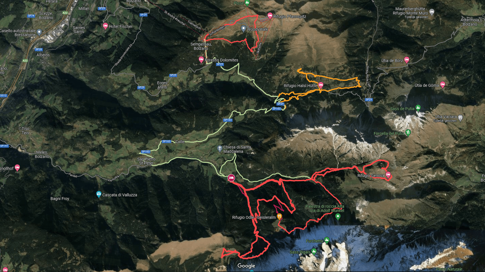 Na deze aangename onderbreking in de Halsl Hütte gaan we weer op pad, en al snel verlaten wij de (asfalt)weg. Door grote sneeuw hopen passeren we een aantal mooi gelegen huisjes. Hier in het hooggelegen dal ligt nog behoorlijk veel sneeuw en Alice kan zich niet inhouden en laat zich in de sneeuw vallen om een vlinder te maken. Anderen volgen haar voorbeeld snel. En we krijgen weer de mogelijkheid om in de tief sneeuw te spelen. Spelen blijft leuk. Echter niet veel later merkt Rob dat hij zijn GPS niet meer heeft, verloren bij in het sneeuw spelen. Hij gaat terug om te zoeken, terwijl wij even verderop wachten. Hij vind hem niet en per telefoon laat hij ons weten dat we door mogen lopen. We gaan gelijk klimmen, langs een huisje en verder omhoog. Bij een kruisbeeld stoppen we om te pauzeren. Met uitzicht op de 2875 meter hoge Peitlerkofel zien we Rob naderen. We mogen hier wel wat eten of snacken, maar een bordje maakt ons duidelijk dat we het hier niet mogen achter laten. Na nog een klein stukje klimmen, komen we op een mooi vlak pad met prachtige uitzichten op de Peitlerkofel en de andere kant van het dal. We volgen dit pad een tijdje, passeren een christus beeld, en genieten van het uitzicht. We lunchen bij een hutje met uitzicht op weer een christus beeld. Ik maak qua sfeer twee totaal verschillende lunch foto's.