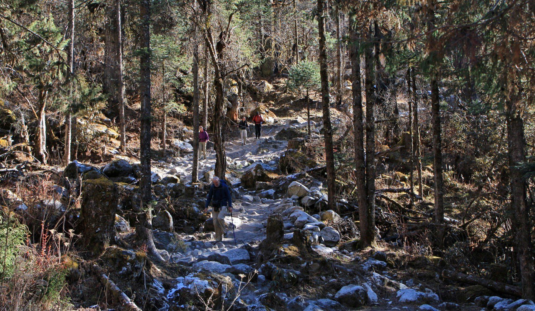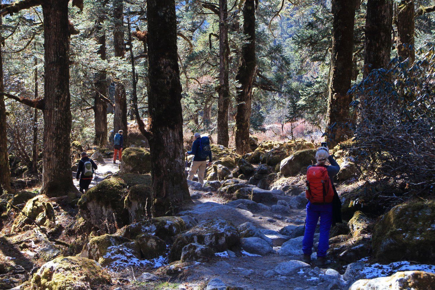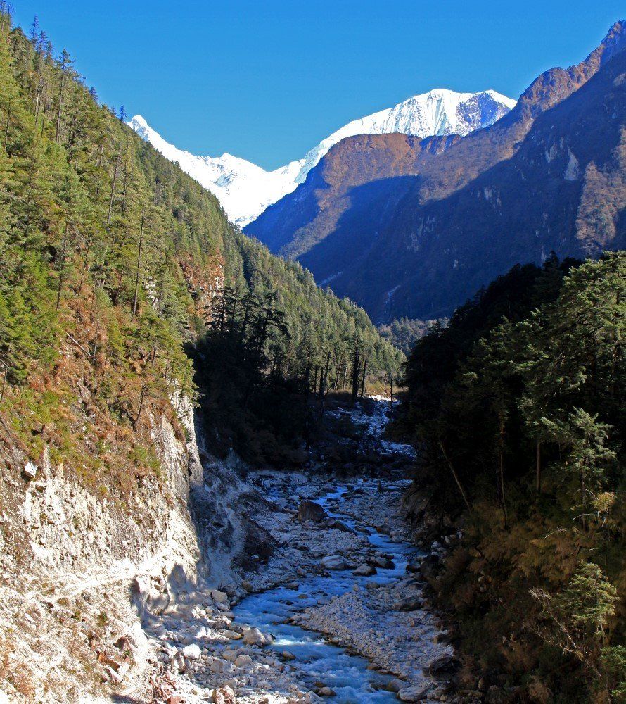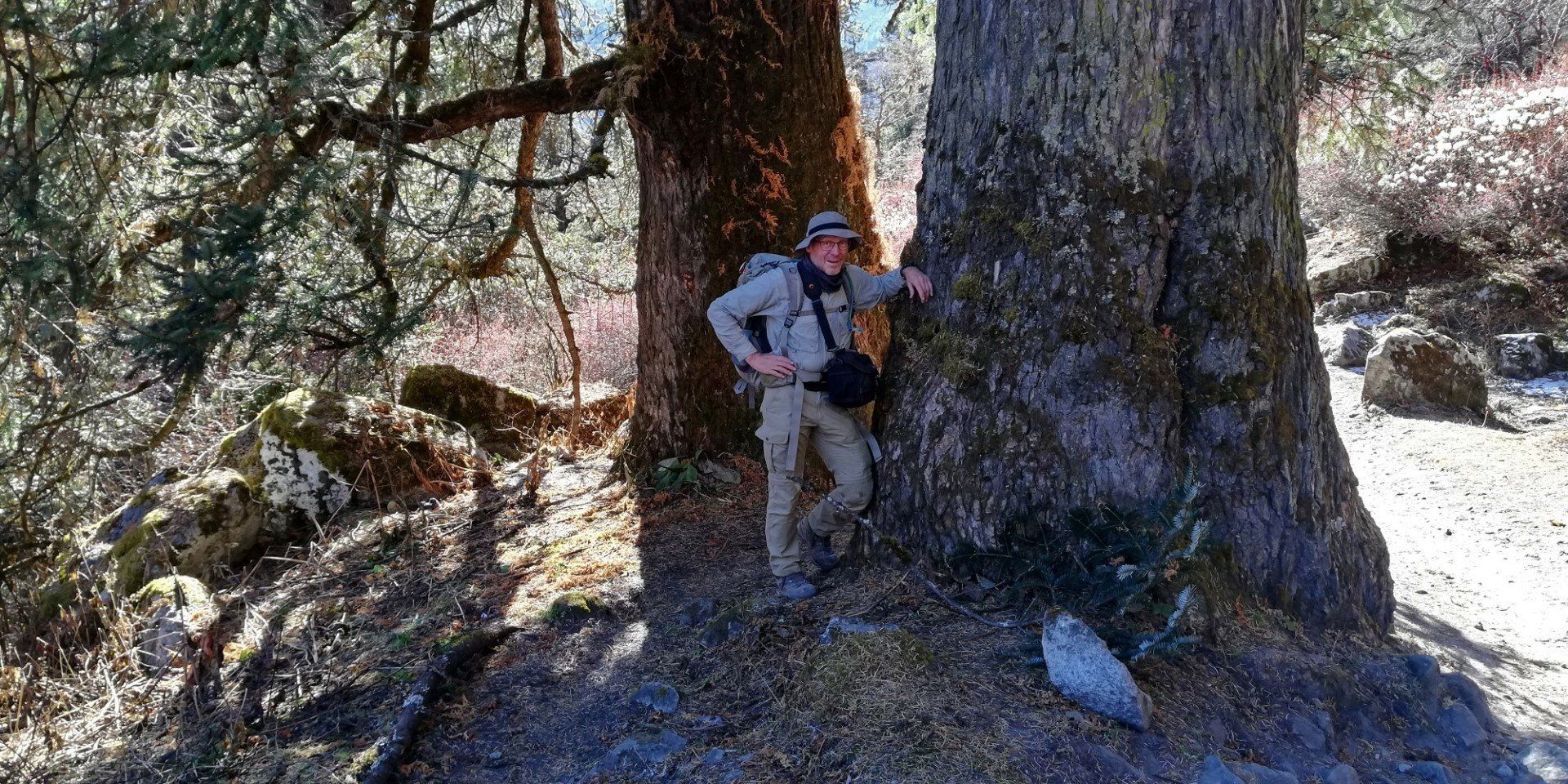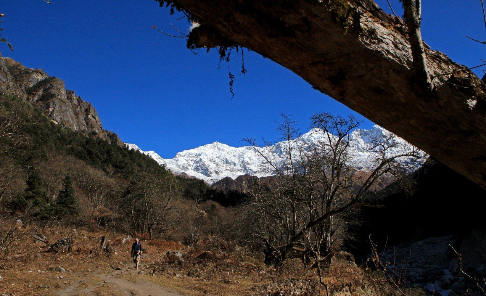 Het is kraak helder als ik uit het raam van ons hutje van de lodge naar de witte bergtoppen kijk. Het is goed koud geweest, de waterleiding is weer bevroren en zelfs het beekje wat langs de lodge stroomt is bevroren. We vervolgen onze weg omlaag door prachtige bossen, met een geweldig uitzicht over het Peri Himal massief en de imponerende westzijde van de Manaslu. Het is een prachtig bos met gigantische bomen. Een paar jaar geleden heeft hier een bosbrand gewoed en die heeft zijn sporen achtergelaten.