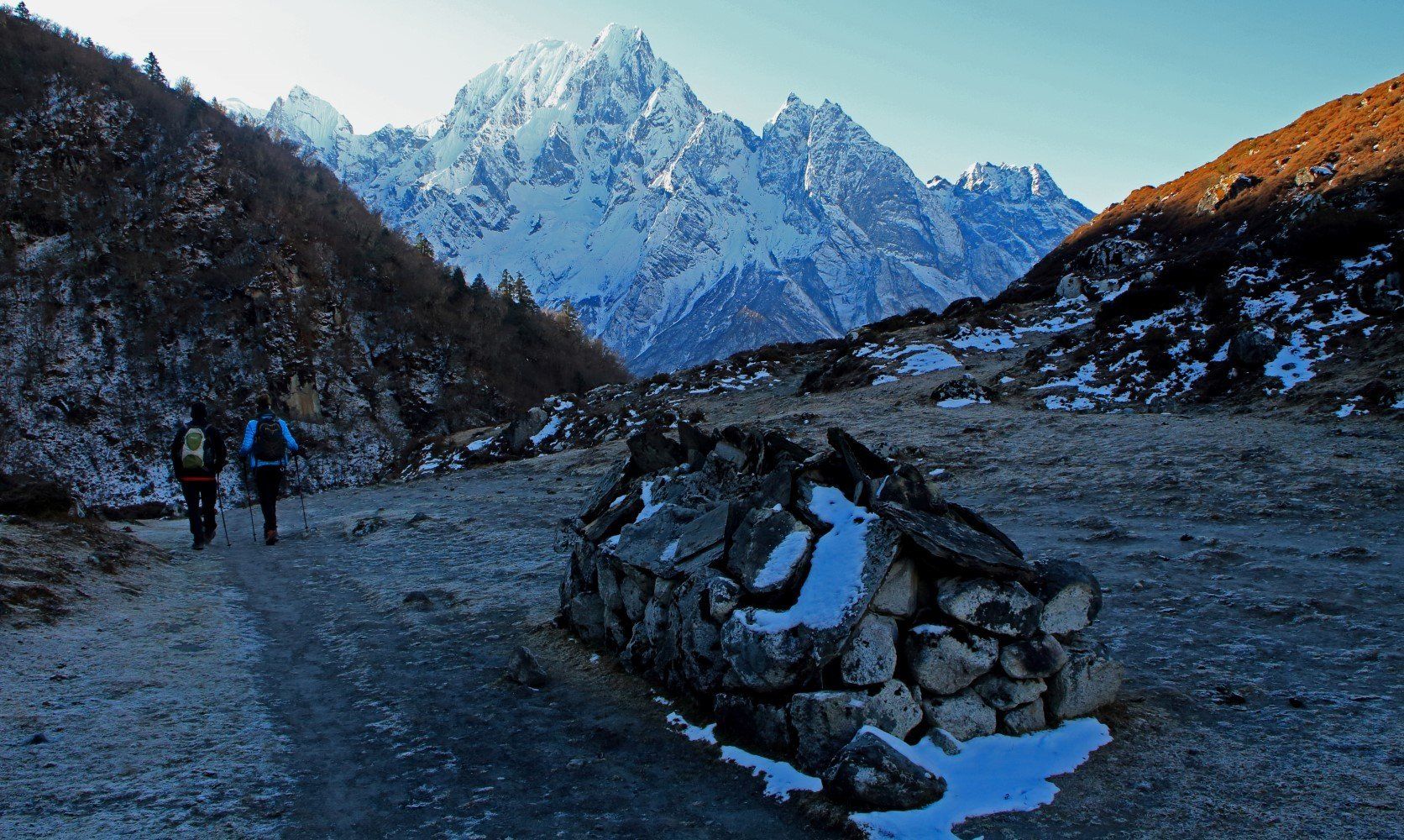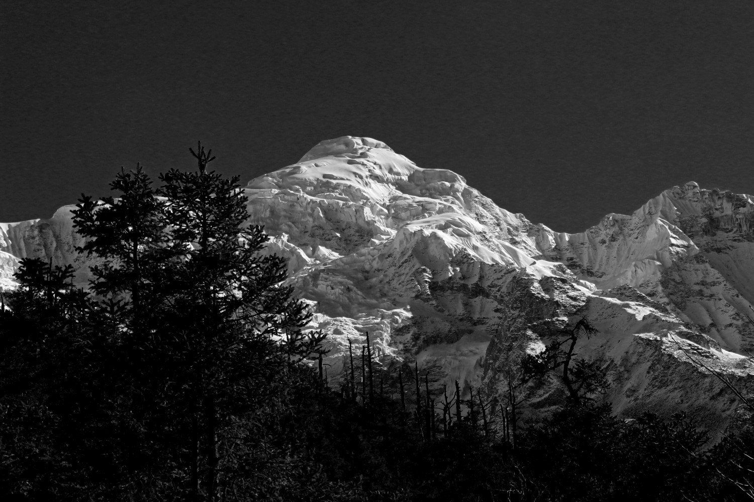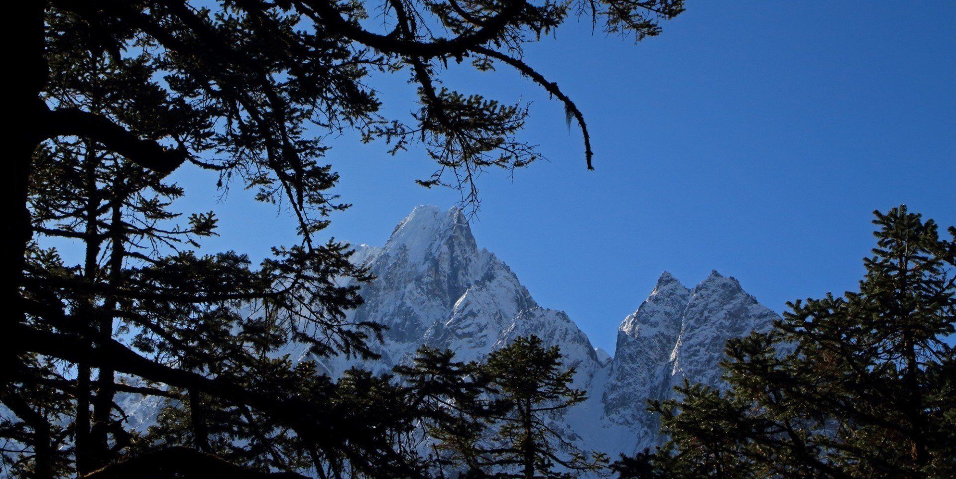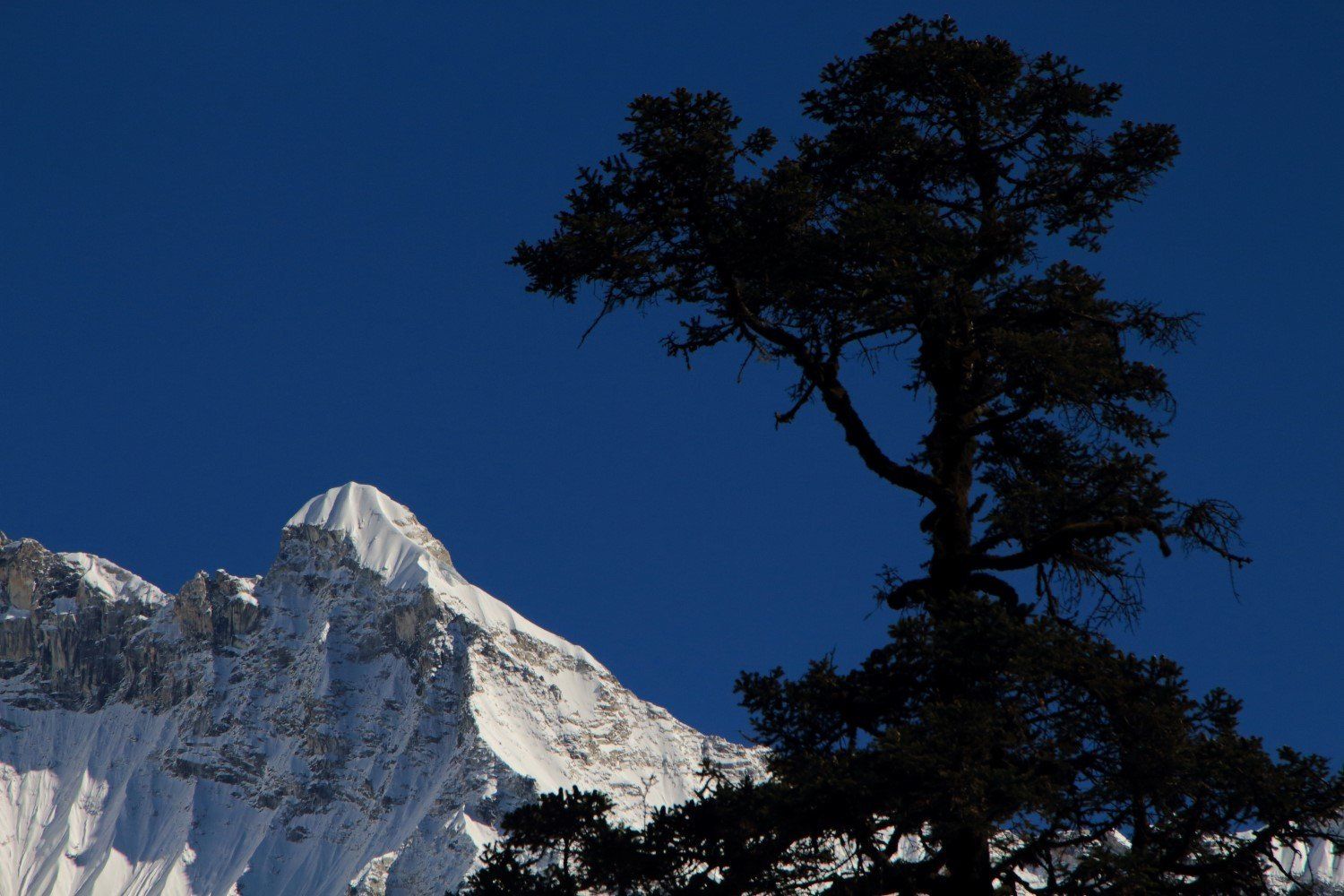 Het is kraak helder als ik uit het raam van ons hutje van de lodge naar de witte bergtoppen kijk. Het is goed koud geweest, de waterleiding is weer bevroren en zelfs het beekje wat langs de lodge stroomt is bevroren. We vervolgen onze weg omlaag door prachtige bossen, met een geweldig uitzicht over het Peri Himal massief en de imponerende westzijde van de Manaslu. Het is een prachtig bos met gigantische bomen. Een paar jaar geleden heeft hier een bosbrand gewoed en die heeft zijn sporen achtergelaten.