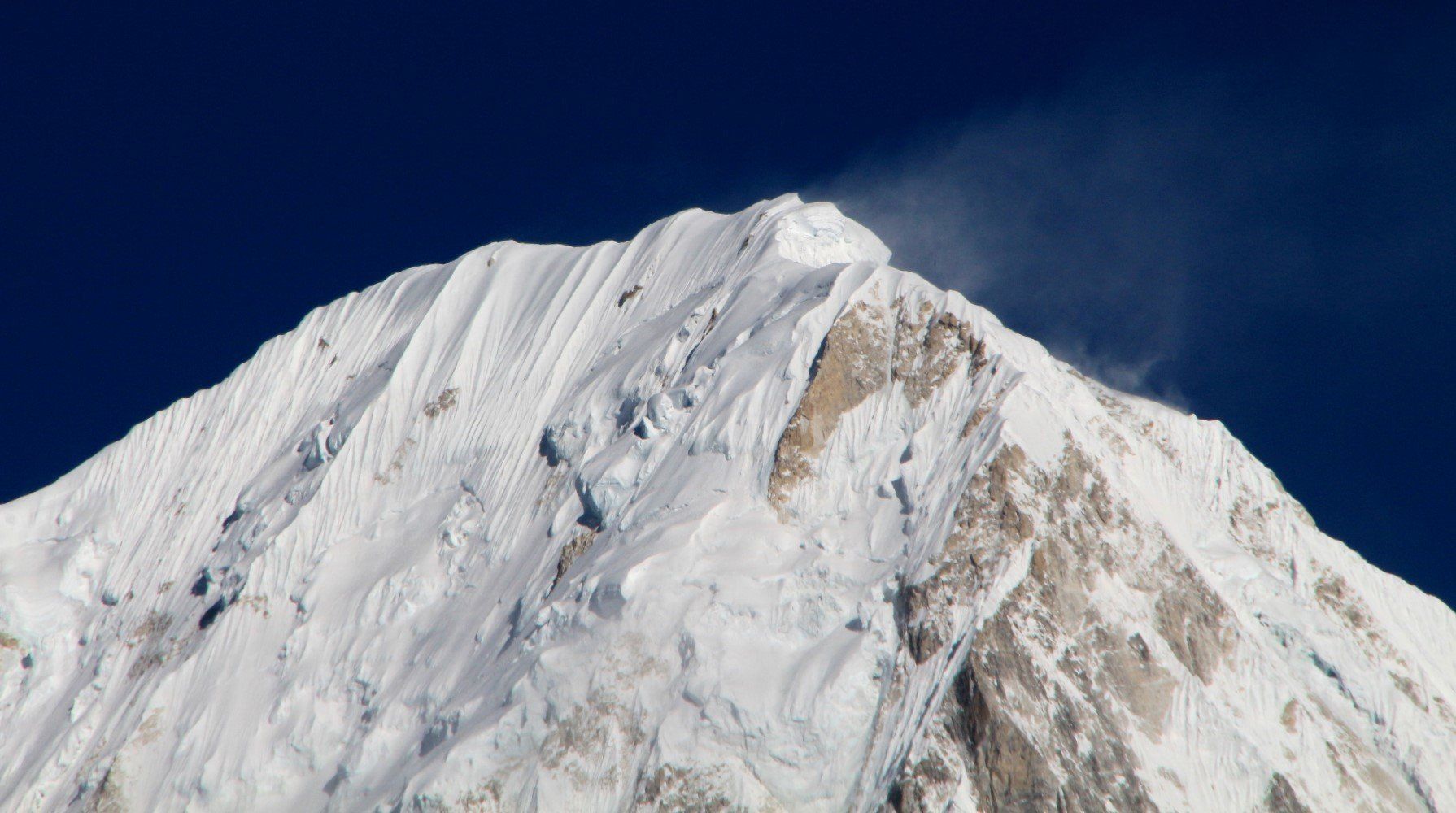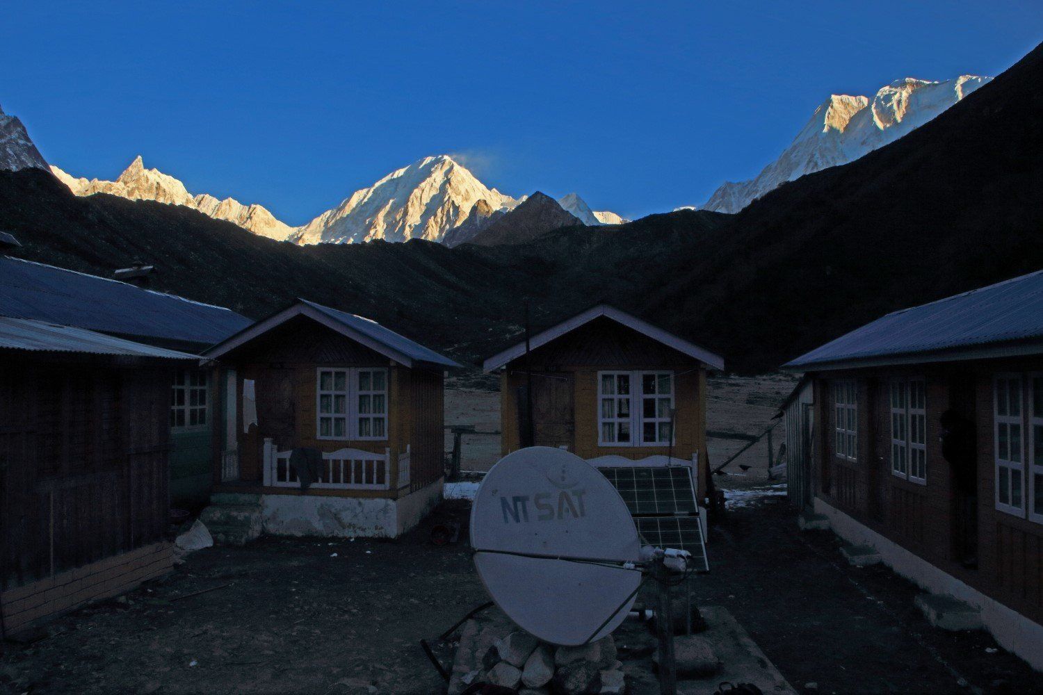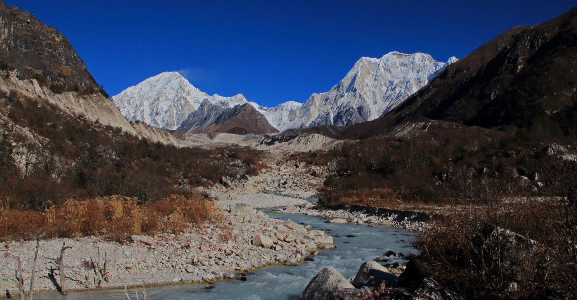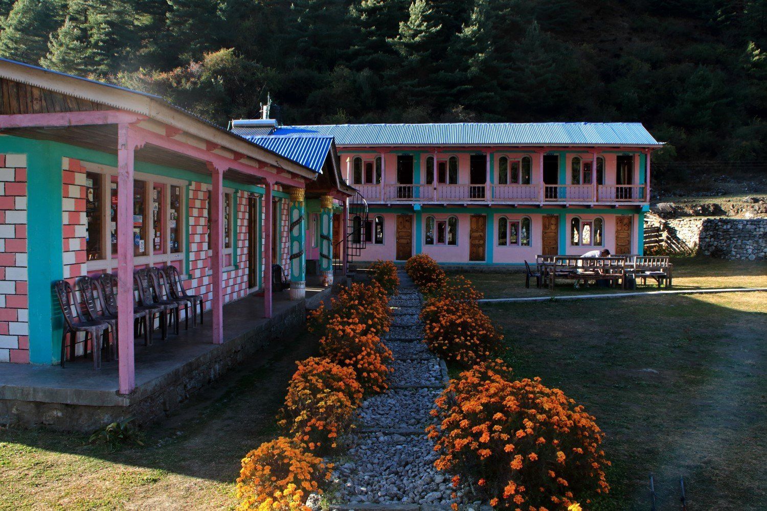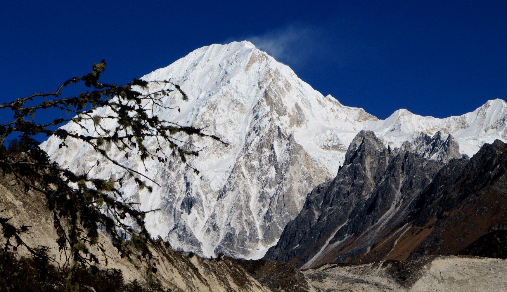 Het is kraak helder als ik uit het raam van ons hutje van de lodge naar de witte bergtoppen kijk. Het is goed koud geweest, de waterleiding is weer bevroren en zelfs het beekje wat langs de lodge stroomt is bevroren. We vervolgen onze weg omlaag door prachtige bossen, met een geweldig uitzicht over het Peri Himal massief en de imponerende westzijde van de Manaslu. Het is een prachtig bos met gigantische bomen. Een paar jaar geleden heeft hier een bosbrand gewoed en die heeft zijn sporen achtergelaten.