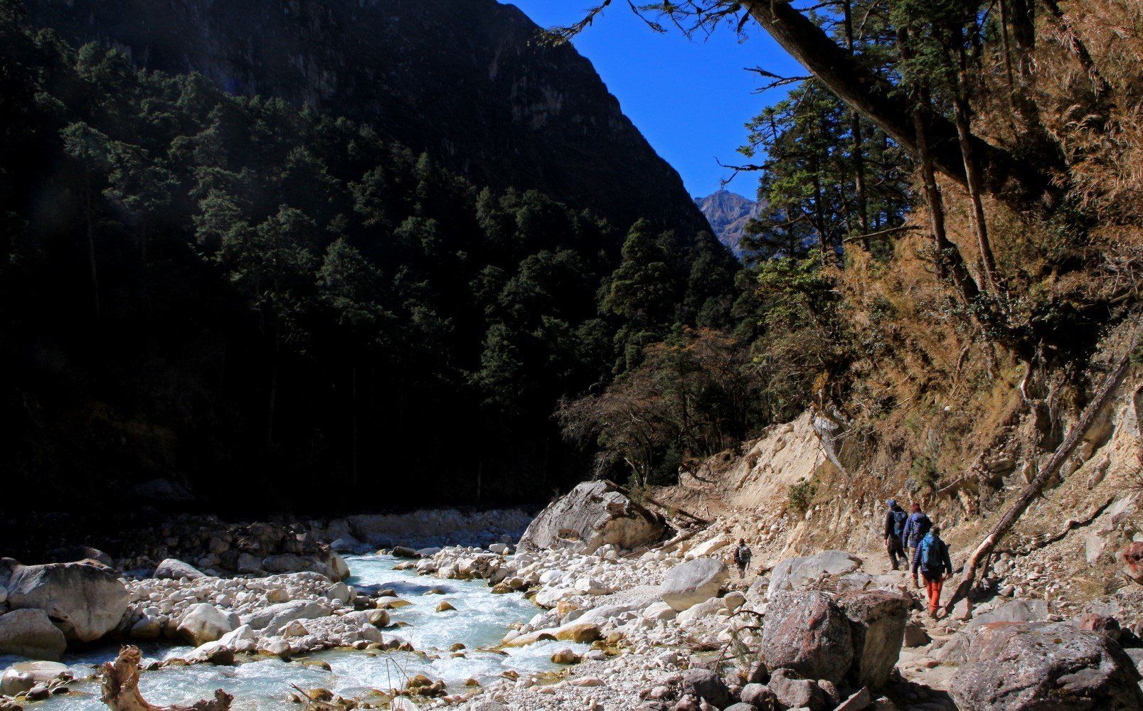 We lopen we langs de melkwitte gletsjerrivier de Dudh Khola verder omlaag naar het zuiden. Eerst nog een gemeen klimmetje over de Kharche Pass maar daarna overwegend omlaag langs morenen, yakweiden, witte strandjes en stenen langs de rivier die omlaag kolkt en de naam Dudh (melk) waar maakt. Ook zien we weer mooie met baardmossen behangen rododendronbossen. Het is even wennen om weer groen om ons heen te hebben na de woeste schoonheid van rotsen, sneeuw en ijs. Ondanks dat het nog steeds een prachtig landschap is, heb ik nu wel het gevoel dat ik naar huis ga. Waarschijnlijk komt dit doordat het hoogtepunt van de reis letterlijk en figuurlijk achter ons ligt. Onderweg spotten wij weer apen en, hoog in de lucht, een roofvogel. We lunchen in een tuin van een lodge, heerlijk in het zonnetje. Onze lodge in Goa is niet veel verder, en daar is het vooral genieten van de warme douche.