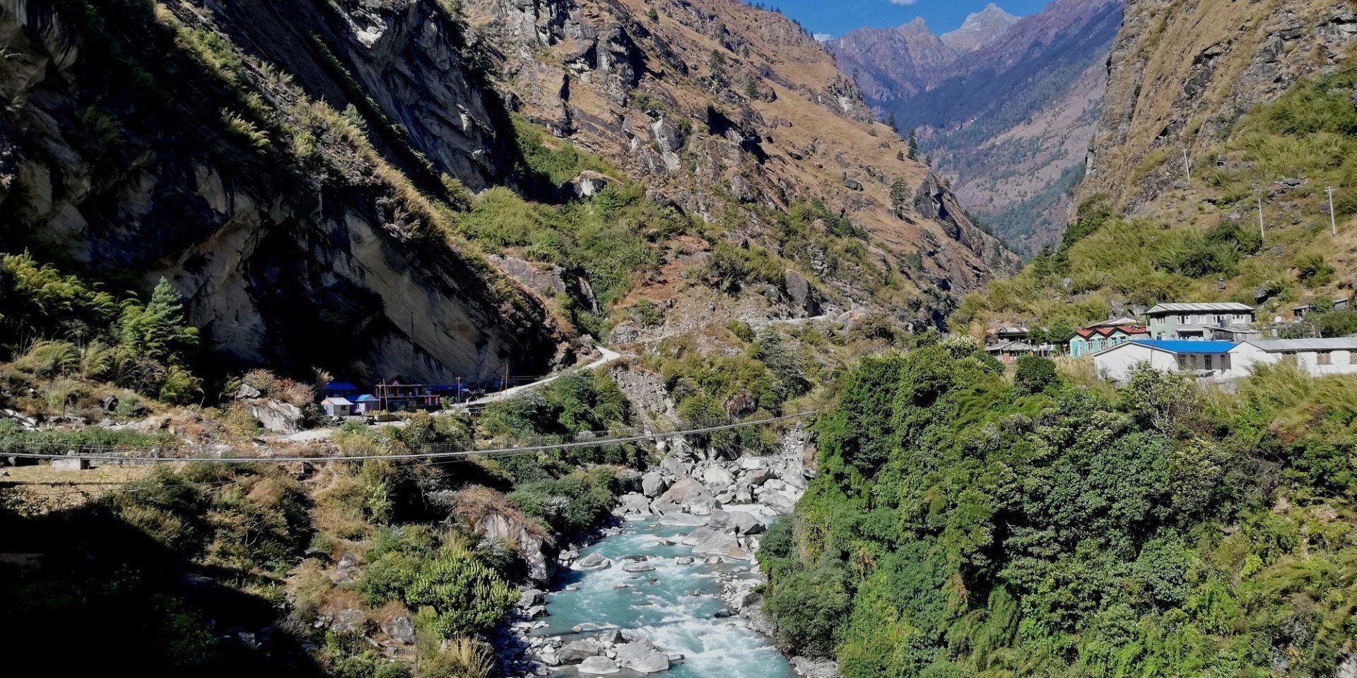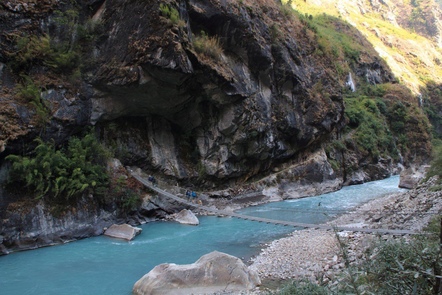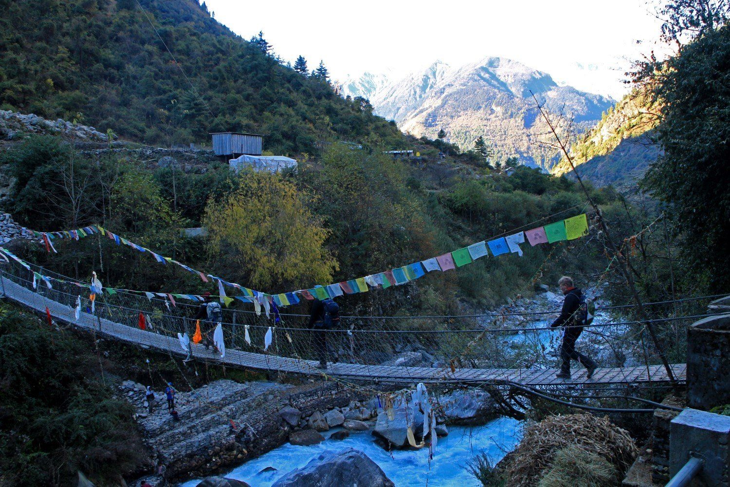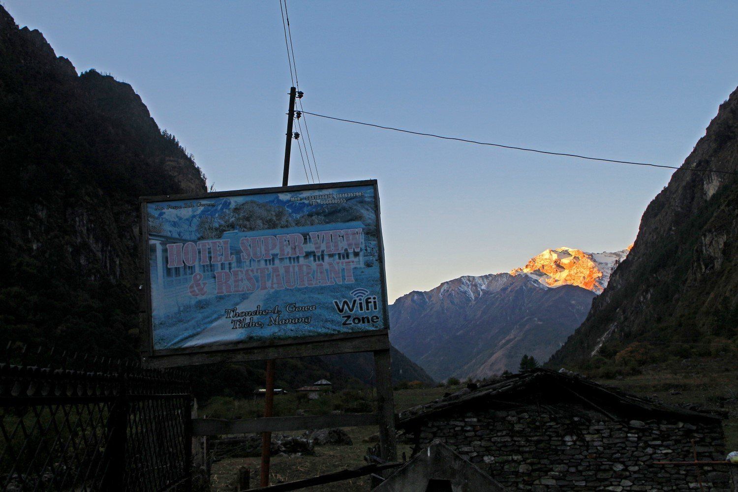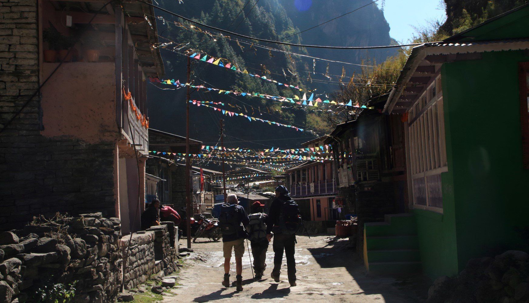 De opkomende zon verlicht een bergtop van de Annapurna keten. De muildieren krijgen hun ontbijt en na ons ontbijt mogen we aan onze laatste etappe beginnen. De hele ochtend lopen wij in de schaduw, op ons pad komen we weer een kudde geiten tegen en de nodige bergtoppen. Bij een hangbrug zie ik hoe mannen vlak naast de kolkende Dudh Khola de oever aan het repareren zijn. Ook hier zijn ze een weg aan het aanleggen, en we snappen niet hoe de sjofel over de rivier is gekomen. Al na ruim een uur lopen bereiken wij het mooie Gurung dorp Tilje, dat we eigenlijk veel te snel passeren. Naast de vele gebedsvlaggen hangt hier ook een sliert Afrikaantjes met wat roepies.