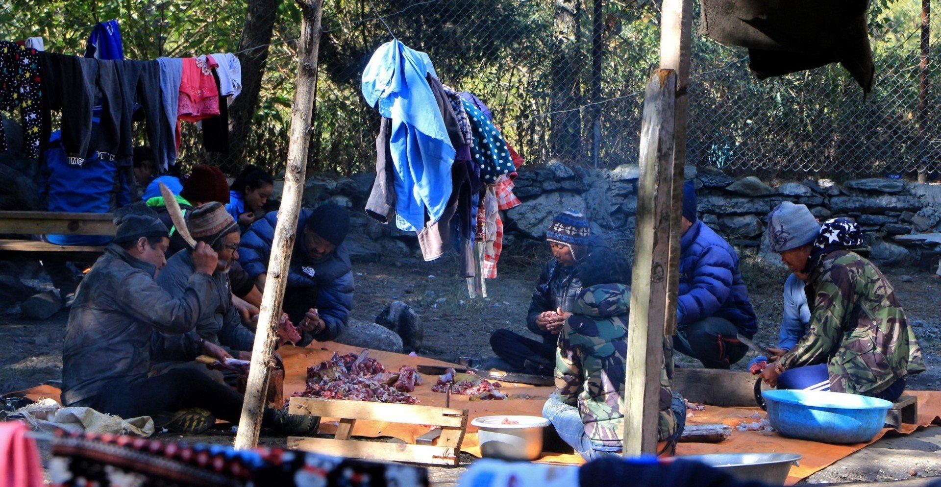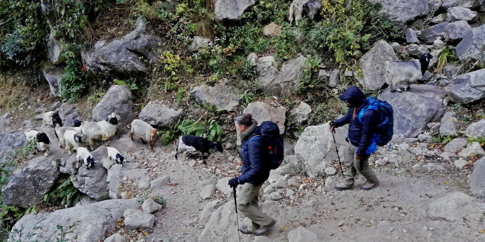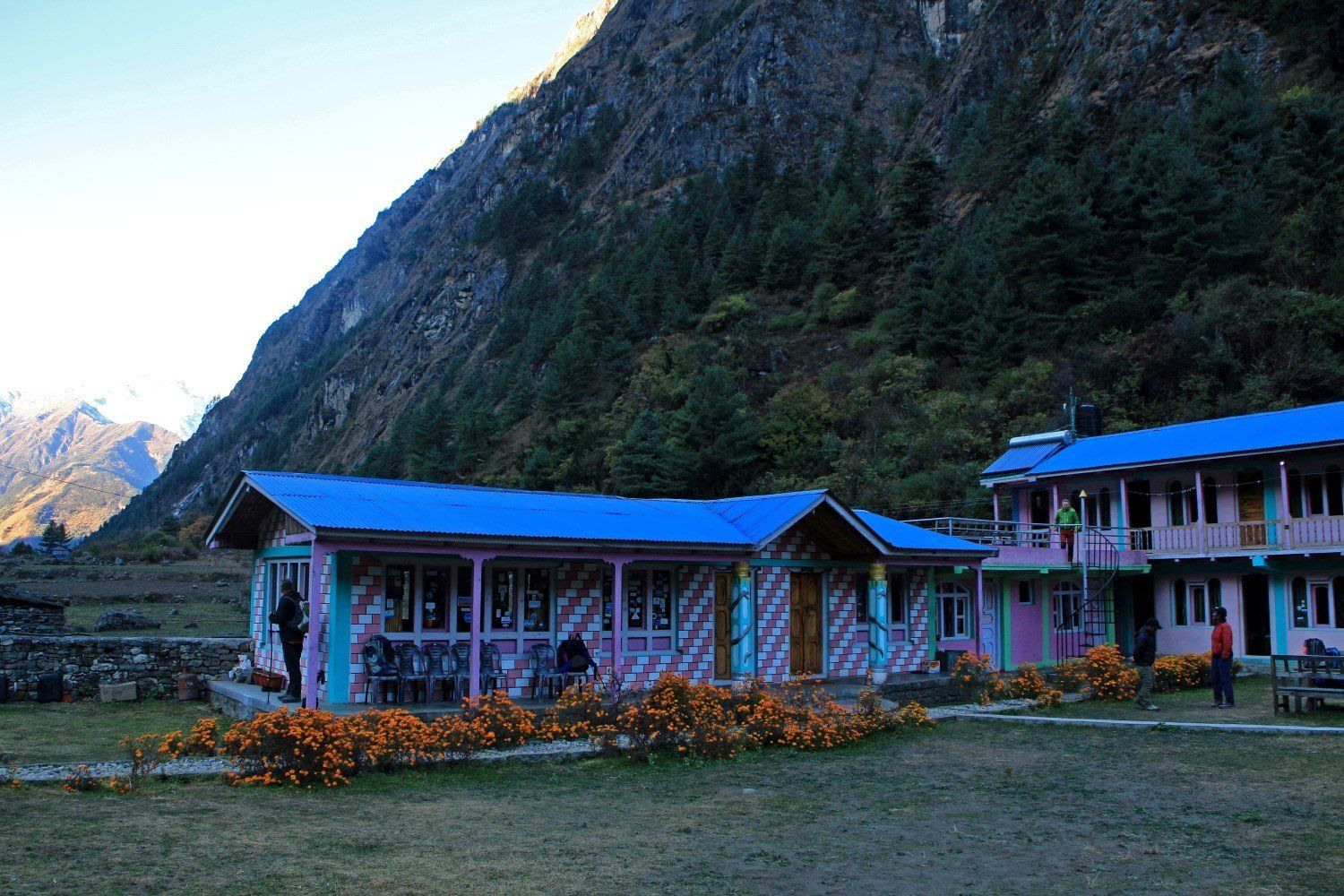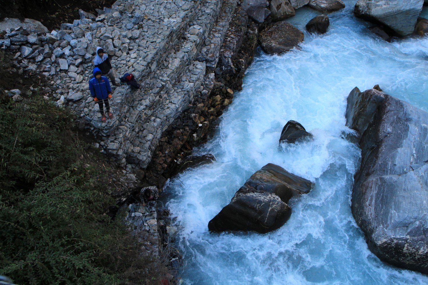 De opkomende zon verlicht een bergtop van de Annapurna keten. De muildieren krijgen hun ontbijt en na ons ontbijt mogen we aan onze laatste etappe beginnen. De hele ochtend lopen wij in de schaduw, op ons pad komen we weer een kudde geiten tegen en de nodige bergtoppen. Bij een hangbrug zie ik hoe mannen vlak naast de kolkende Dudh Khola de oever aan het repareren zijn. Ook hier zijn ze een weg aan het aanleggen, en we snappen niet hoe de sjofel over de rivier is gekomen. Al na ruim een uur lopen bereiken wij het mooie Gurung dorp Tilje, dat we eigenlijk veel te snel passeren. Naast de vele gebedsvlaggen hangt hier ook een sliert Afrikaantjes met wat roepies.