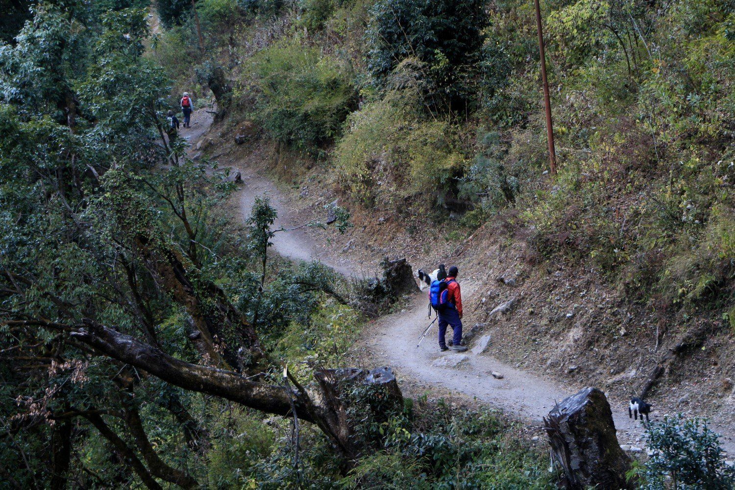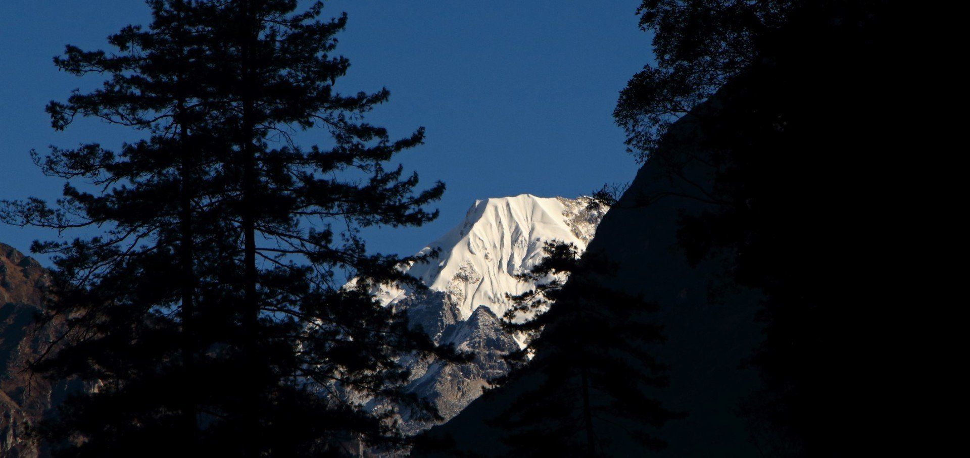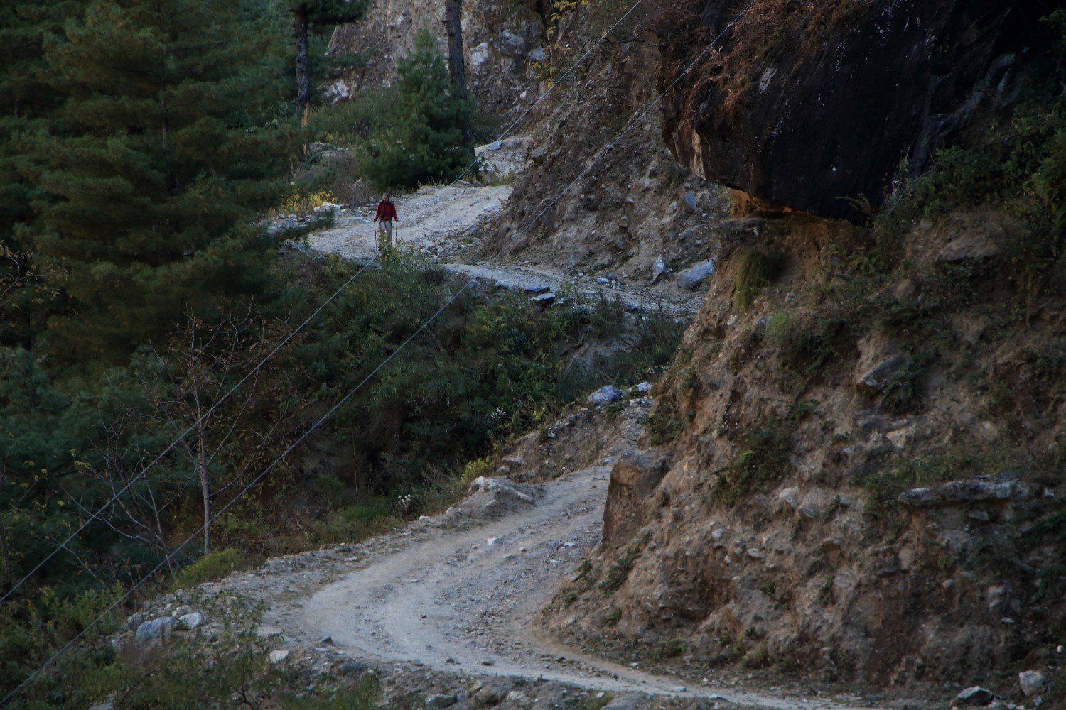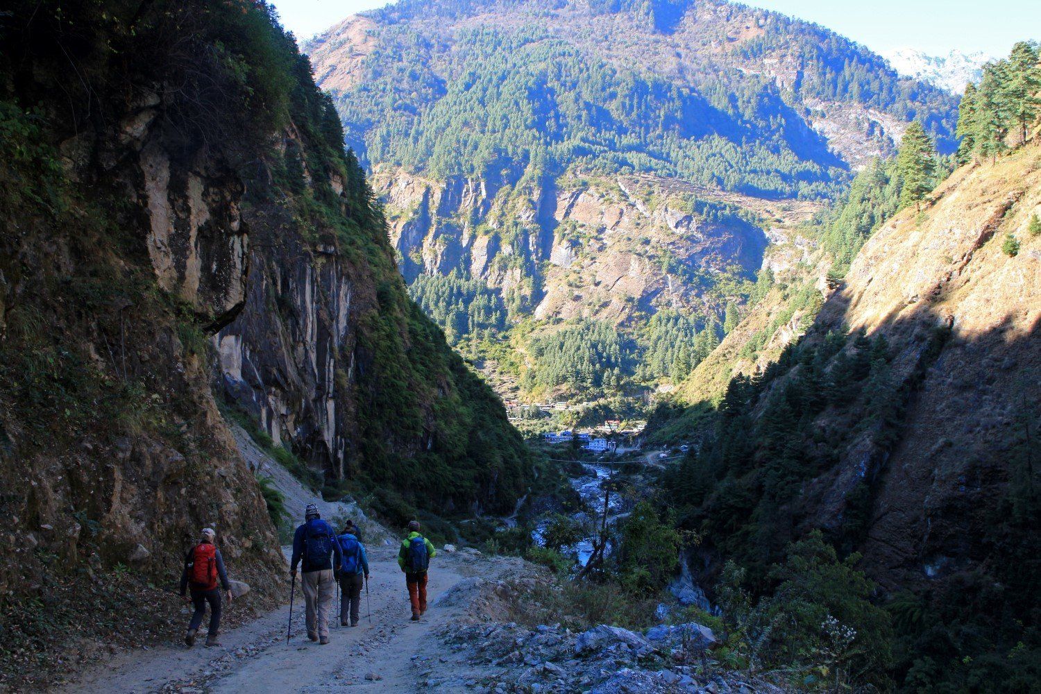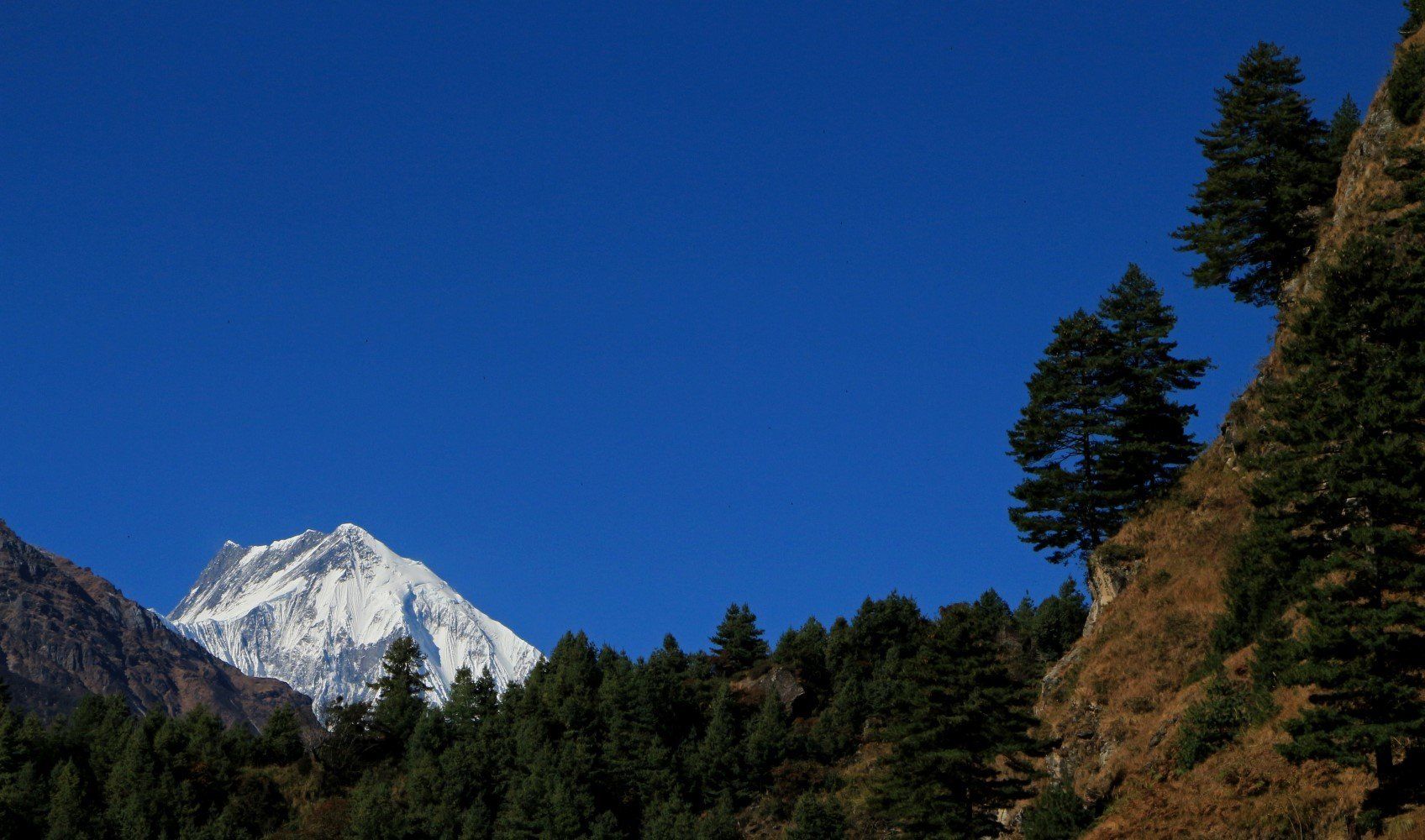De opkomende zon verlicht een bergtop van de Annapurna keten. De muildieren krijgen hun ontbijt en na ons ontbijt mogen we aan onze laatste etappe beginnen. De hele ochtend lopen wij in de schaduw, op ons pad komen we weer een kudde geiten tegen en de nodige bergtoppen. Bij een hangbrug zie ik hoe mannen vlak naast de kolkende Dudh Khola de oever aan het repareren zijn. Ook hier zijn ze een weg aan het aanleggen, en we snappen niet hoe de sjofel over de rivier is gekomen. Al na ruim een uur lopen bereiken wij het mooie Gurung dorp Tilje, dat we eigenlijk veel te snel passeren. Naast de vele gebedsvlaggen hangt hier ook een sliert Afrikaantjes met wat roepies.