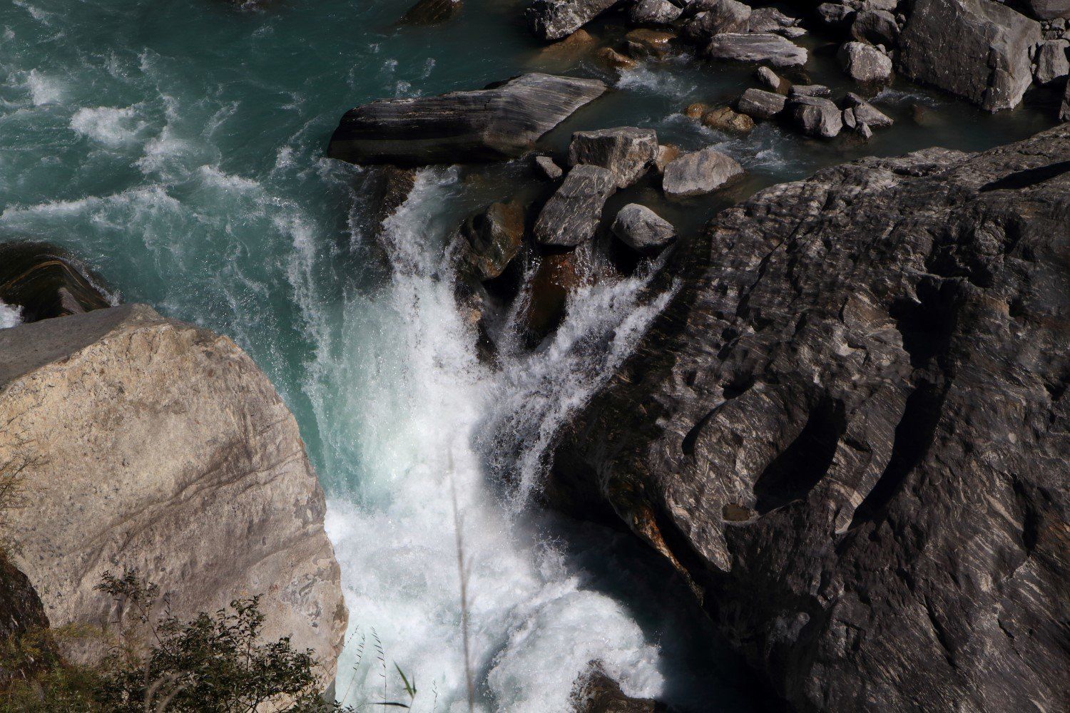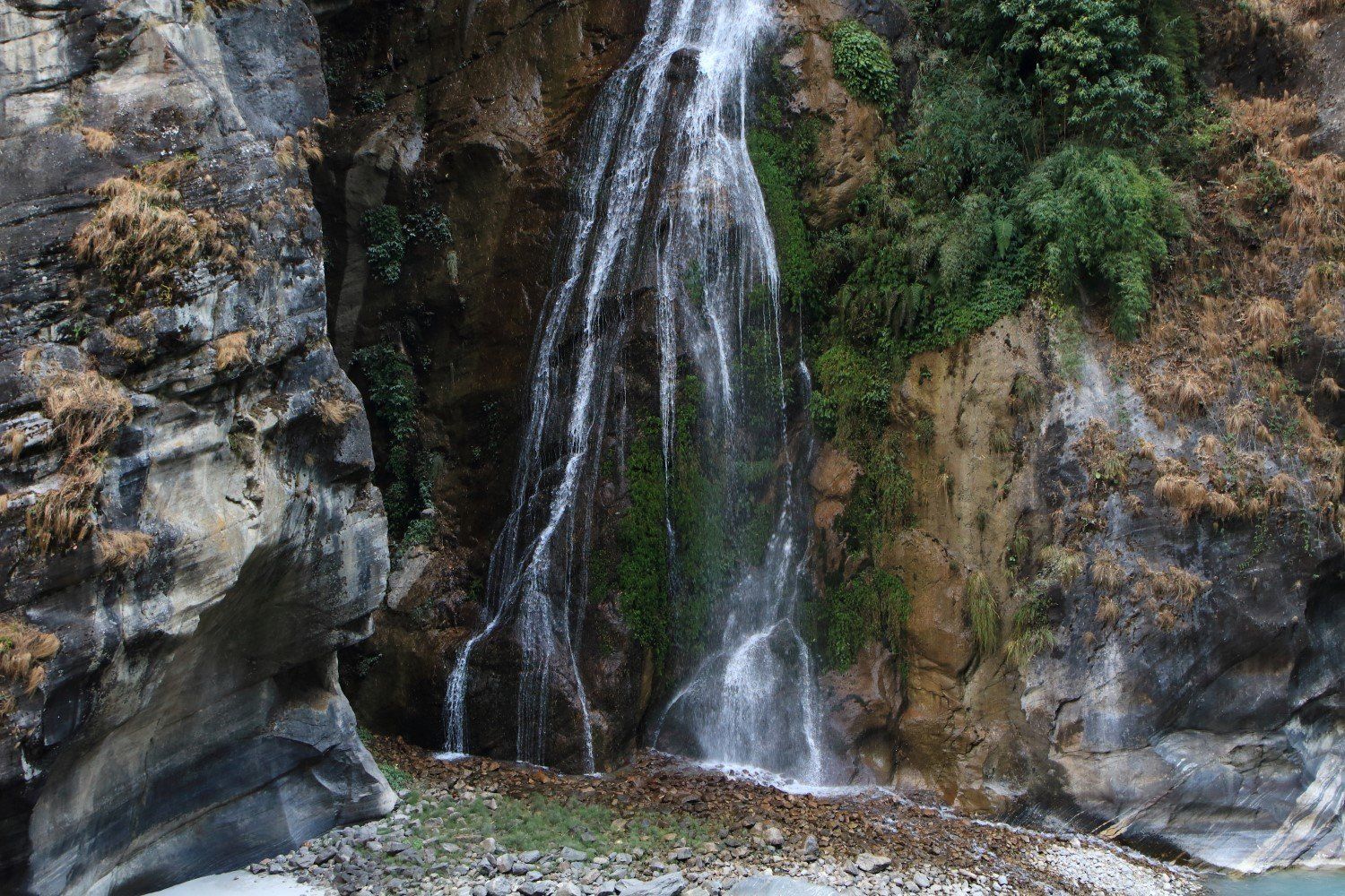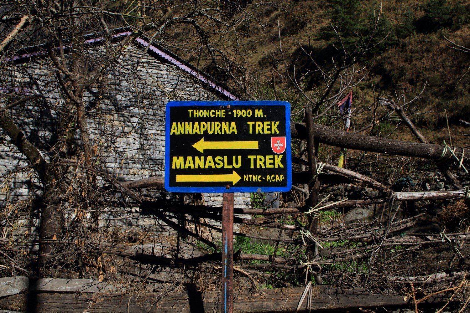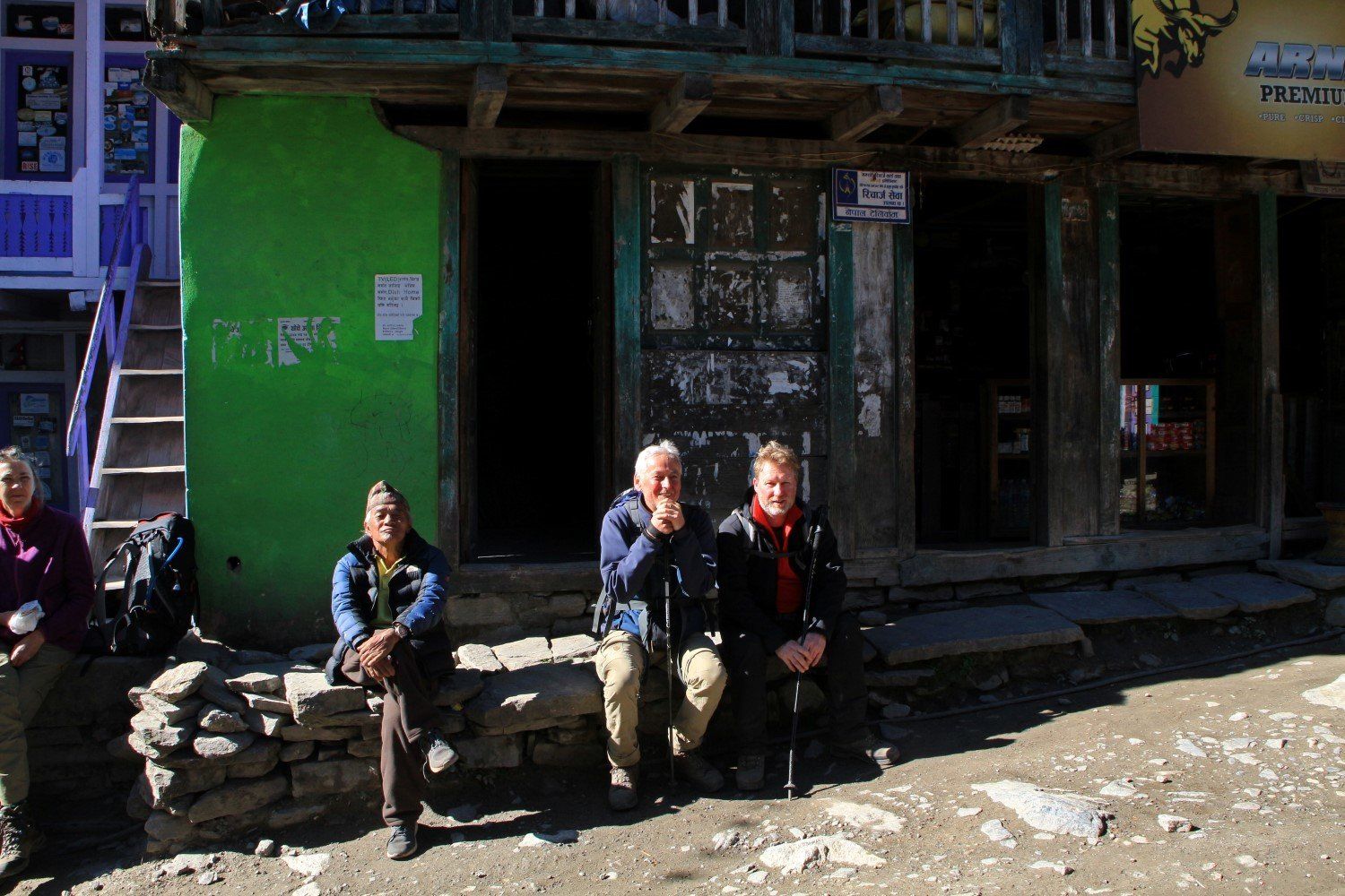 We blijven in de schaduw lopen tot daar waar de Dudh Khola zich samenvoegt met de Marsyangdi rivier en we op de Annapurna trail komen. Op de kruising bij Dharapani zit een man die zich trots door iedereen laat fotograferen. In een tuin zijn een groep mannen vlees aan het klein snijden en hakken. We zijn nu in een geheel andere wereld met veel theehuizen, restaurants en lodges. Ik had verwacht dat het op deze route veel drukker zou zijn dan wij gewend waren, vooral ook omdat we tegen de Annapurna stroom inlopen, maar dat valt reuze mee, waarschijnlijk omdat het al vrij laat in het seizoen is. Bij de eerste de beste lodge bestellen wij koffie, en ondanks dat die van slechte kwaliteit is smaakt hij best. Links zien wij een hangbrug over een hele diepe kloof liggen, als je daar over gaat, moet je echt geen hoogtevrees hebben. We volgen de kolkende Marsyangdi rivier naar beneden, gevoed door vele watervallen, gaan nog een keer een hangbrug over en bereiken dan het einde van de Manaslu trekking, het dorpje Tal. Een klein dorp waar weinig valt te beleven.