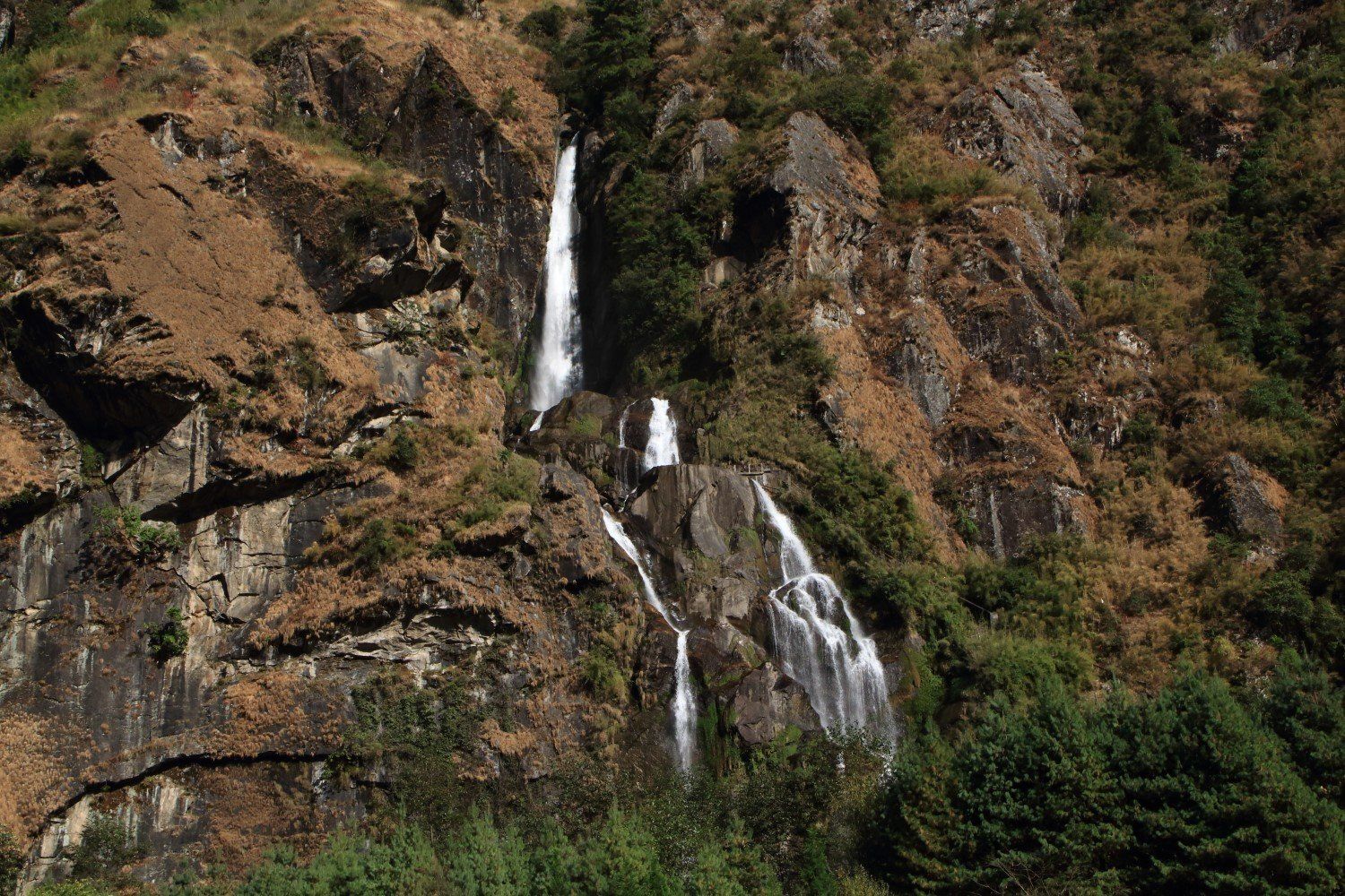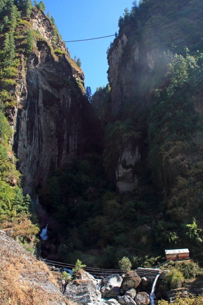 We blijven in de schaduw lopen tot daar waar de Dudh Khola zich samenvoegt met de Marsyangdi rivier en we op de Annapurna trail komen. Op de kruising bij Dharapani zit een man die zich trots door iedereen laat fotograferen. In een tuin zijn een groep mannen vlees aan het klein snijden en hakken. We zijn nu in een geheel andere wereld met veel theehuizen, restaurants en lodges. Ik had verwacht dat het op deze route veel drukker zou zijn dan wij gewend waren, vooral ook omdat we tegen de Annapurna stroom inlopen. Maar dat valt reuze mee, waarschijnlijk omdat het al vrij laat in het seizoen is. Bij de eerste de beste lodge bestellen wij koffie, en ondanks dat die van slechte kwaliteit is smaakt hij best. Links zien wij een hangbrug over een hele diepe kloof liggen, als je daar over gaat, moet je echt geen hoogtevrees hebben. We volgen de kolkende Marsyangdi rivier naar beneden, gevoed door vele watervallen, gaan nog een keer een hangbrug over en bereiken dan het einde van de Manaslu trekking, het dorpje Tal. Een klein dorp waar weinig valt te beleven.