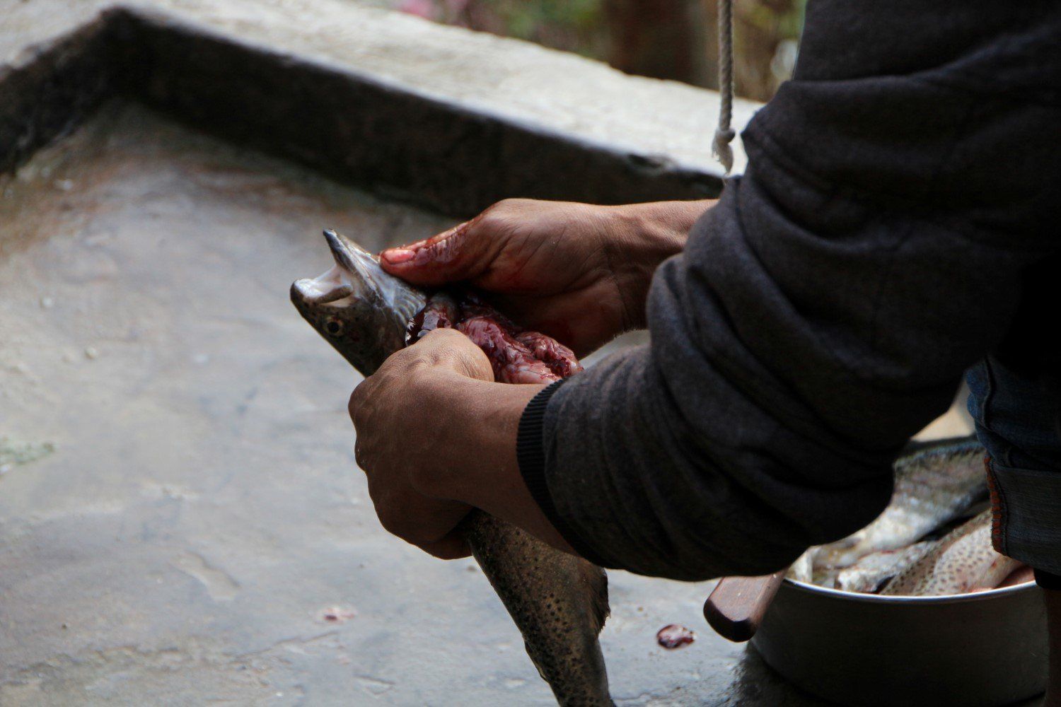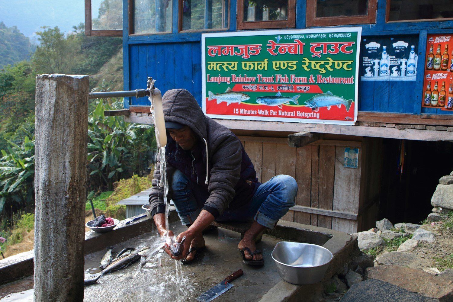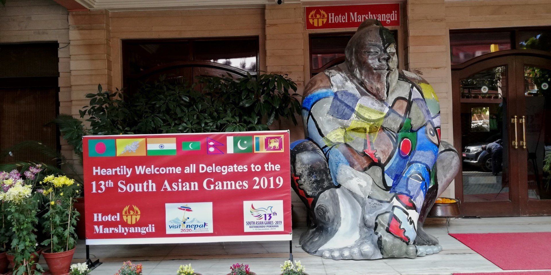 Vroeg op voor een lange reis terug naar Kathmandu. Het is nog donker als wij om 6 uur met drie jeeps vertrekken naar Besisahar. Drie uur hobbelen over een onverharde bergweg met her en der nogal wat kuilen. Onderweg stoppen wij bij een mooie waterval, waar ook een viskwekerij is. De vis wordt onder een kraan schoongemaakt. Om 9 uur zijn wij in Besisahar, waar onze bus er wel al is, maar nog niet klaar is. Ze zijn nog bezig een achterwiel te wisselen. Vanaf Besisahar is er asfalt en gaat het rijden (iets) sneller. Bij Dumre komen we op de weg die van Pokhara naar Kathmandu loopt. Bij de lunchstop maken wij snel nog een aantal groepsfoto's. De pas naar de Katkmandu vallei levert gelukkig niet al te veel vertraging, maar in Kathmandu zelf ontkomen we niet aan de file's. Het is wel weer even omschakelen aan deze drukte na 2 weken wandelen in de bergen. Even na vier uur zijn arriveren wij in het hotel. Het hotel zit vol met sporters van de South Asian Games. De boedha voor het hotel heeft daarom een ander kleurtje gekregen. Al die sporters uit verschillende landen geeft wel een leuk sfeertje in het hotel, zo wordt er fanatiek volleybal gekeken op een groot scherm en doen de voetballers van Bhutan een warming up op het piepkleine parkeerterrein van het hotel. Ook zit de Nepalese delegatie van