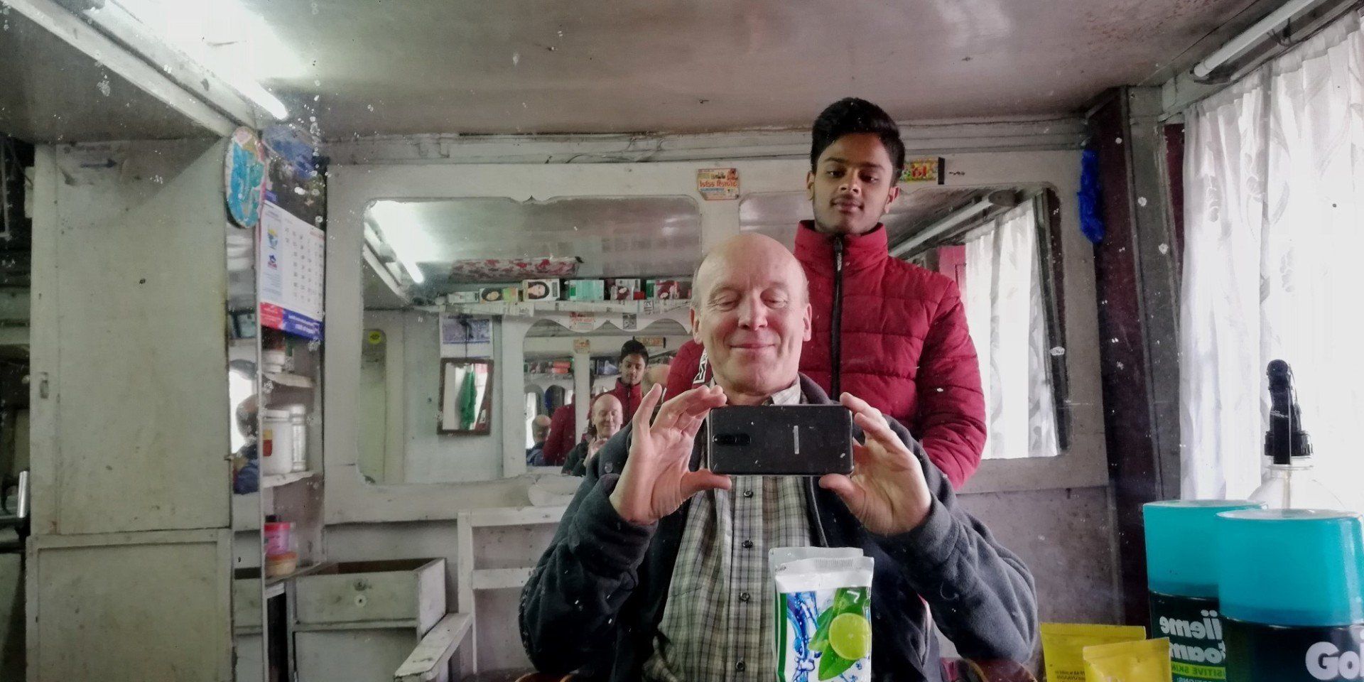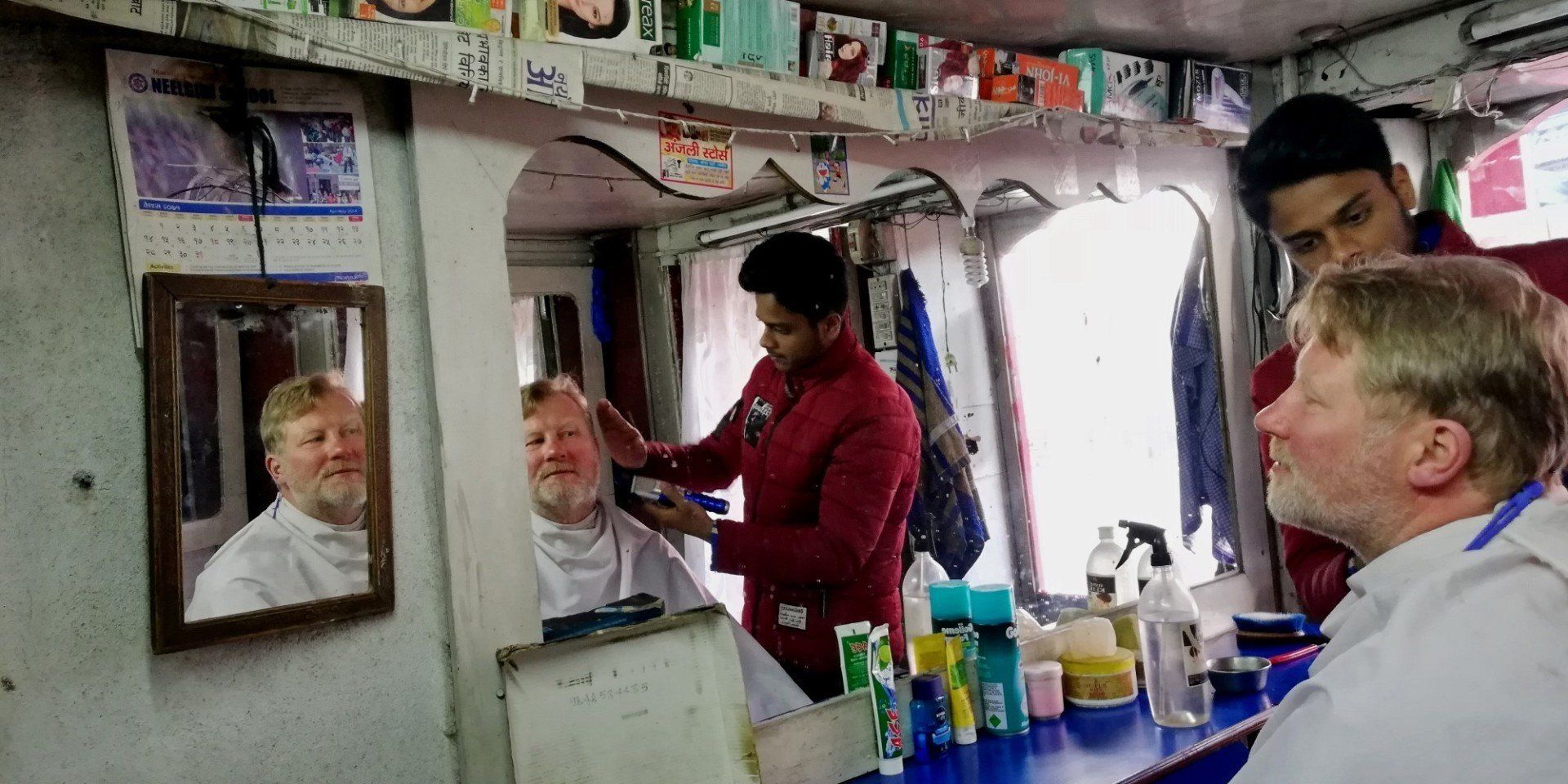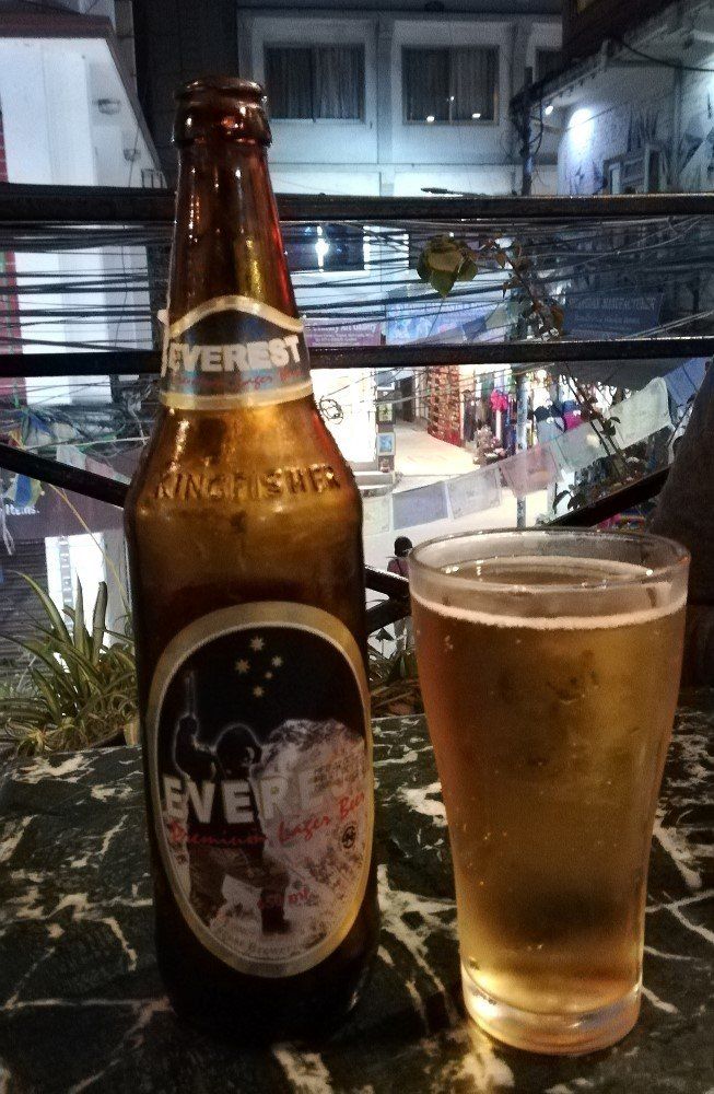 Na een uitgebreide douche beurt, trakteren wij ons zelf op een biertje en een heerlijk diner. De volgende dag laten Arno en ik ons scheren bij een kapper om de hoek, en van mijn laatste roepies koop ik een T-shirt met de slogan van deze vakantie erop: ' Dal-Bhat Power 24 hr...' In de namiddag vliegen wij terug naar Amsterdam, ik had een stoel rechts bij het raampje gereserveerd in de hoop de door de ondergaande zon verlichte Himalaya toppen te kunnen zien, maar helaas het vliegtuig had ruim een uur vertraging. Dan maar een foto van de heenreis.