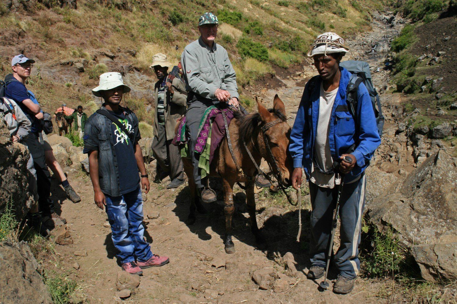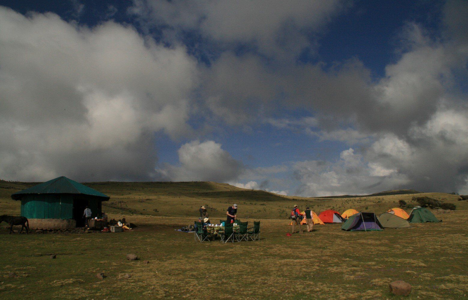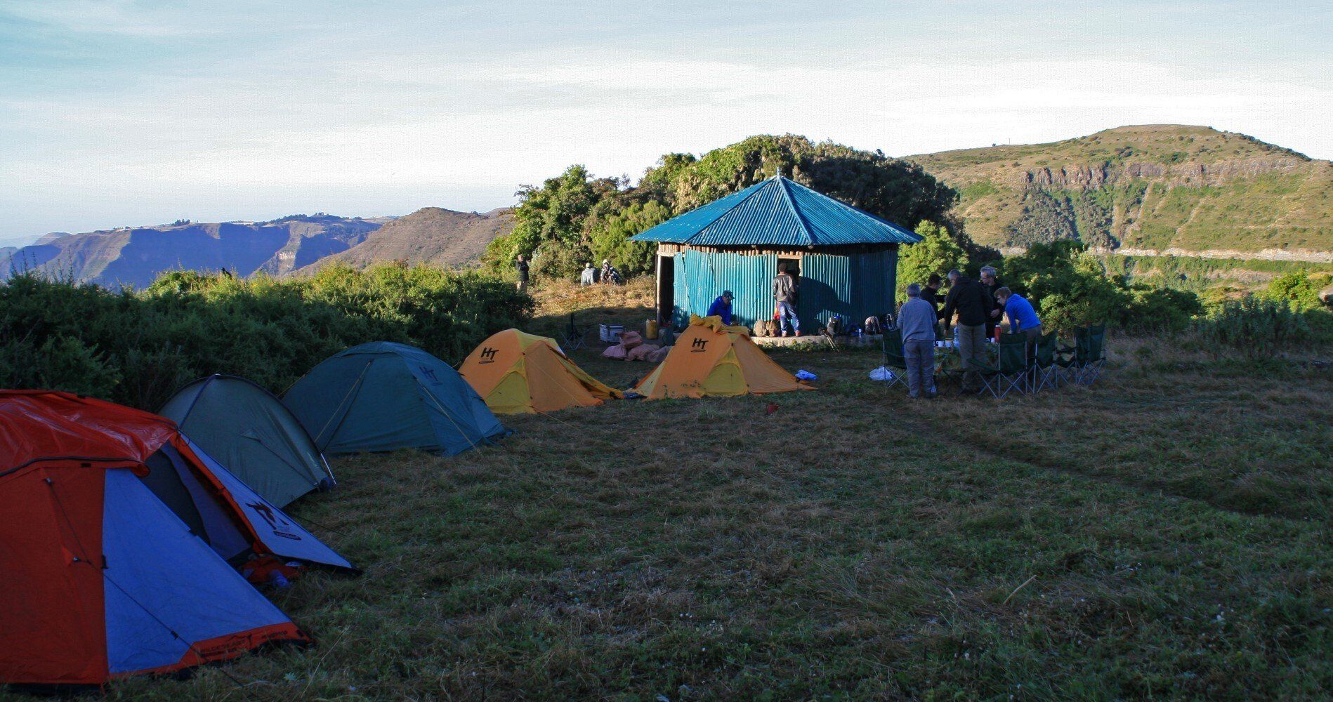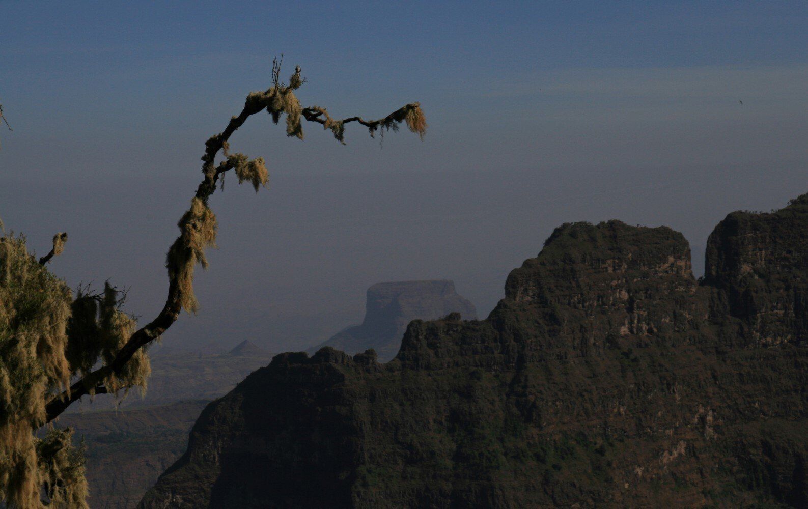Tijdens het ontbijt bereiken de eerste zonnestralen ons kamp. De muilezelmannen zitten al in het zonnetje te wachten tot wij ons kamp afbreken. We stijgen eerst langzaam over een soort plateau met allerlei mooie bloemen en de bomen behangen met lange baardmossen. Op een bepaald punt staan we op zo`n 3300 meter hoogte op de rand van de breuk in het landschap. We kunnen hier tientallen kilometers langs deze bizar gevormde rotstorens en afgronden kijken. Zelfs onze beveilgers genieten van het uitzicht. In het oosten hebben we een prachtig uitzicht op een grote waterval, waar de Jinbar rivier 500m in de afgrond duikt. De rest van de dag houden we de rand van deze breuk in zicht en soms lopen we er langs. Kurt heeft te veel last van de hoogte en wordt op een muilezel gezet, waar hij de rest van de trekking niet meer afkomt. In de middag bereiken we het idyllische dorpje Gich. In een van de hutjes krijgen wij een koffieceremonie. Terwijl mama, met haar baby op de rug, met een steen graan tot meel zit te rollen, brand oma op een houtvuur voor ons de koffiebonen. Vanaf Gich dorp is het een korte wandeling naar Gich kamp, dat spectaculair boven het dorp uitsteekt. We zijn op een plateau aangeland met de typische afro-alpiene vegetatie en een prachtig uitzicht, en de zonsondergang maakt het alleen maar mooier. Het wordt hier een koude nacht met temperaturen onder nul.
