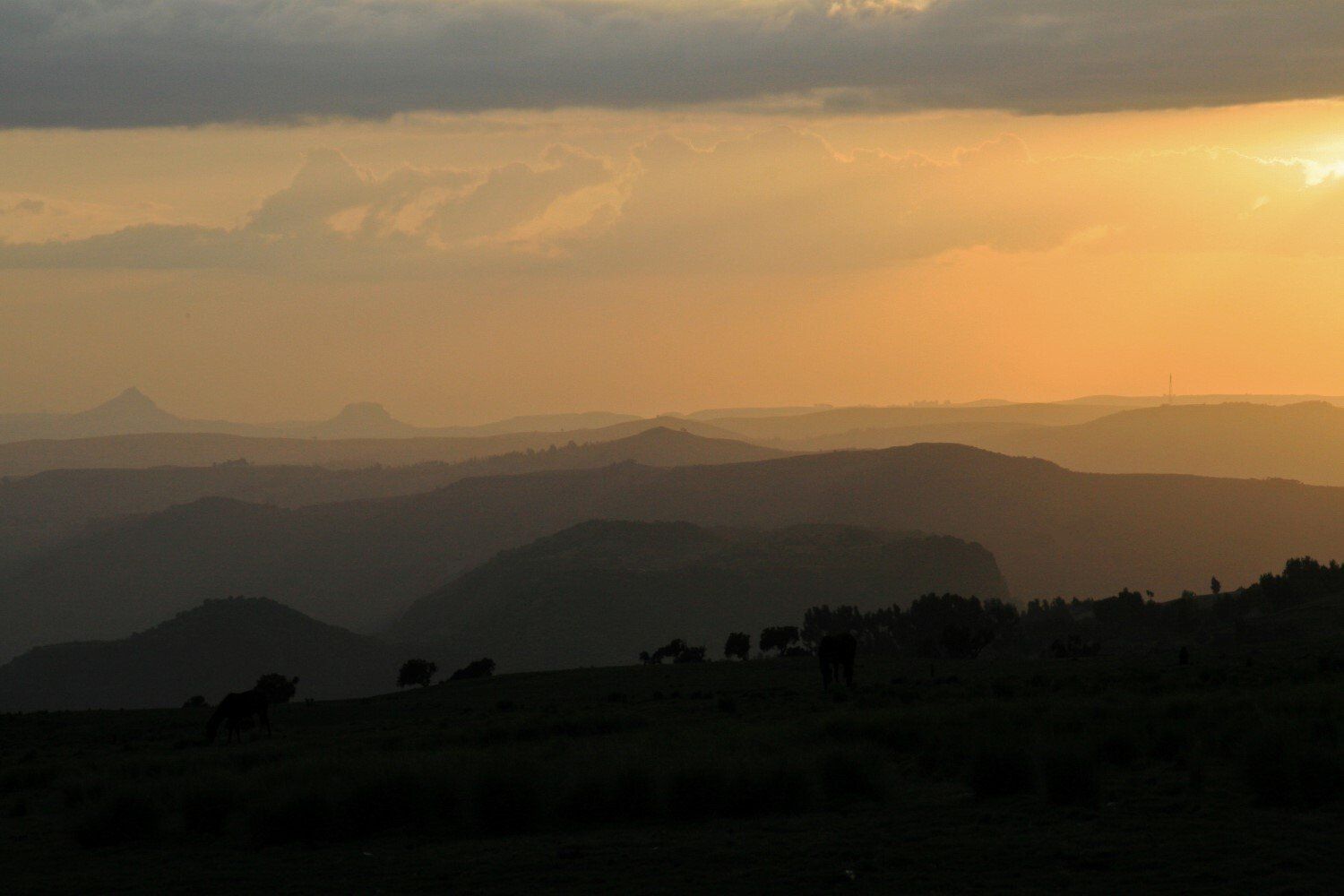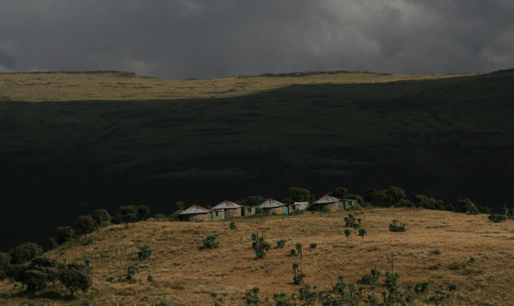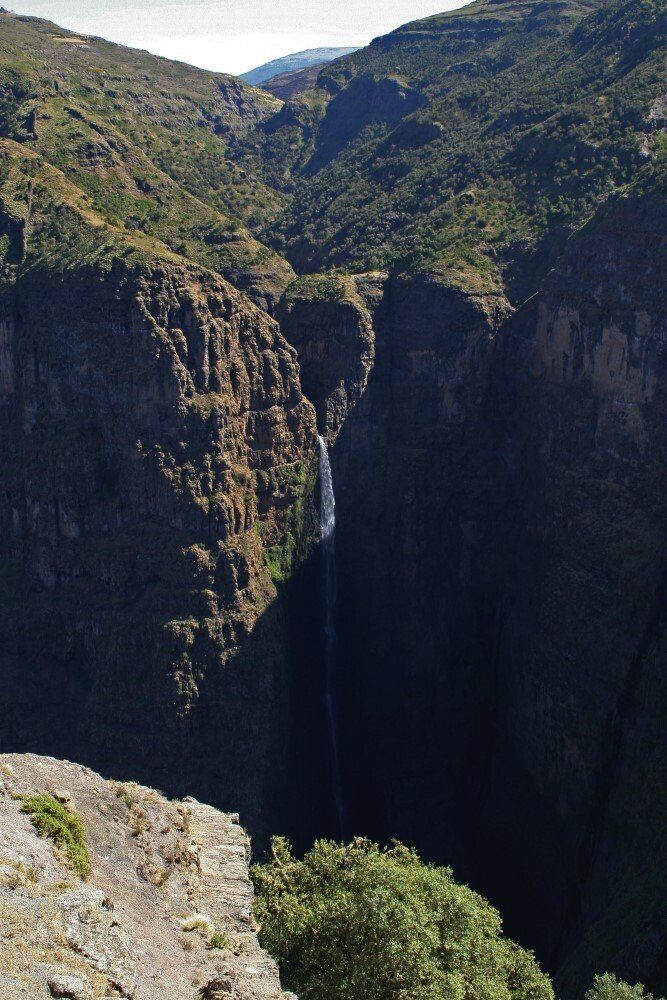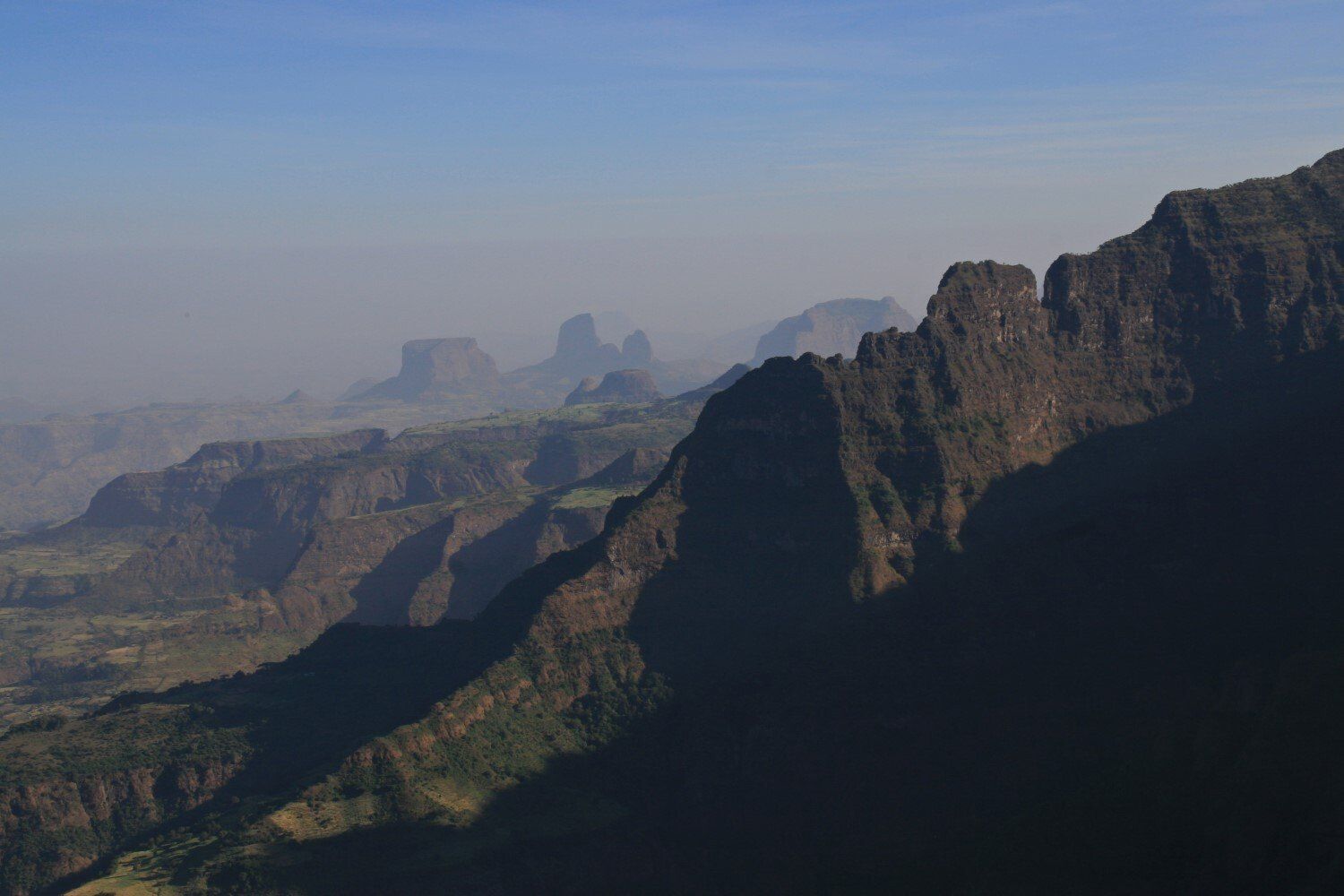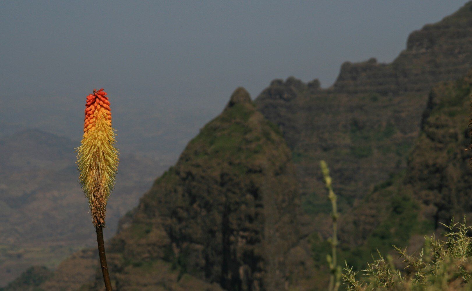 Tijdens het ontbijt bereiken de eerste zonnestralen ons kamp. De muilezelmannen zitten al in het zonnetje te wachten tot wij ons kamp afbreken. We stijgen eerst langzaam over een soort plateau met allerlei mooie bloemen en de bomen behangen met lange baardmossen. Op een bepaald punt staan we op zo`n 3300 meter hoogte op de rand van de breuk in het landschap. We kunnen hier tientallen kilometers langs deze bizar gevormde rotstorens en afgronden kijken. Zelfs onze beveilgers genieten van het uitzicht. In het oosten hebben we een prachtig uitzicht op een grote waterval, waar de Jinbar rivier 500m in de afgrond duikt. De rest van de dag houden we de rand van deze breuk in zicht en soms lopen we er langs. Kurt heeft te veel last van de hoogte en wordt op een muilezel gezet, waar hij de rest van de trekking niet meer afkomt. In de middag bereiken we het idyllische dorpje Gich. In een van de hutjes krijgen wij een koffieceremonie. Terwijl mama, met haar baby op de rug, met een steen graan tot meel zit te rollen, brand oma op een houtvuur voor ons de koffiebonen. Vanaf Gich dorp is het een korte wandeling naar Gich kamp, dat spectaculair boven het dorp uitsteekt. We zijn op een plateau aangeland met de typische afro-alpiene vegetatie en een prachtig uitzicht, en de zonsondergang maakt het alleen maar mooier. Het wordt hier een koude nacht met temperaturen onder nul.