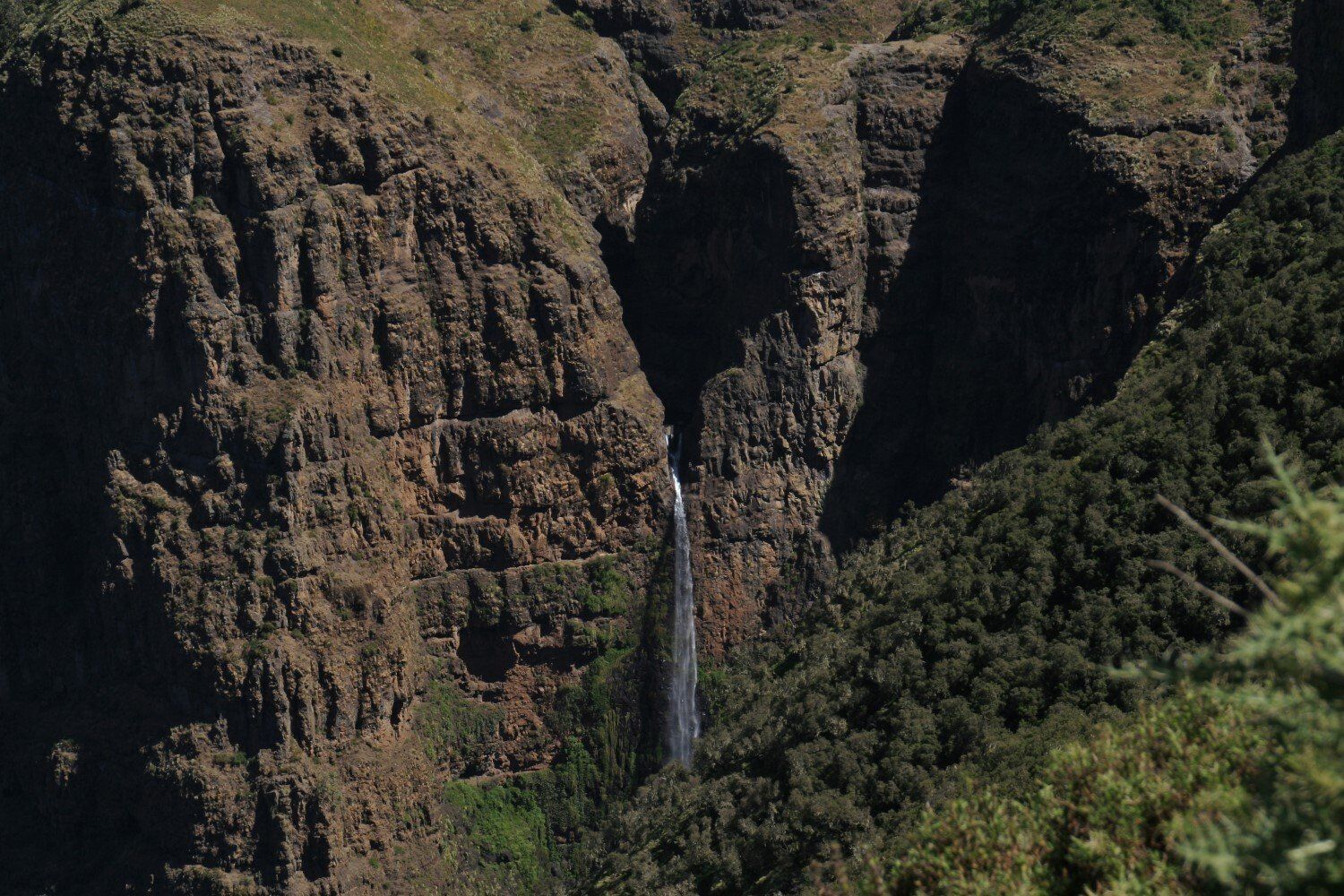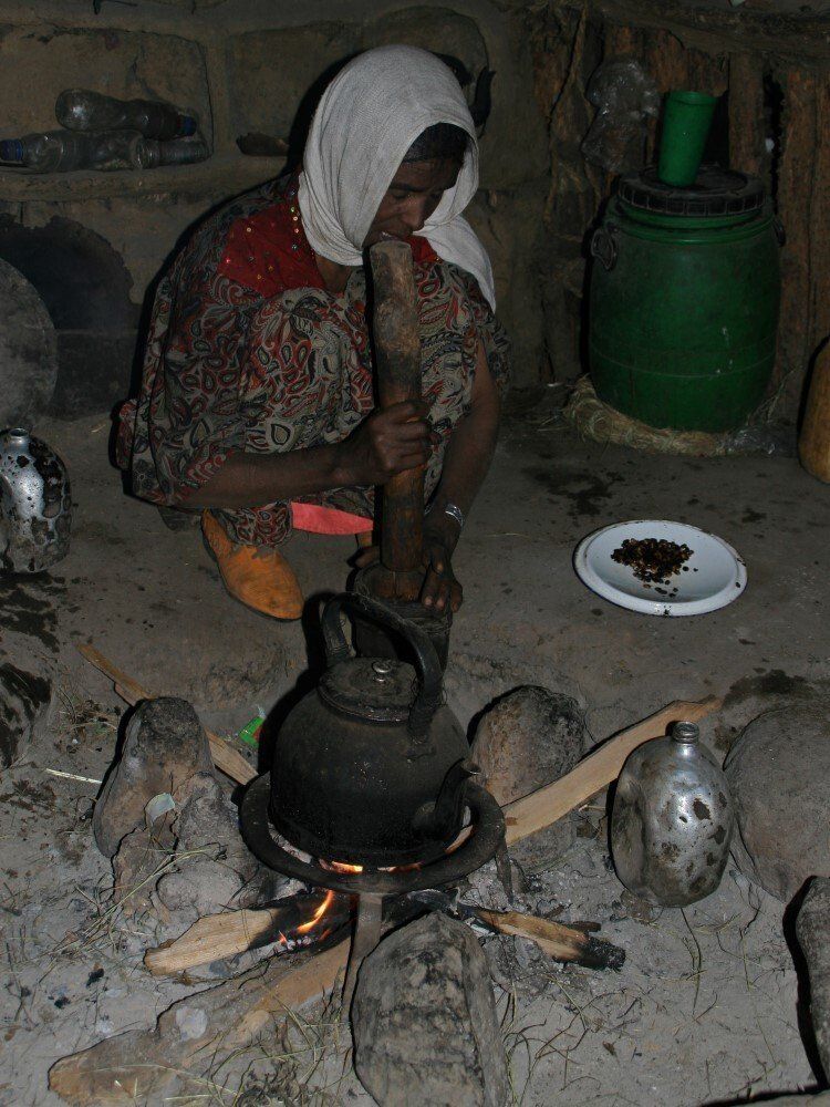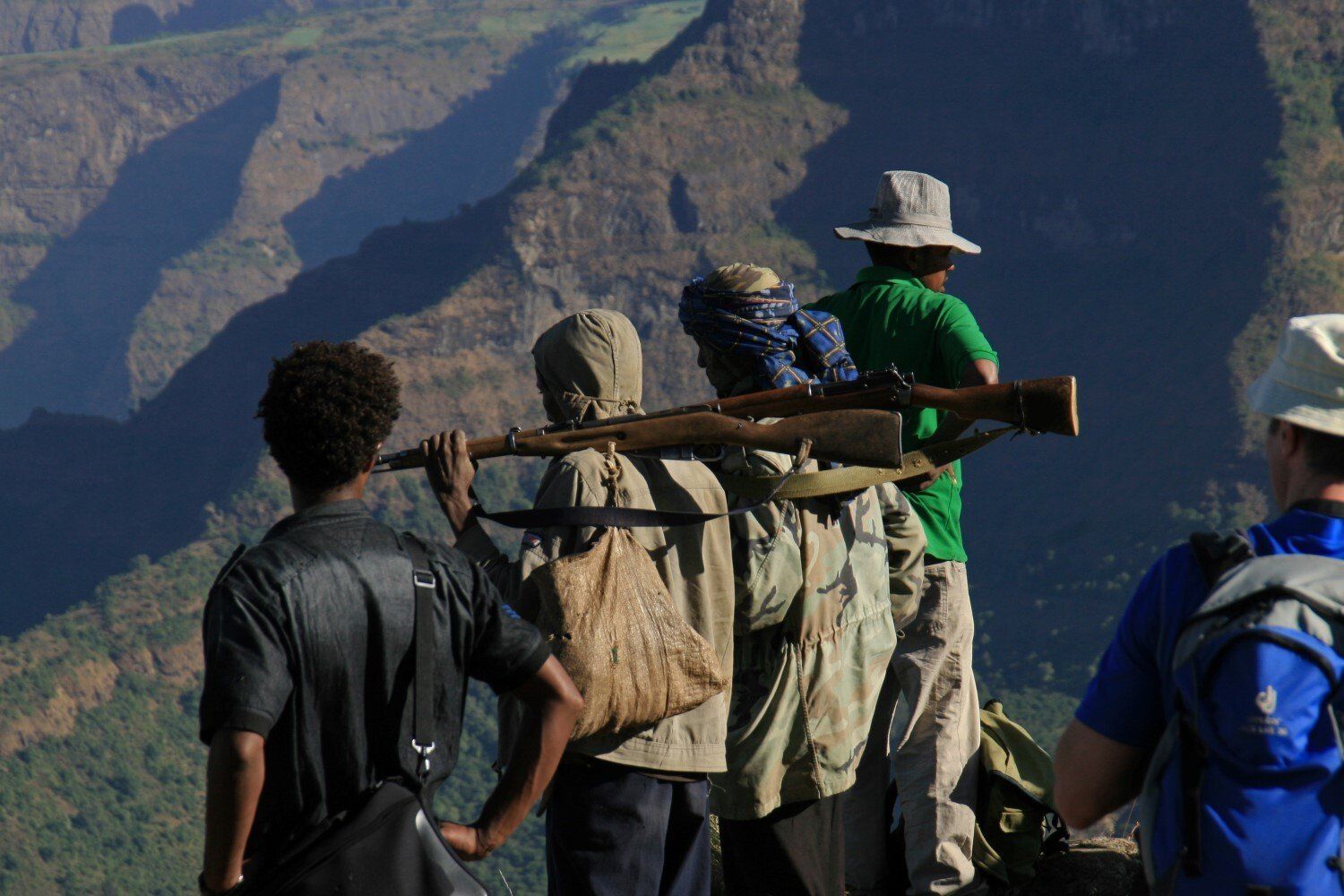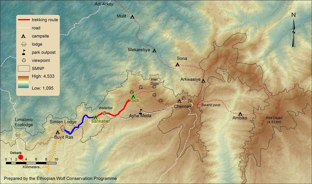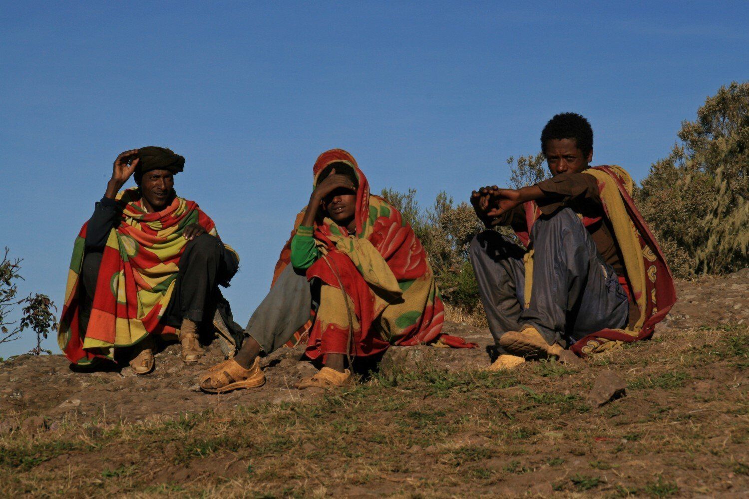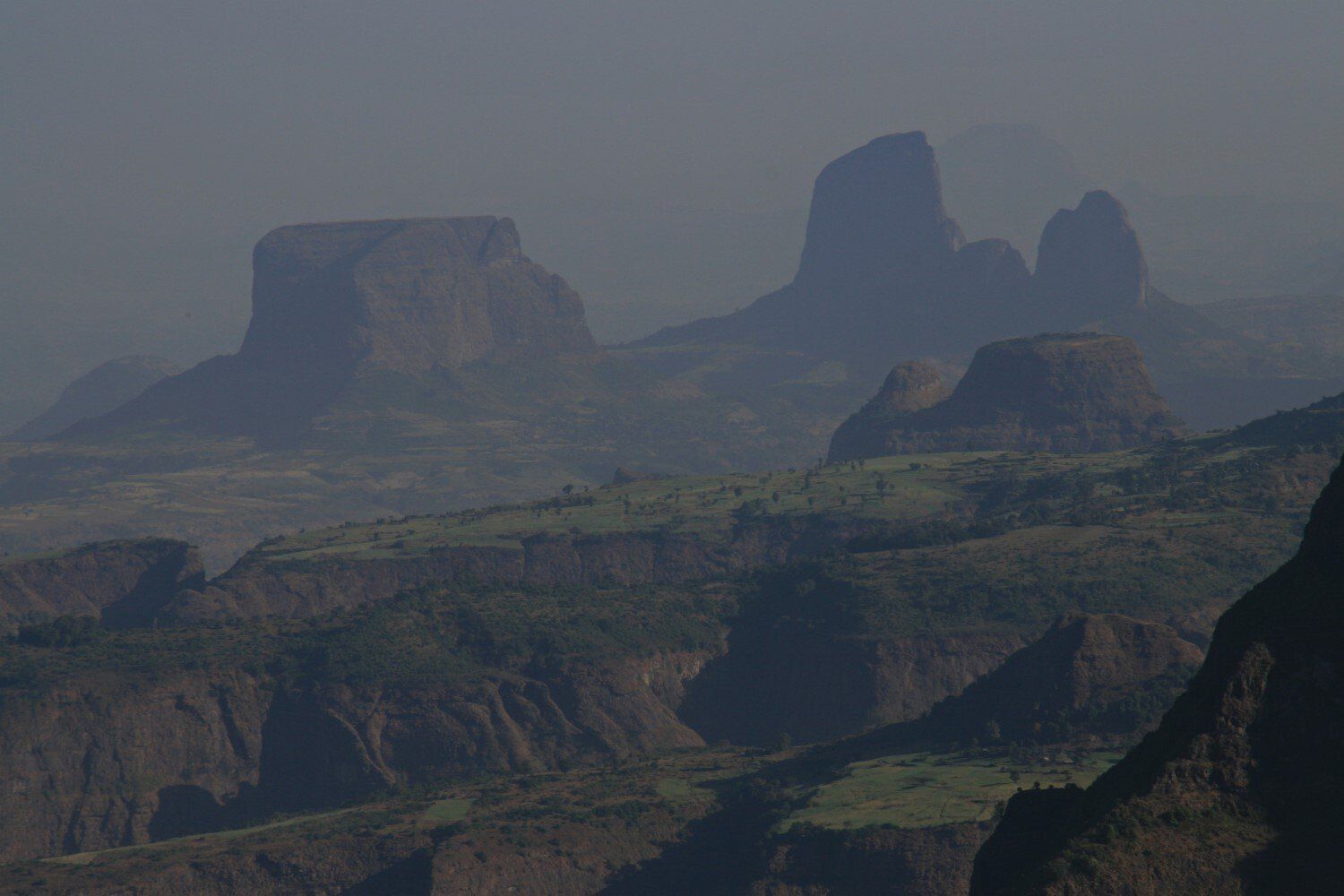 Tijdens het ontbijt bereiken de eerste zonnestralen ons kamp. De muilezelmannen zitten al in het zonnetje te wachten tot wij ons kamp afbreken. We stijgen eerst langzaam over een soort plateau met allerlei mooie bloemen en de bomen behangen met lange baardmossen. Op een bepaald punt staan we op zo`n 3300 meter hoogte op de rand van de breuk in het landschap. We kunnen hier tientallen kilometers langs deze bizar gevormde rotstorens en afgronden kijken. Zelfs onze beveilgers genieten van het uitzicht. In het oosten hebben we een prachtig uitzicht op een grote waterval, waar de Jinbar rivier 500m in de afgrond duikt. De rest van de dag houden we de rand van deze breuk in zicht en soms lopen we er langs. Kurt heeft te veel last van de hoogte en wordt op een muilezel gezet, waar hij de rest van de trekking niet meer afkomt. In de middag bereiken we het idyllische dorpje Gich. In een van de hutjes krijgen wij een koffieceremonie. Terwijl mama, met haar baby op de rug, met een steen graan tot meel zit te rollen, brand oma op een houtvuur voor ons de koffiebonen. Vanaf Gich dorp is het een korte wandeling naar Gich kamp, dat spectaculair boven het dorp uitsteekt. We zijn op een plateau aangeland met de typische afro-alpiene vegetatie en een prachtig uitzicht, en de zonsondergang maakt het alleen maar mooier. Het wordt hier een koude nacht met temperaturen onder nul.