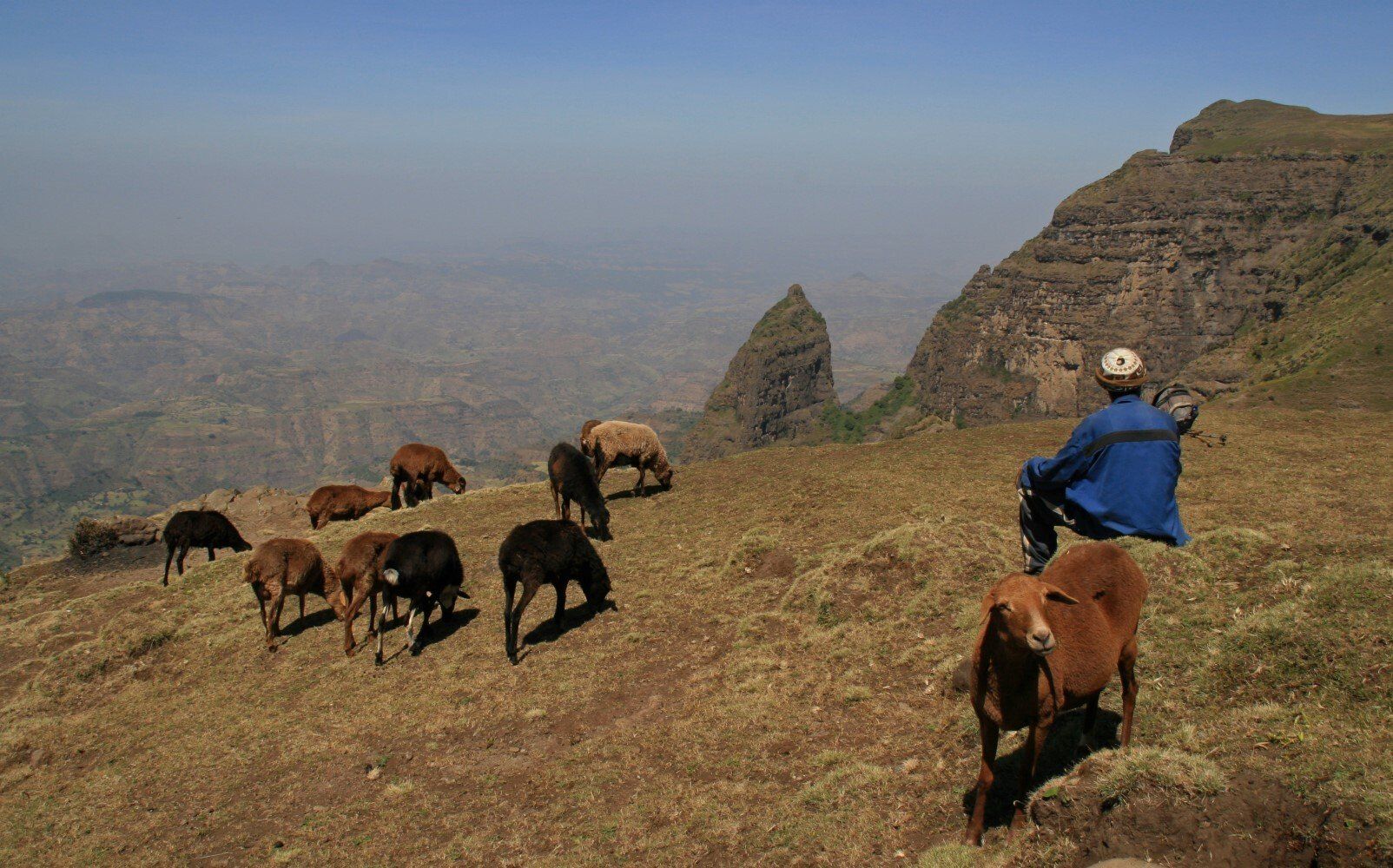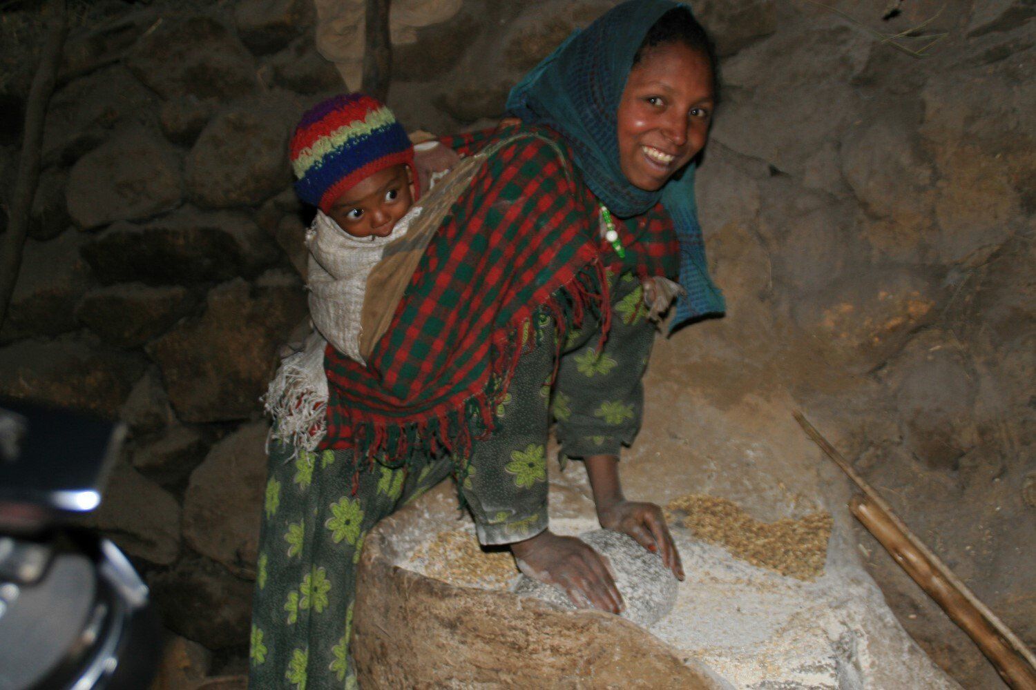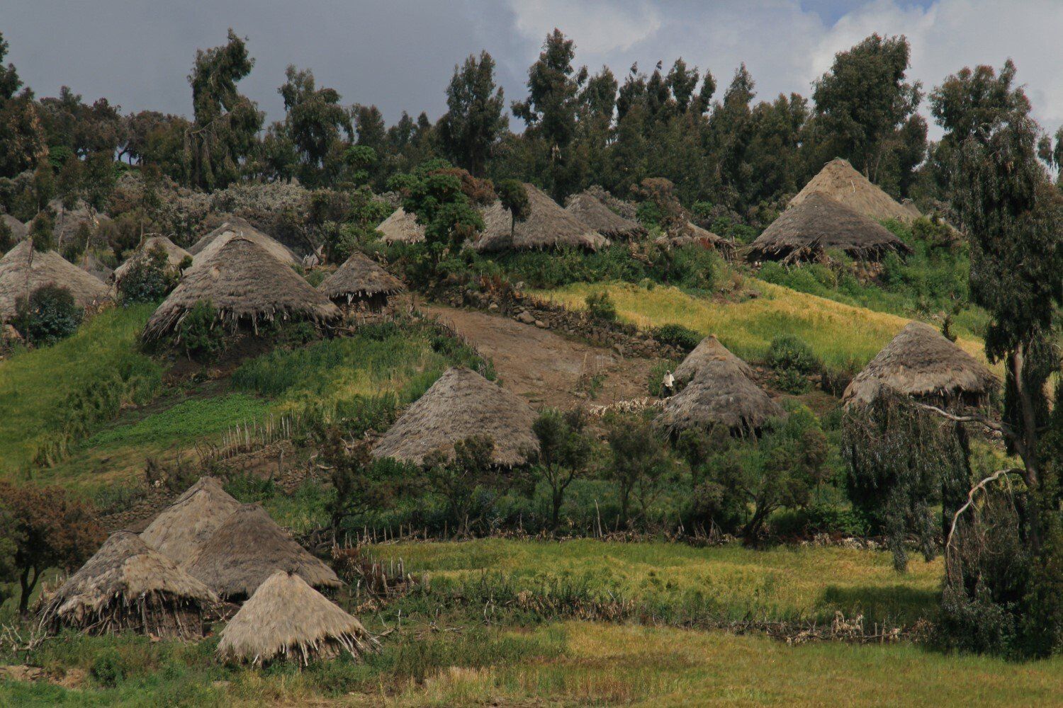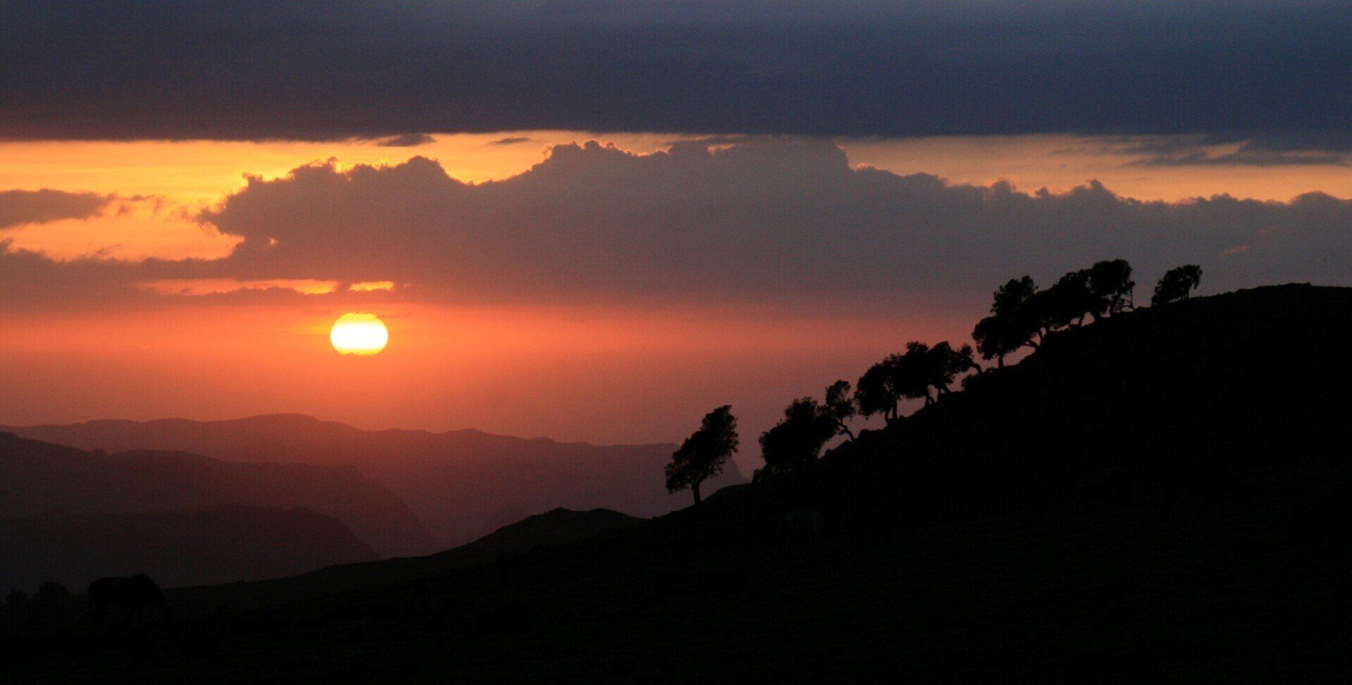 Tijdens het ontbijt bereiken de eerste zonnestralen ons kamp. De muilezelmannen zitten al in het zonnetje te wachten tot wij ons kamp afbreken. We stijgen eerst langzaam over een soort plateau met allerlei mooie bloemen en de bomen behangen met lange baardmossen. Op een bepaald punt staan we op zo`n 3300 meter hoogte op de rand van de breuk in het landschap. We kunnen hier tientallen kilometers langs deze bizar gevormde rotstorens en afgronden kijken. Zelfs onze beveilgers genieten van het uitzicht. In het oosten hebben we een prachtig uitzicht op een grote waterval, waar de Jinbar rivier 500m in de afgrond duikt. De rest van de dag houden we de rand van deze breuk in zicht en soms lopen we er langs. Kurt heeft te veel last van de hoogte en wordt op een muilezel gezet, waar hij de rest van de trekking niet meer afkomt. In de middag bereiken we het idyllische dorpje Gich. In een van de hutjes krijgen wij een koffieceremonie. Terwijl mama, met haar baby op de rug, met een steen graan tot meel zit te rollen, brand oma op een houtvuur voor ons de koffiebonen. Vanaf Gich dorp is het een korte wandeling naar Gich kamp, dat spectaculair boven het dorp uitsteekt. We zijn op een plateau aangeland met de typische afro-alpiene vegetatie en een prachtig uitzicht, en de zonsondergang maakt het alleen maar mooier. Het wordt hier een koude nacht met temperaturen onder nul.