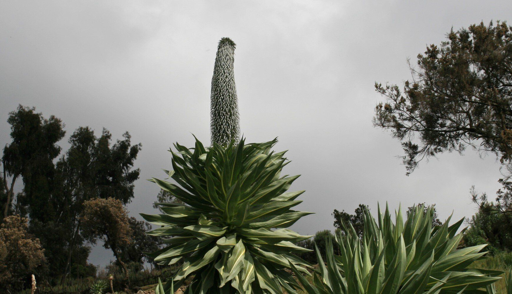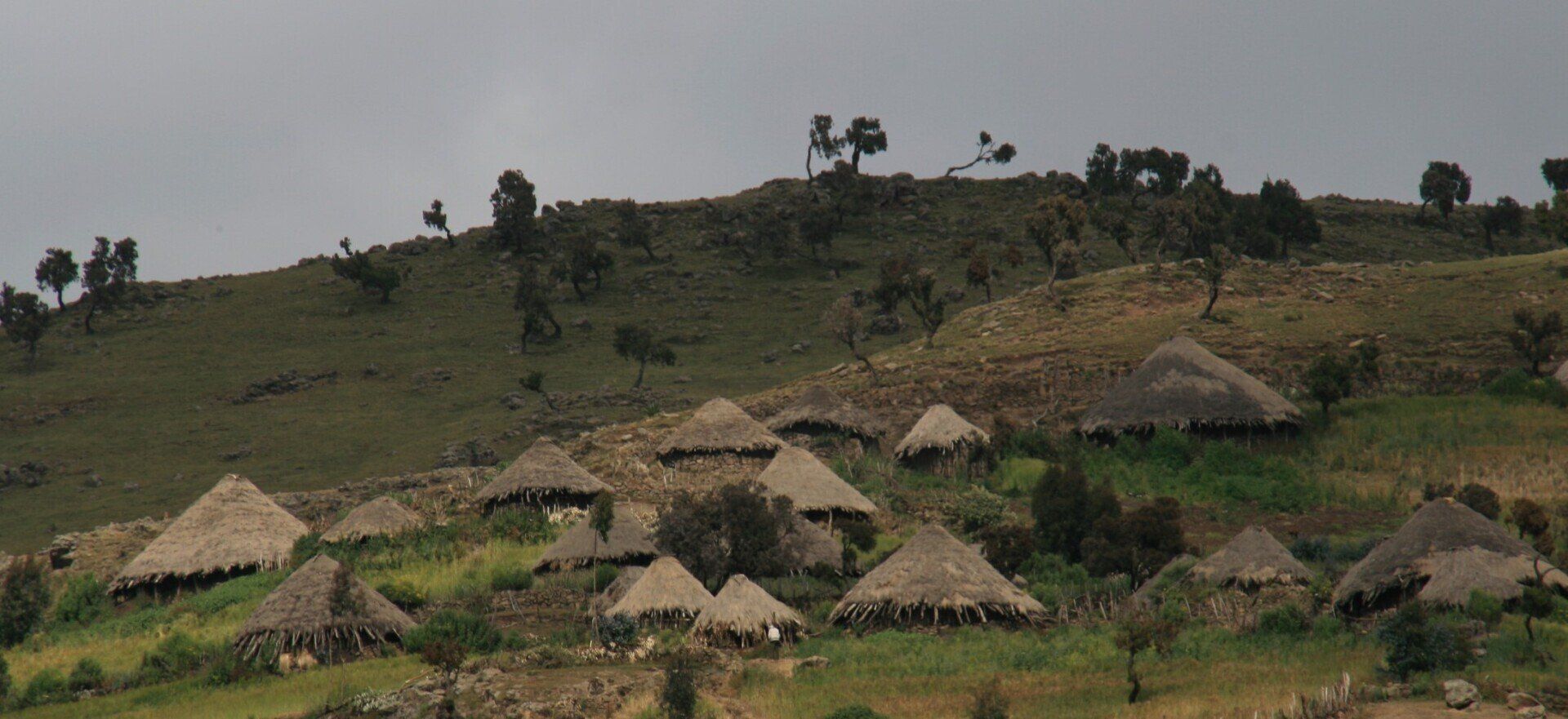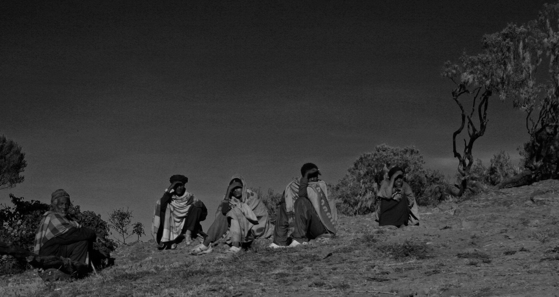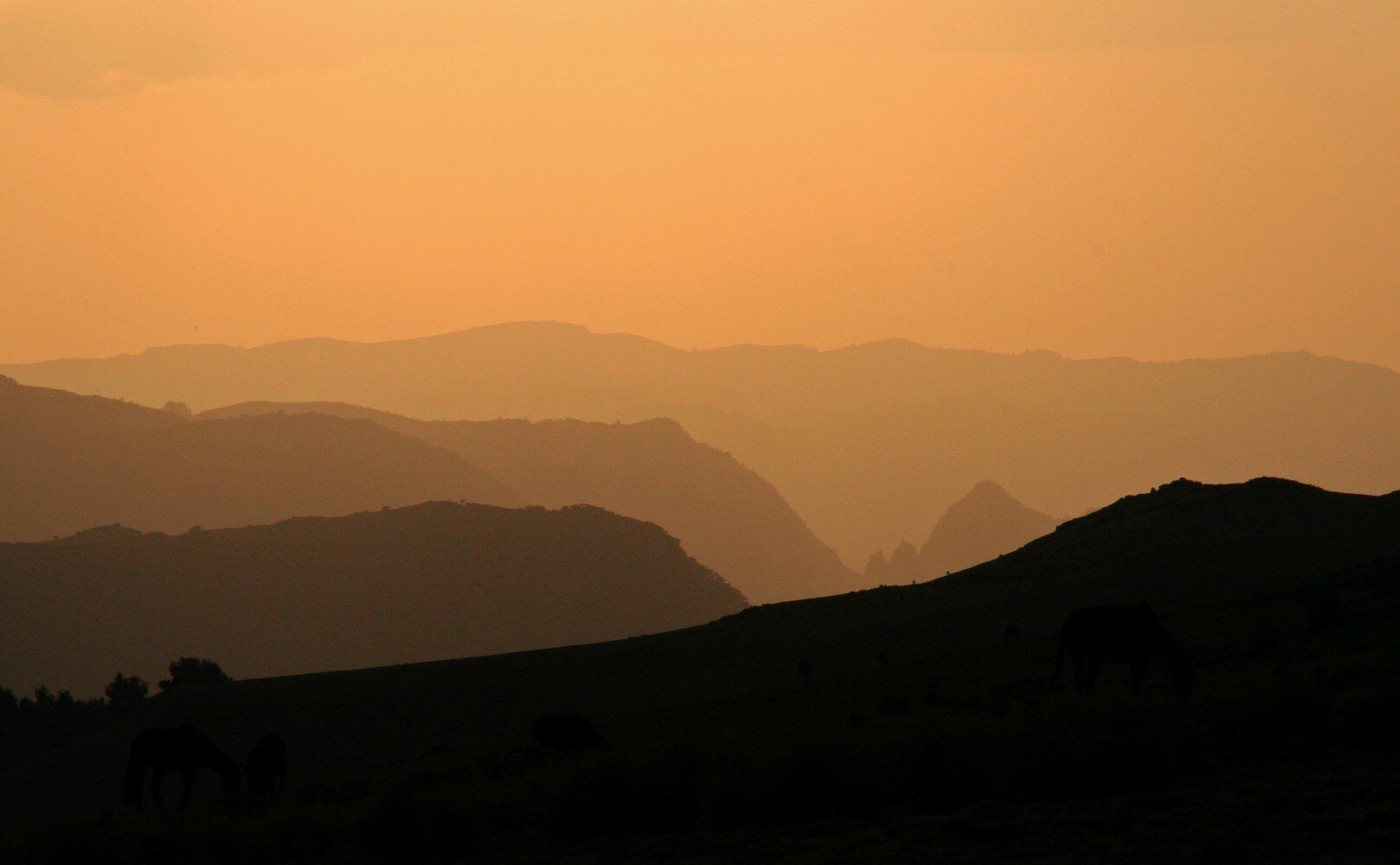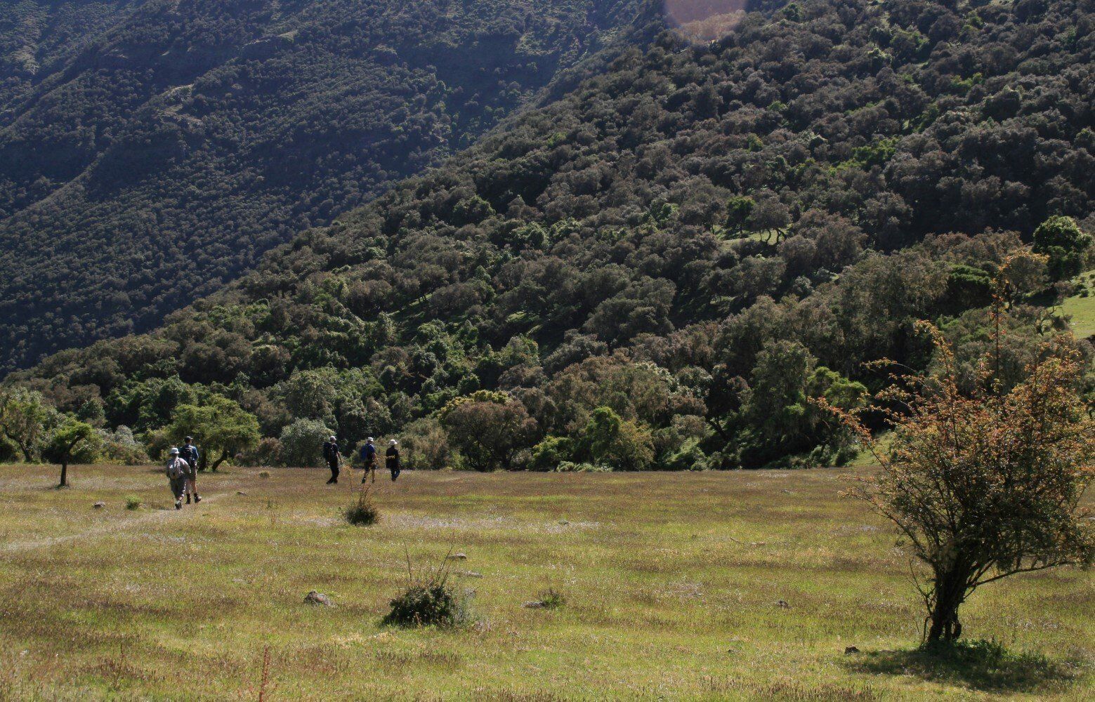 Tijdens het ontbijt bereiken de eerste zonnestralen ons kamp. De muilezelmannen zitten al in het zonnetje te wachten tot wij ons kamp afbreken. We stijgen eerst langzaam over een soort plateau met allerlei mooie bloemen en de bomen behangen met lange baardmossen. Op een bepaald punt staan we op zo`n 3300 meter hoogte op de rand van de breuk in het landschap. We kunnen hier tientallen kilometers langs deze bizar gevormde rotstorens en afgronden kijken. Zelfs onze beveilgers genieten van het uitzicht. In het oosten hebben we een prachtig uitzicht op een grote waterval, waar de Jinbar rivier 500m in de afgrond duikt. De rest van de dag houden we de rand van deze breuk in zicht en soms lopen we er langs. Kurt heeft te veel last van de hoogte en wordt op een muilezel gezet, waar hij de rest van de trekking niet meer afkomt. In de middag bereiken we het idyllische dorpje Gich. In een van de hutjes krijgen wij een koffieceremonie. Terwijl mama, met haar baby op de rug, met een steen graan tot meel zit te rollen, brand oma op een houtvuur voor ons de koffiebonen. Vanaf Gich dorp is het een korte wandeling naar Gich kamp, dat spectaculair boven het dorp uitsteekt. We zijn op een plateau aangeland met de typische afro-alpiene vegetatie en een prachtig uitzicht, en de zonsondergang maakt het alleen maar mooier. Het wordt hier een koude nacht met temperaturen onder nul.