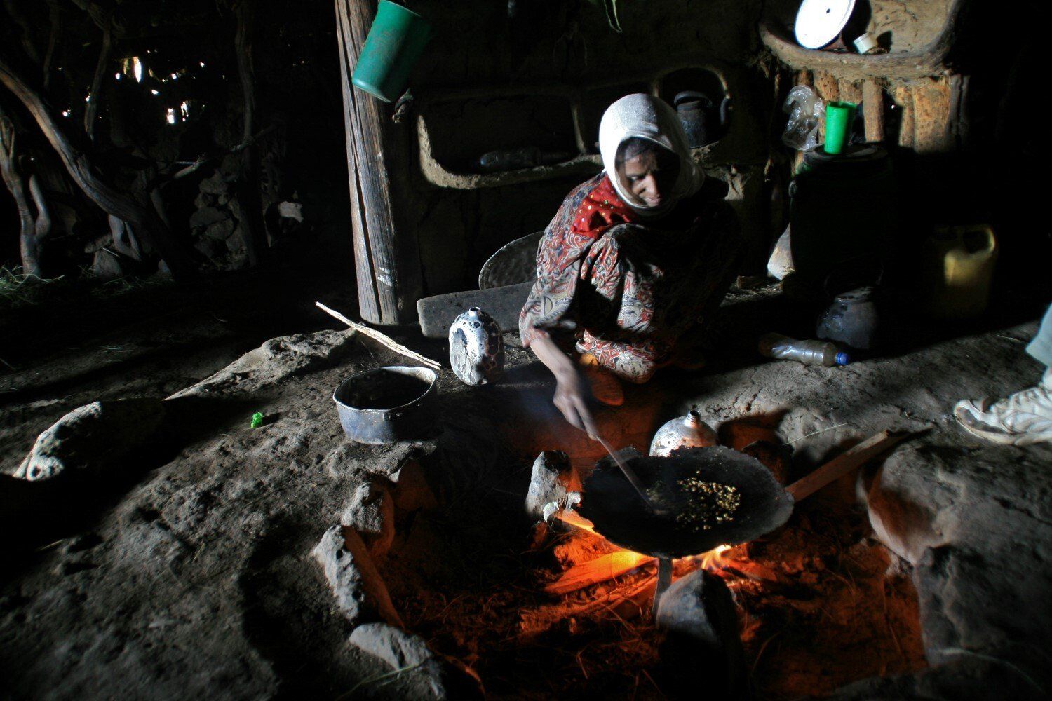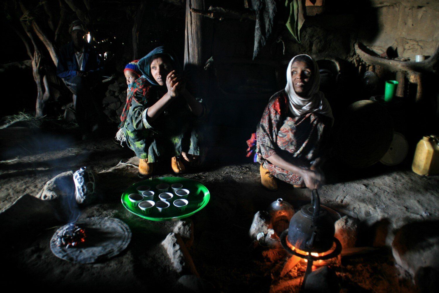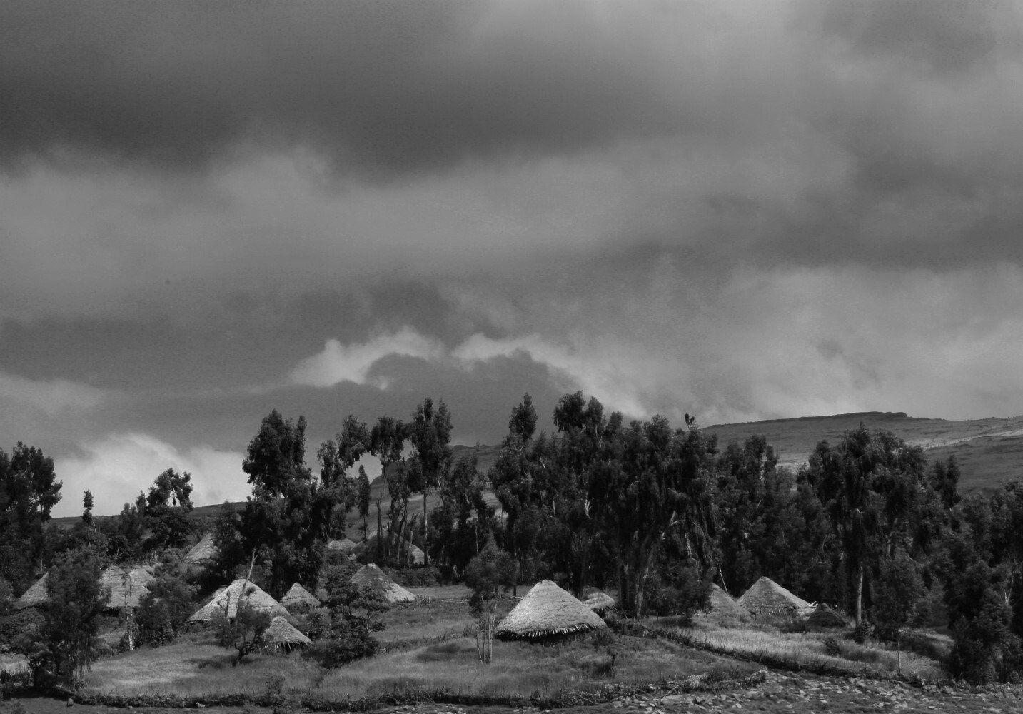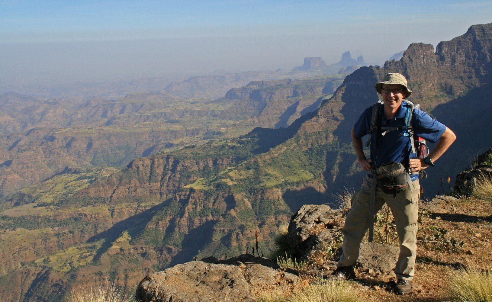 Tijdens het ontbijt bereiken de eerste zonnestralen ons kamp. De muilezelmannen zitten al in het zonnetje te wachten tot wij ons kamp afbreken. We stijgen eerst langzaam over een soort plateau met allerlei mooie bloemen en de bomen behangen met lange baardmossen. Op een bepaald punt staan we op zo`n 3300 meter hoogte op de rand van de breuk in het landschap. We kunnen hier tientallen kilometers langs deze bizar gevormde rotstorens en afgronden kijken. Zelfs onze beveilgers genieten van het uitzicht. In het oosten hebben we een prachtig uitzicht op een grote waterval, waar de Jinbar rivier 500m in de afgrond duikt. De rest van de dag houden we de rand van deze breuk in zicht en soms lopen we er langs. Kurt heeft te veel last van de hoogte en wordt op een muilezel gezet, waar hij de rest van de trekking niet meer afkomt. In de middag bereiken we het idyllische dorpje Gich. In een van de hutjes krijgen wij een koffieceremonie. Terwijl mama, met haar baby op de rug, met een steen graan tot meel zit te rollen, brand oma op een houtvuur voor ons de koffiebonen. Vanaf Gich dorp is het een korte wandeling naar Gich kamp, dat spectaculair boven het dorp uitsteekt. We zijn op een plateau aangeland met de typische afro-alpiene vegetatie en een prachtig uitzicht, en de zonsondergang maakt het alleen maar mooier. Het wordt hier een koude nacht met temperaturen onder nul.