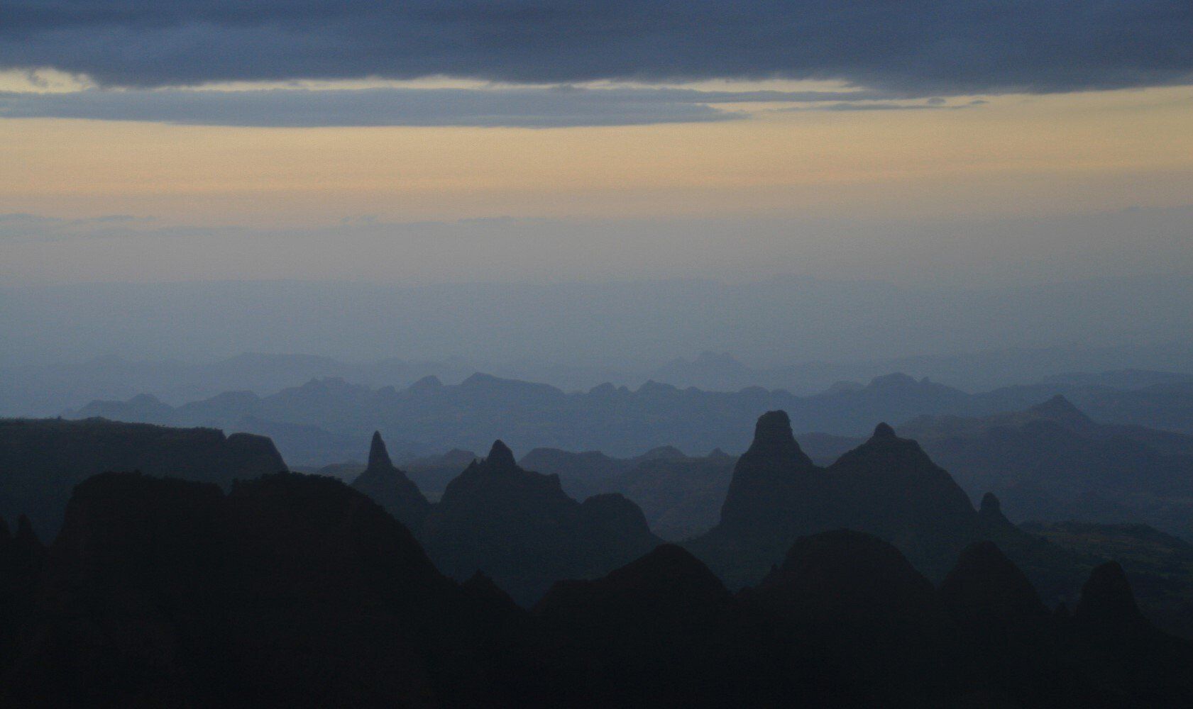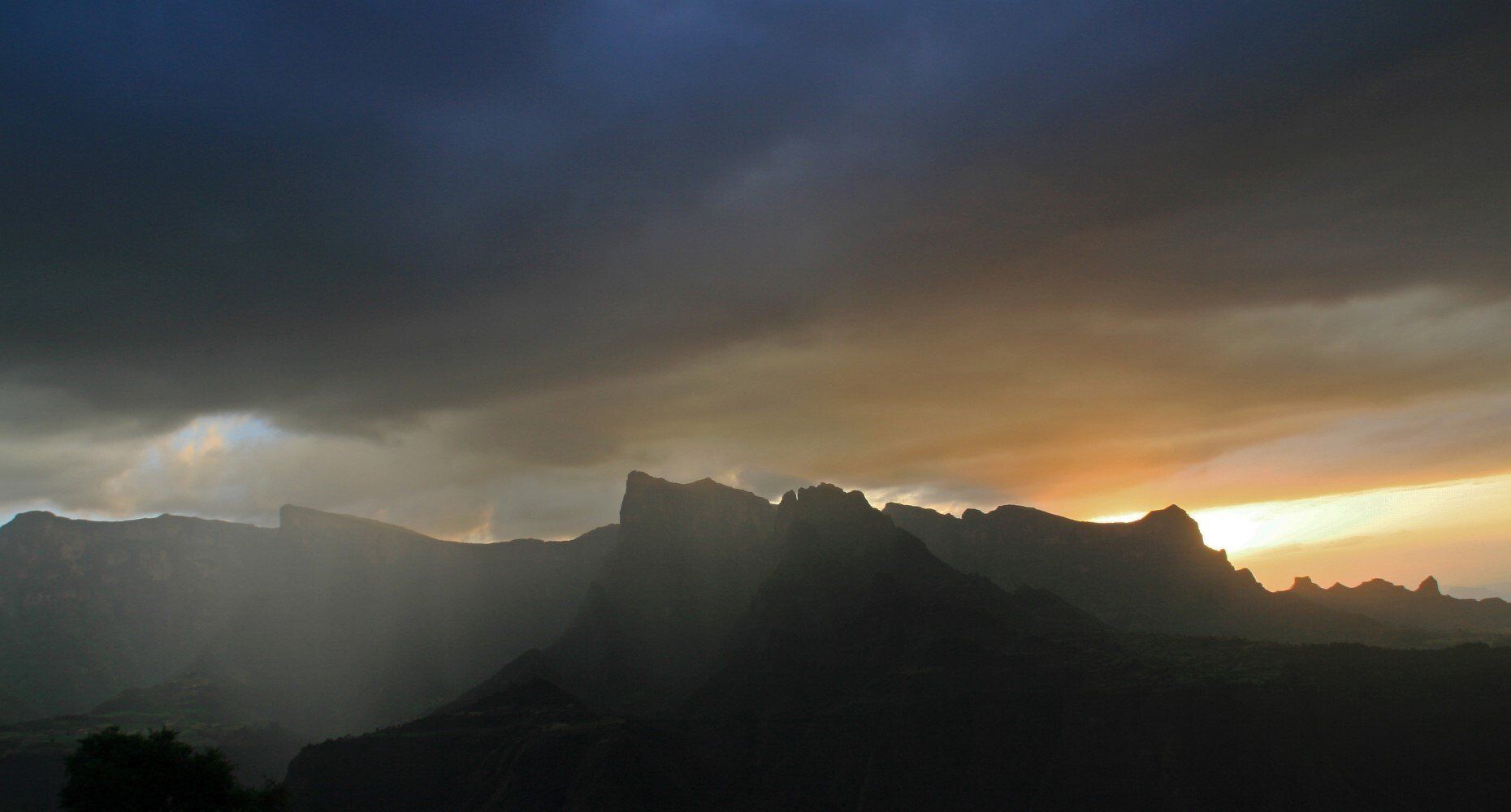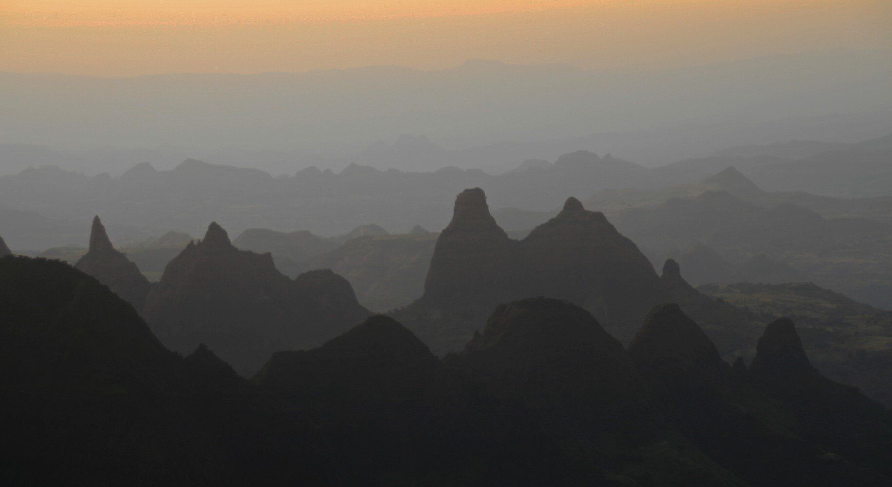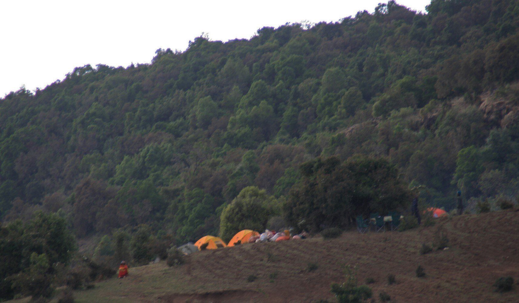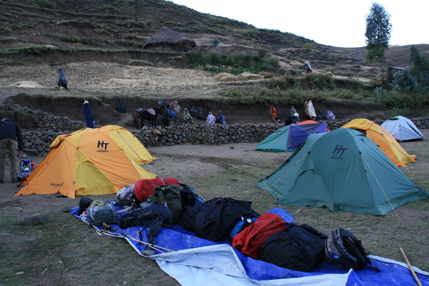 In de namiddag bereiken we het dorp Arkwazye. Het hele dorp is uit het nationaal park hier naar toe verplaatst, rijen hutjes met golfplaten daken. Het ziet er niet zo fraai uit als de oorspronkelijke hutten die we onderweg gezien hebben. Het is echter marktdag, tegen de heuvel proberen de marktkoopmannen hun waar aan de vele mensen te verkopen. Helaas hebben wij geen tijd om de markt te bezoeken want het is nog een stuk naar onze kampplaats. Gezamelijk met de marktbezoekers lopen we richting Sona. Het laatste stuk dalen doen we in een hoog tempo, we bereiken onze kampplaats voorbij Sona net voor de avondschemering. Op tijd om te kunnen genieten van de zonsondergang met het prachtige uitzicht op het eerste deel van de tocht.