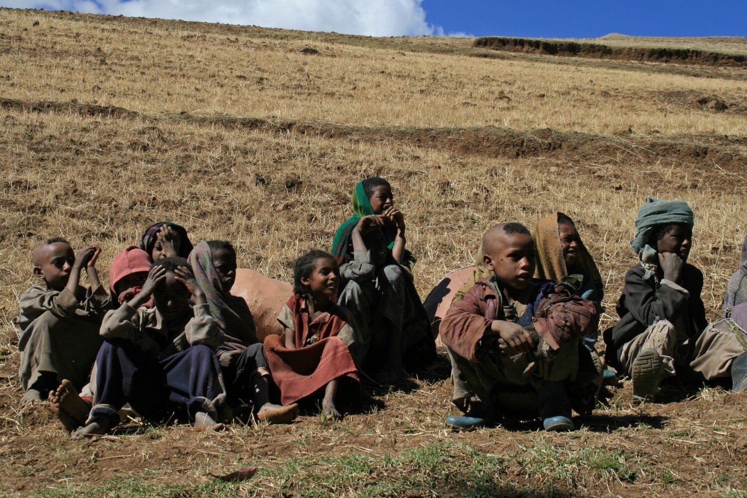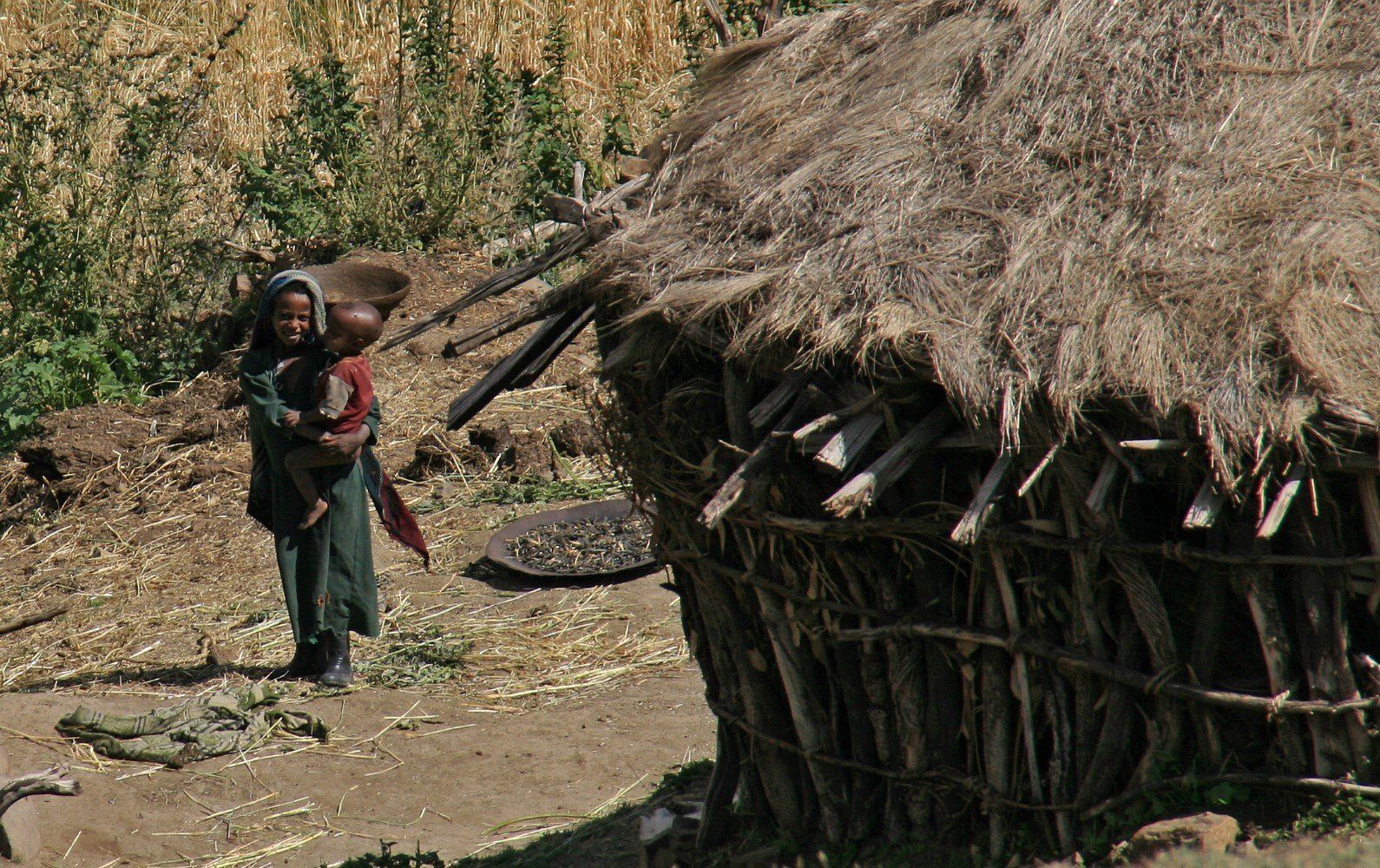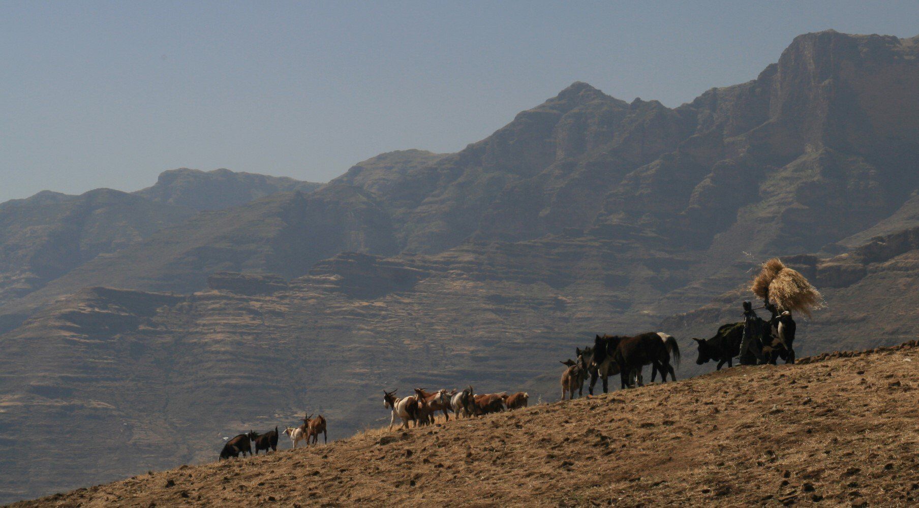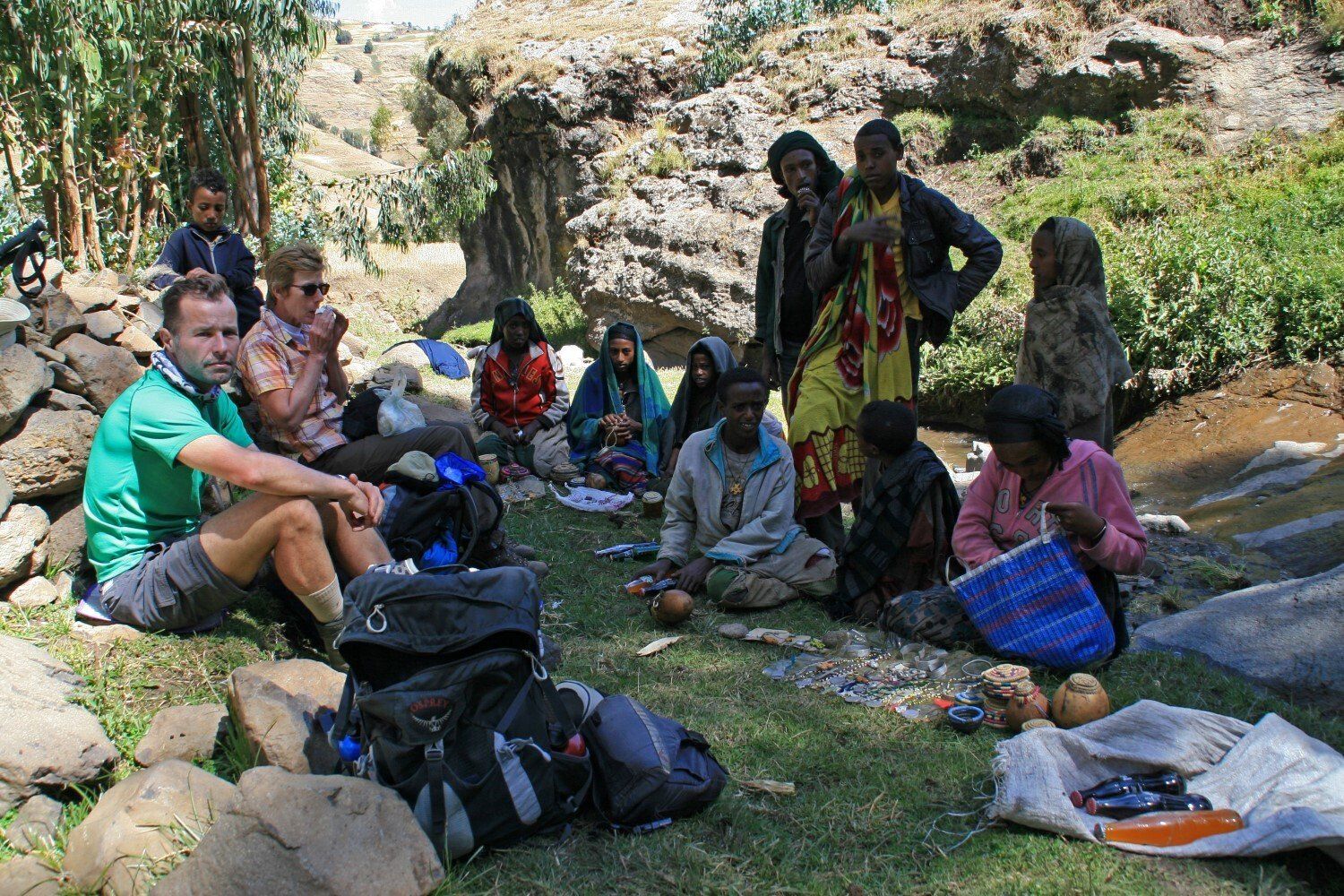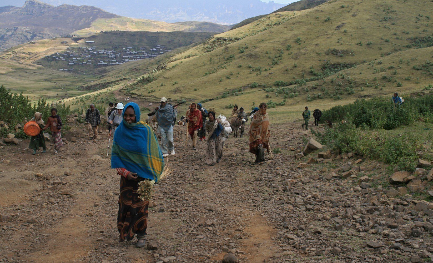 De dorpelingen kijken geïnteresseerd toe hoe wij al vroeg ons kamp opbreken. Het wordt een lange mooie dag, vanuit Ambiko wandelen we in 9 uur naar beneden in de Meseha rivier en via het Arkwazye dorp naar Sona. De hele dag wandelen we door glooiende graan en teff velden en vinden we bloeiende cactussen op ons weg. Hier en daar een hutje of boerderij op een heuvelrug. Het is warm, en elke keer als we uitpuffen krijgen we gezelschap van kinderen. En het is ongelooflijk in wat voor vodden de kinderen rondlopen. We passeren een boer die zijn vee naar het grasland brengt. Bij meerdere rust pauzes proberen plaatselijke bewoners handgemaakte souvenirs te verkopen.