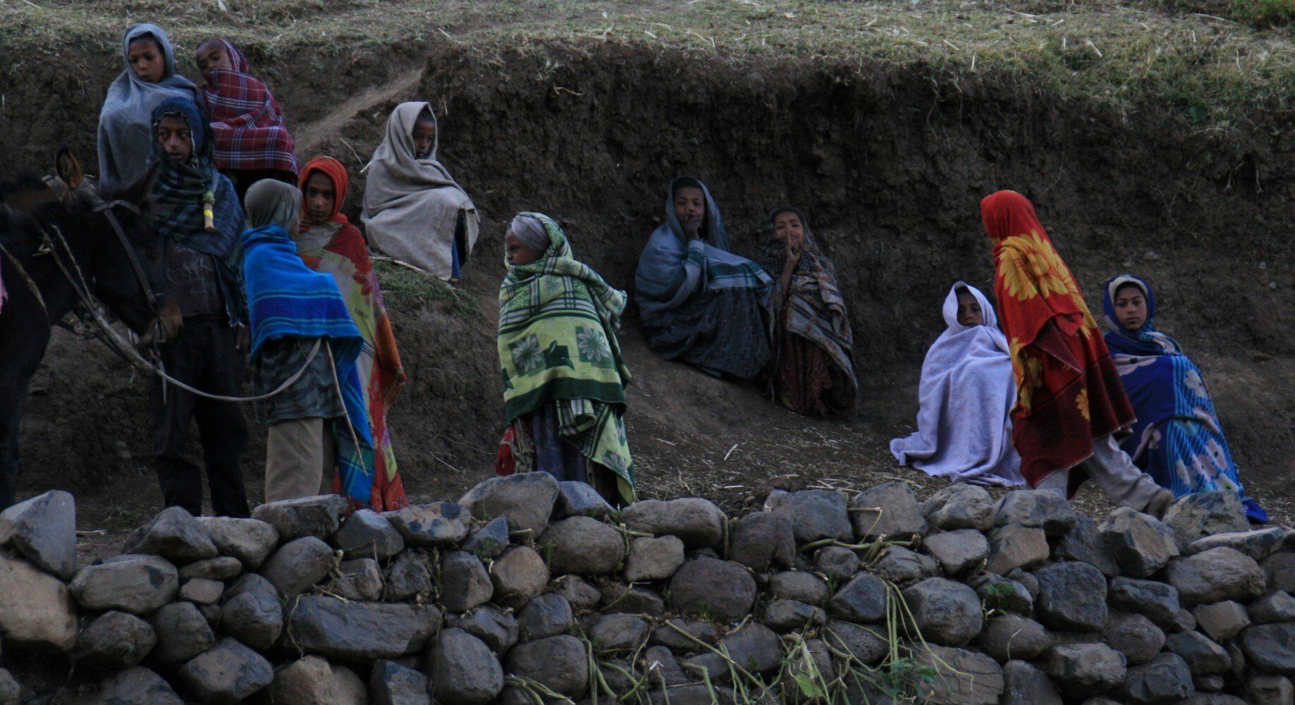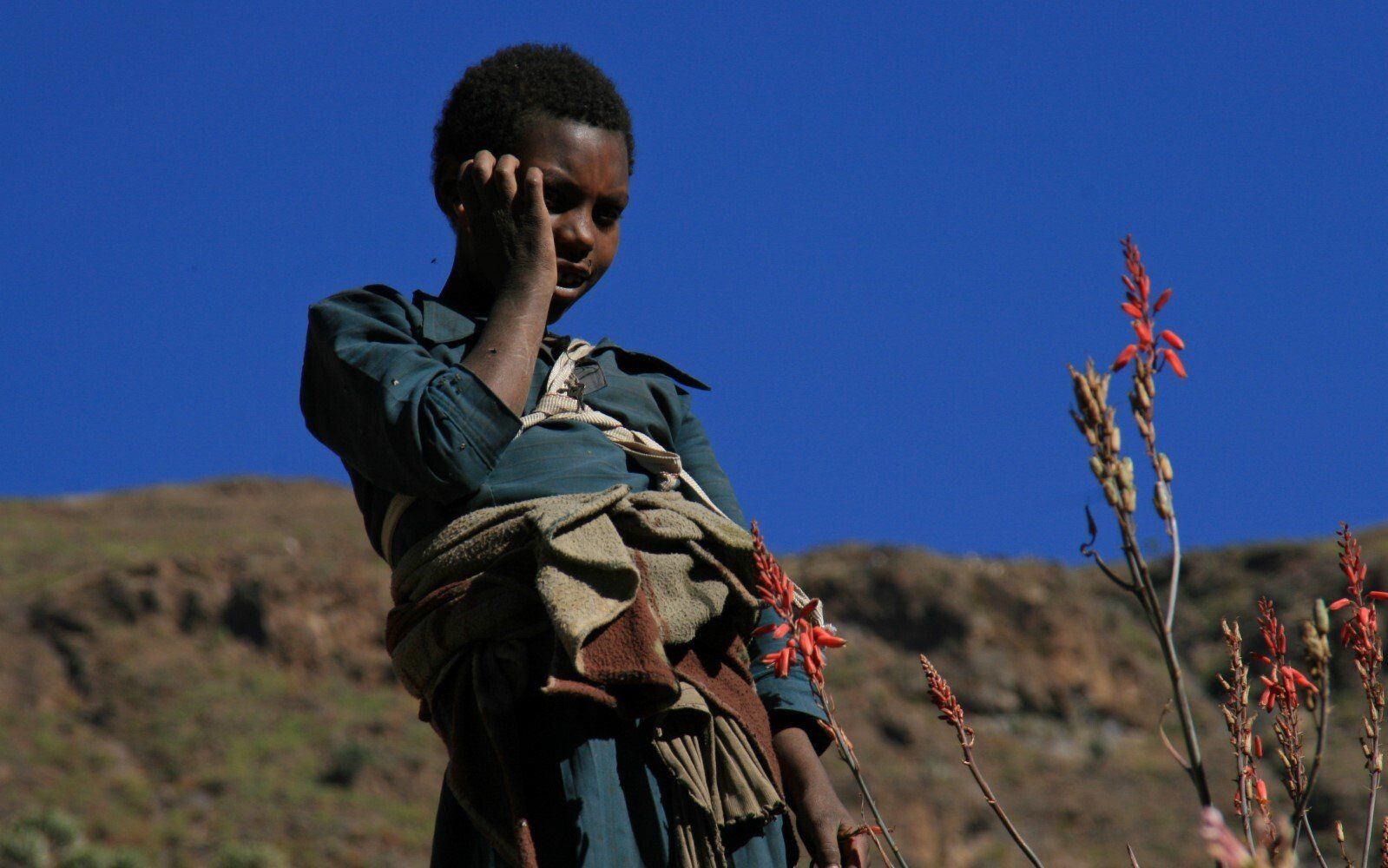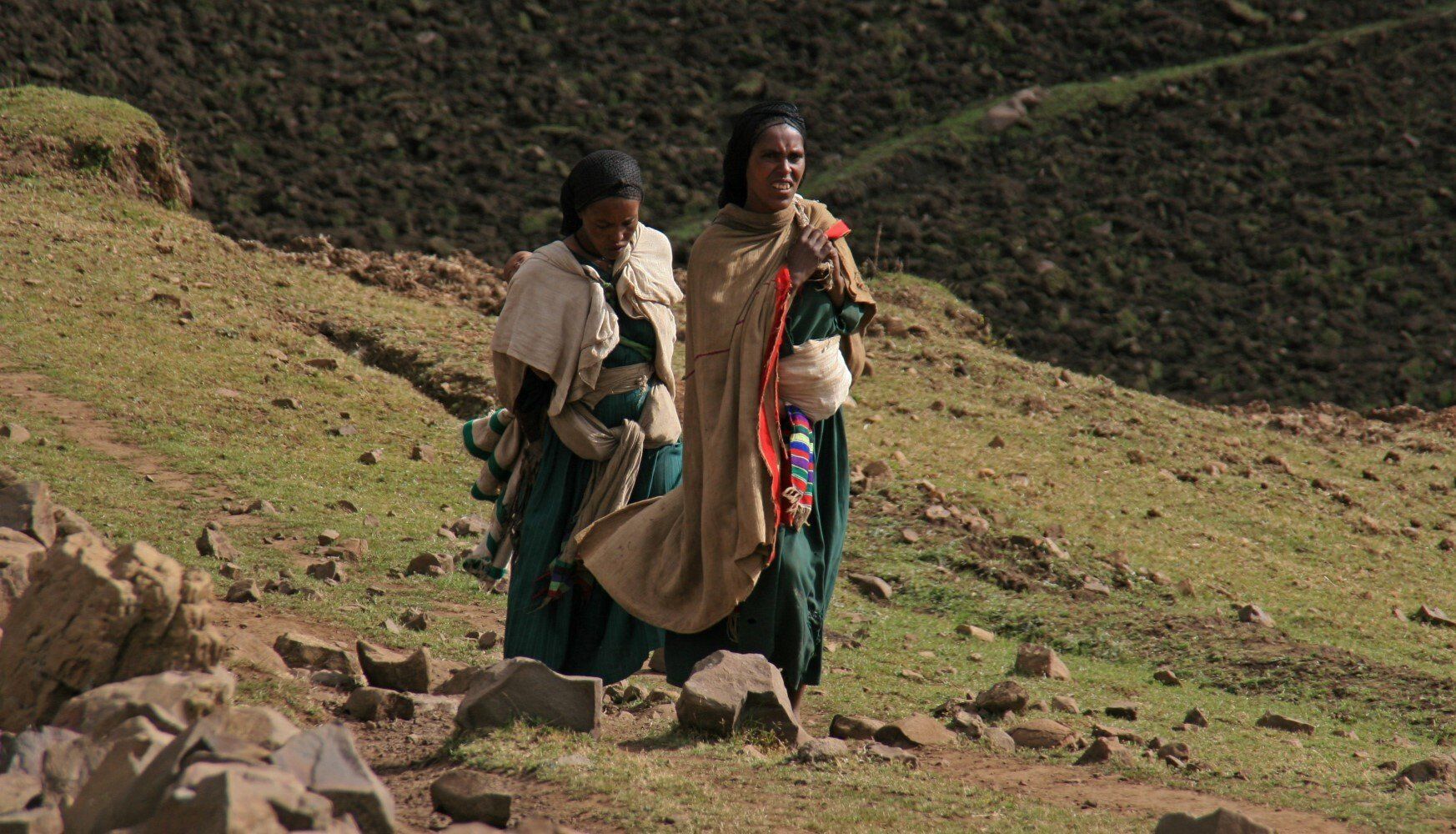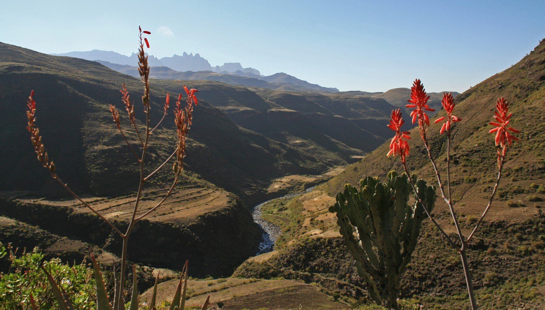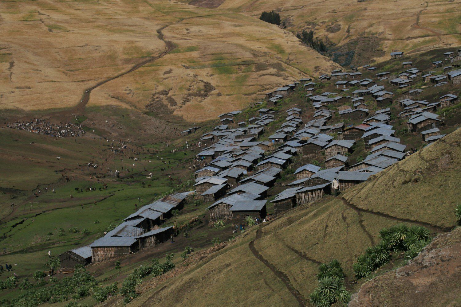 De dorpelingen kijken geïnteresseerd toe hoe wij al vroeg ons kamp opbreken. Het wordt een lange mooie dag, vanuit Ambiko wandelen we in 9 uur naar beneden in de Meseha rivier en via het Arkwazye dorp naar Sona. De hele dag wandelen we door glooiende graan en teff velden en vinden we bloeiende cactussen op ons weg. Hier en daar een hutje of boerderij op een heuvelrug. Het is warm, en elke keer als we uitpuffen krijgen we gezelschap van kinderen. En het is ongelooflijk in wat voor vodden de kinderen rondlopen. We passeren een boer die zijn vee naar het grasland brengt. Bij meerdere rust pauzes proberen plaatselijke bewoners handgemaakte souvenirs te verkopen.