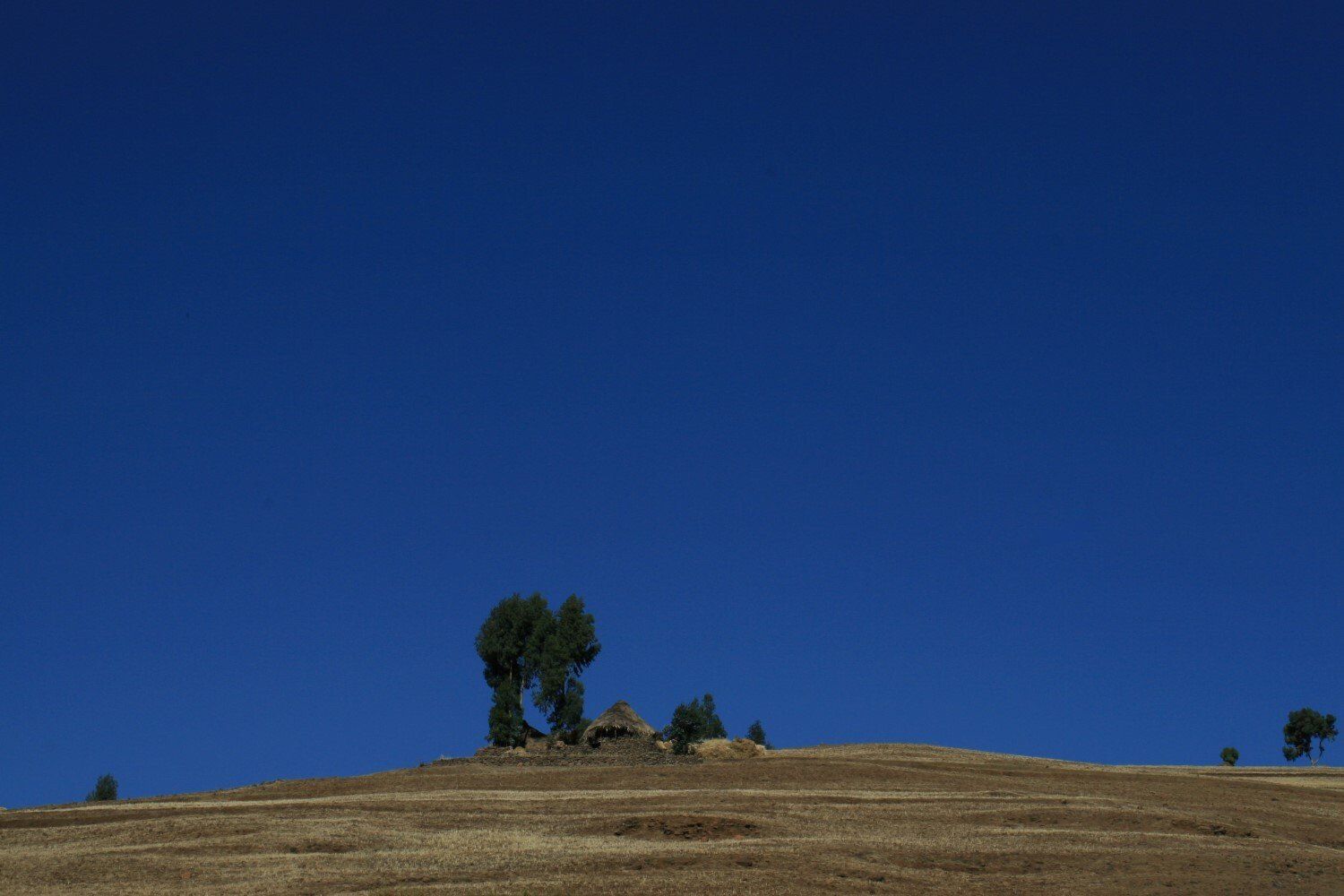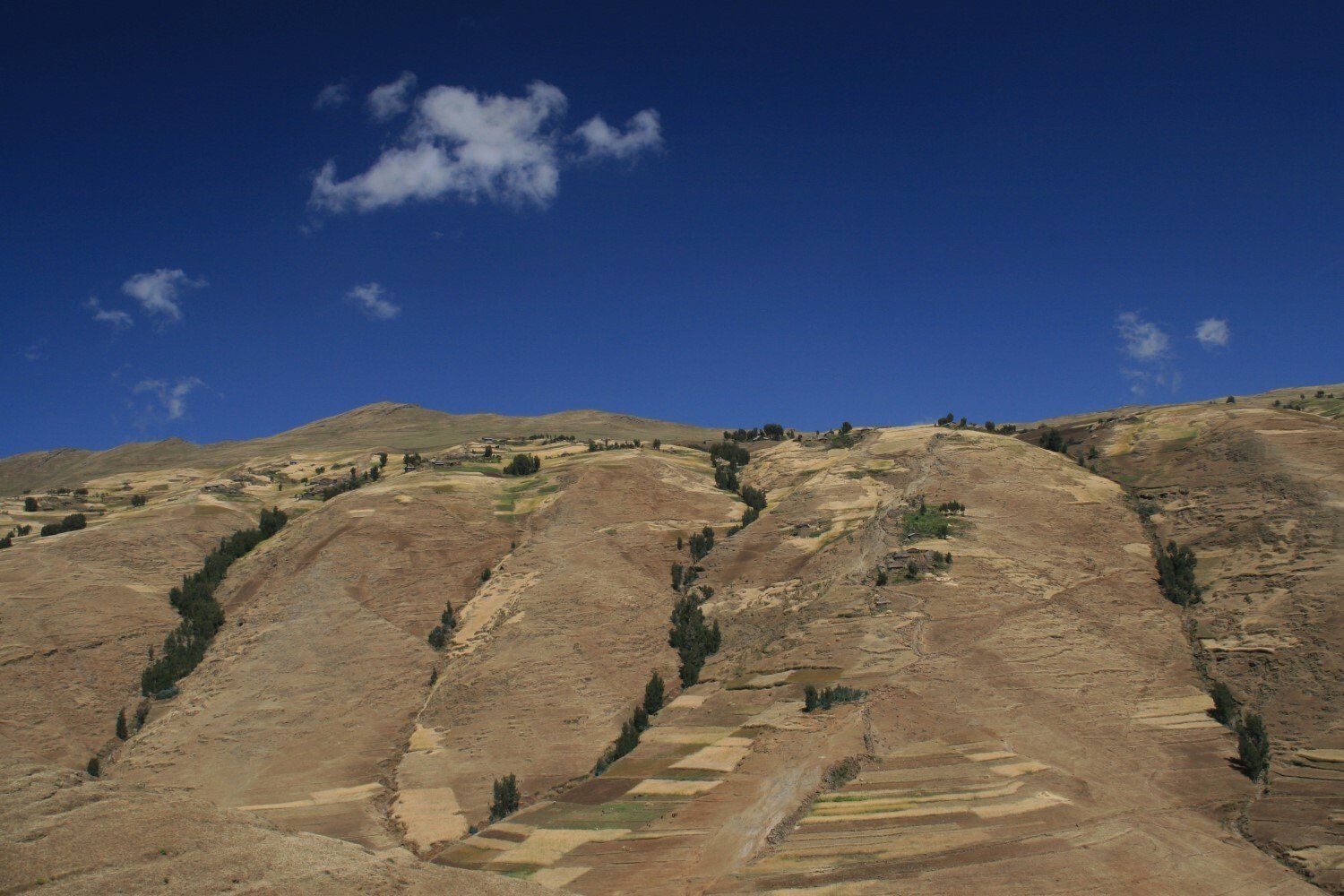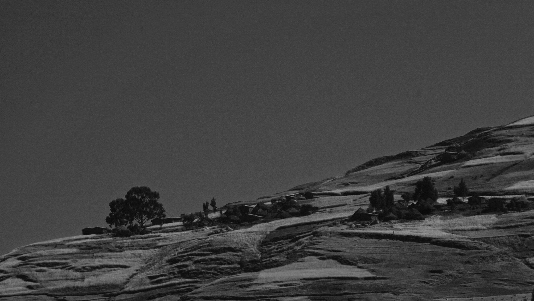 Hier en daar een hutje of boerderij op een heuvelrug.