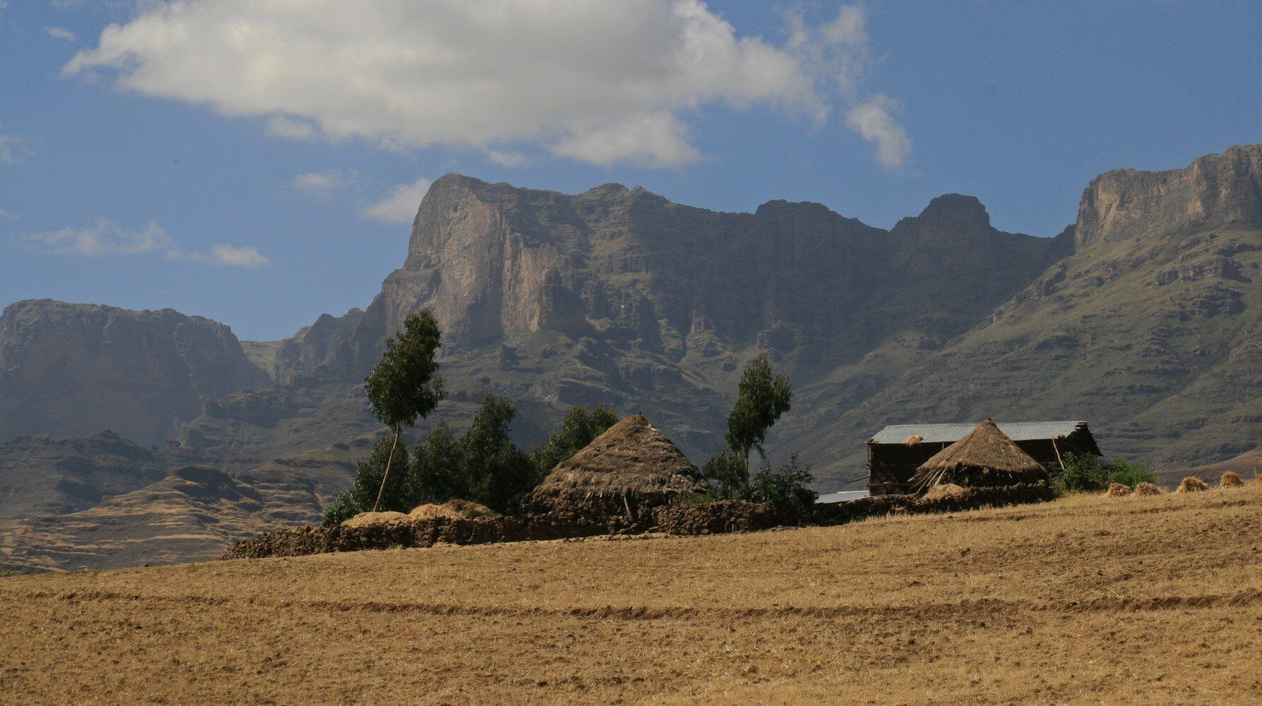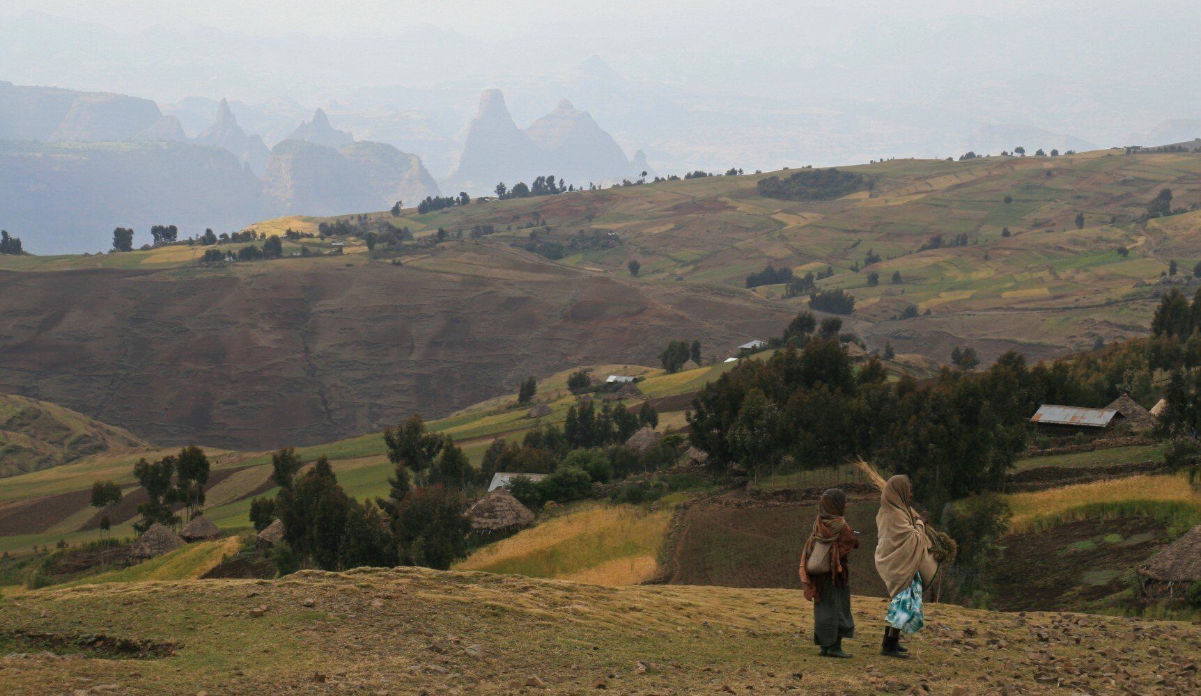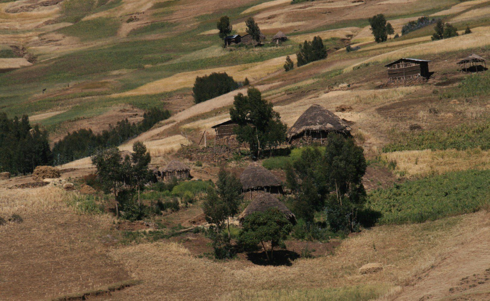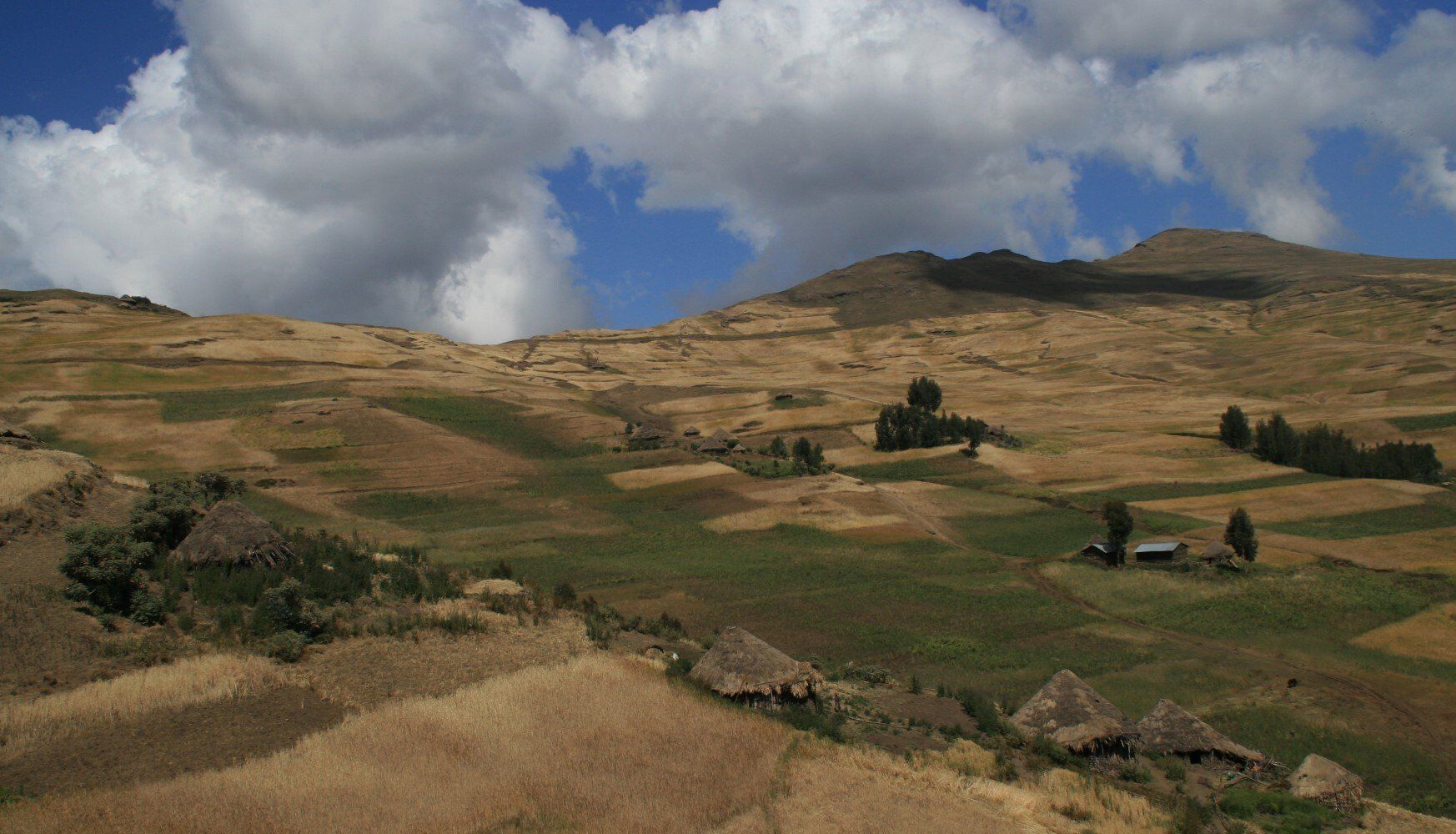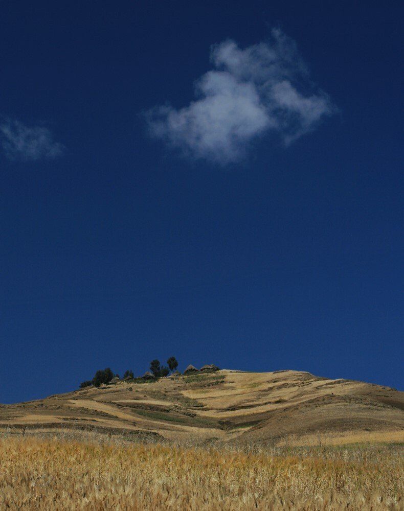 De hele dag wandelen we door glooiende graan en teff velden