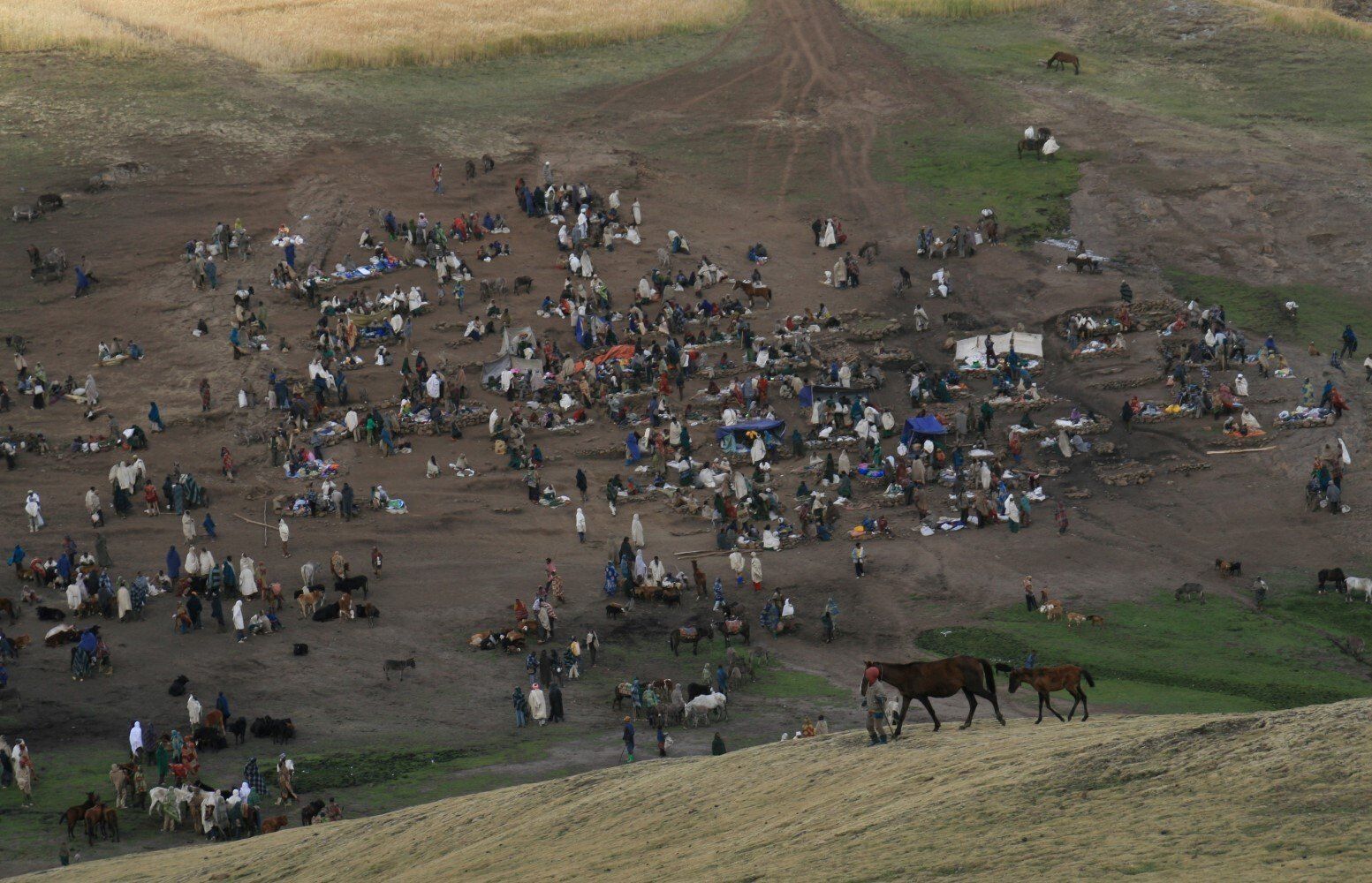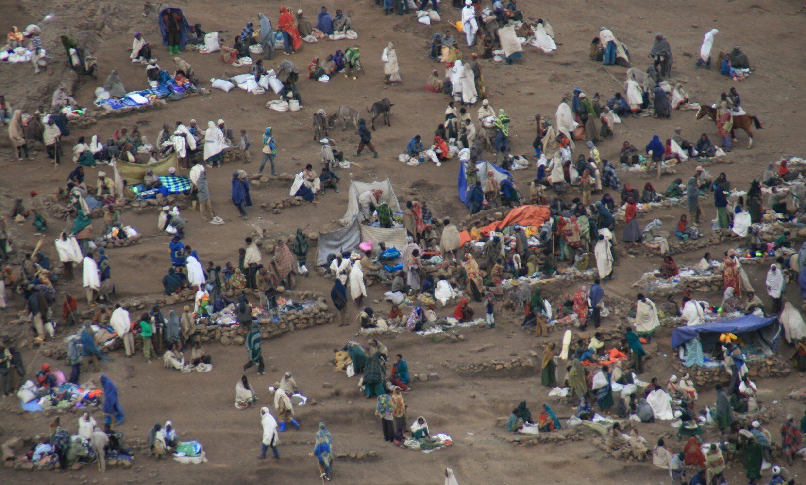 Het is marktdag, tegen de heuvel proberen de marktkoopmannen hun waar aan de vele mensen te verkopen.