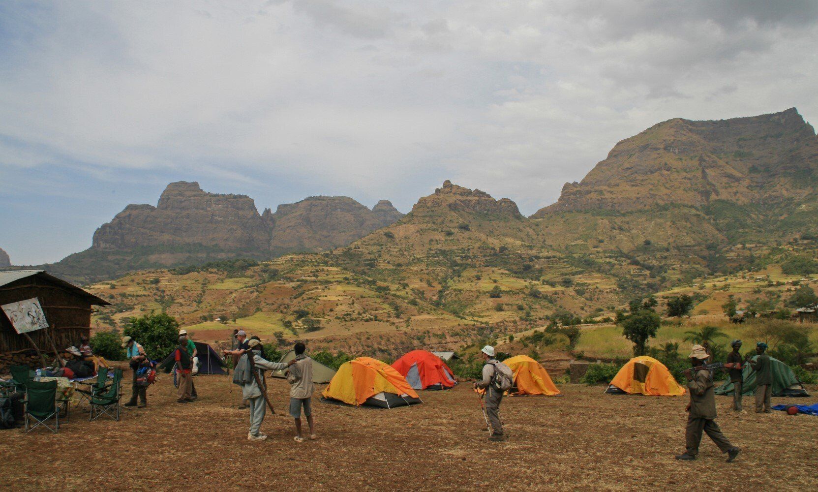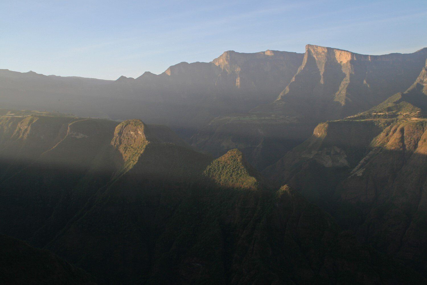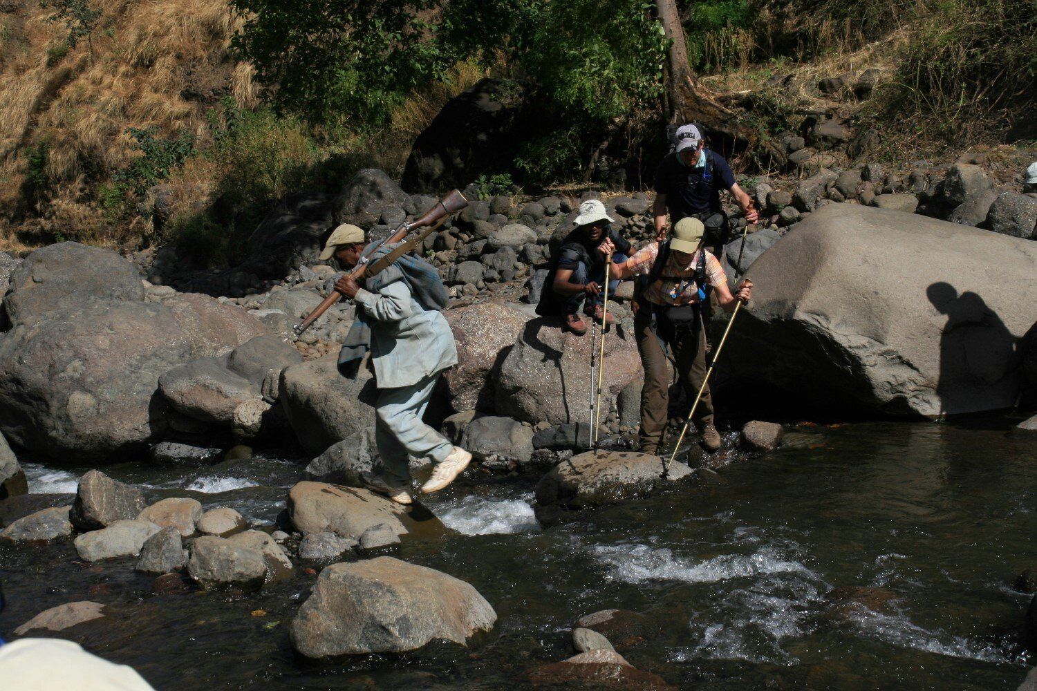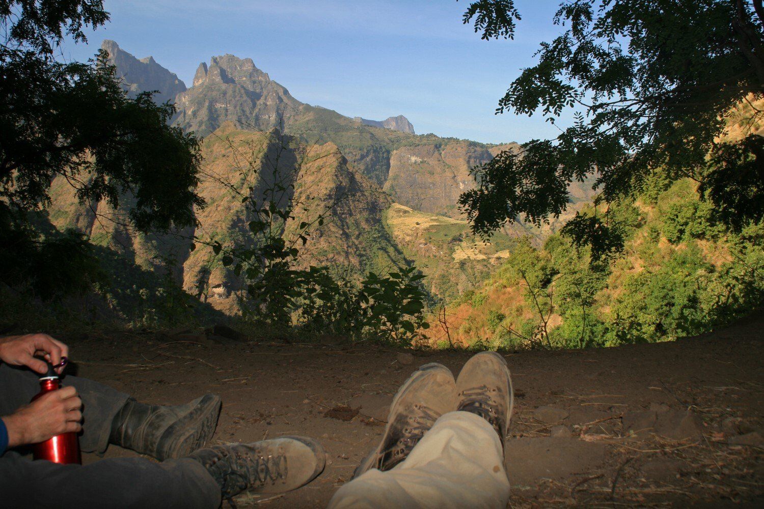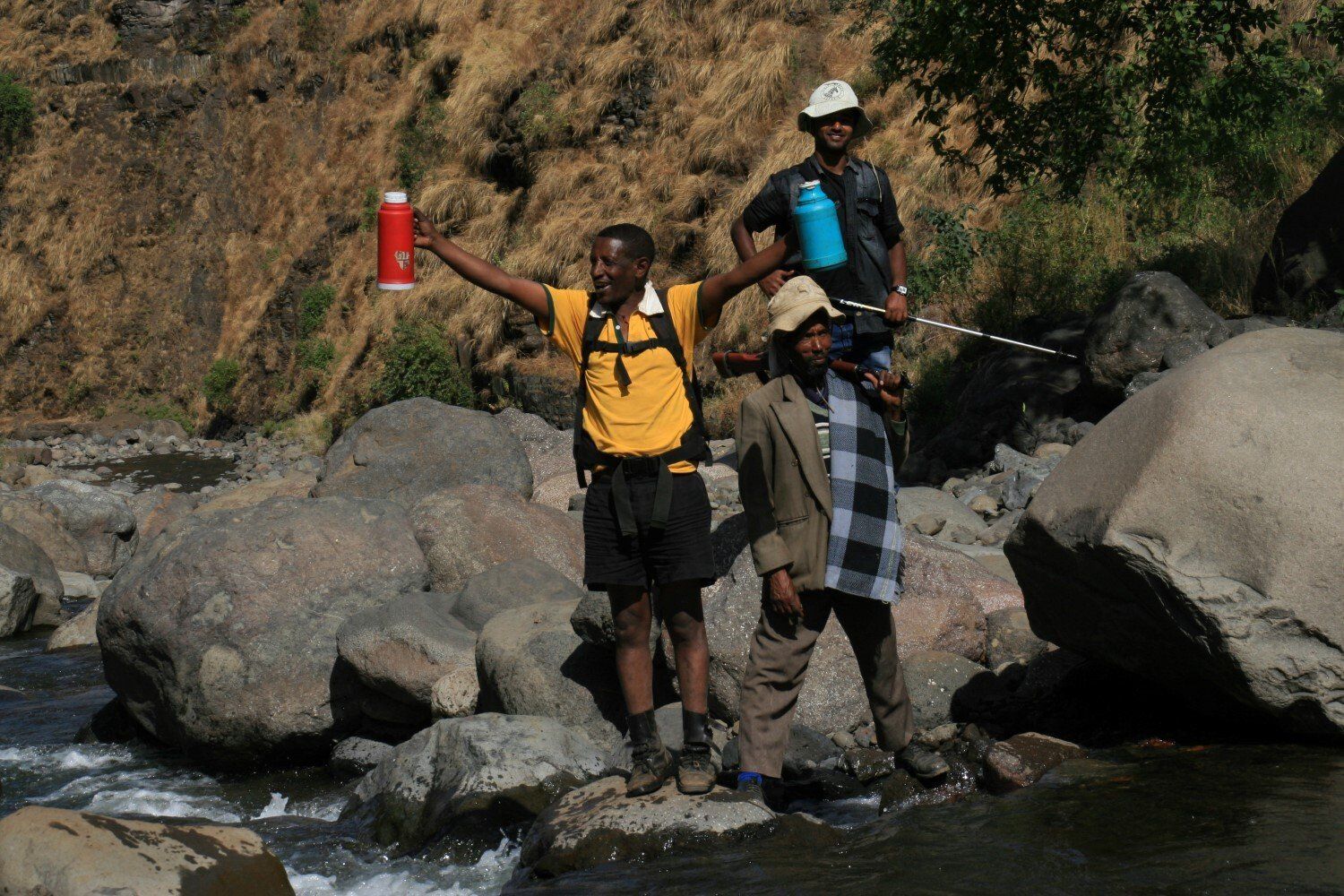 We worden weer wakker met een prachtig uitzicht. Terwijl onze begeleiders met ze allen nog zitten te bibberen rond een vuurtje, zien wij dat de opkomende zon langzaam de bergtoppen in het licht zetten. Het is een ontspannen wandeldag, hoofdzakelijk afdalen. We hebben 5 dagen doorgebracht op of boven de 3000 meter. Vandaag dalen we definitief af naar 1700 meter, waar het laagland (naar Ethiopische begrippen) begint. Van steen naar steen springen we een riviertje over, en even verderop bij een waterval, kunnen wij in een poeltje het vuil van de laatste 5 dagen af plonsen. Heerlijk.