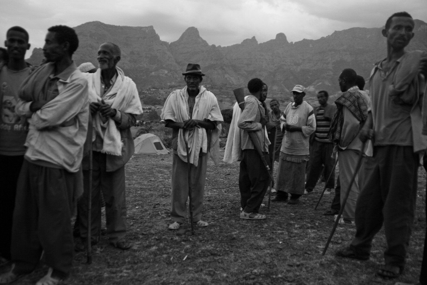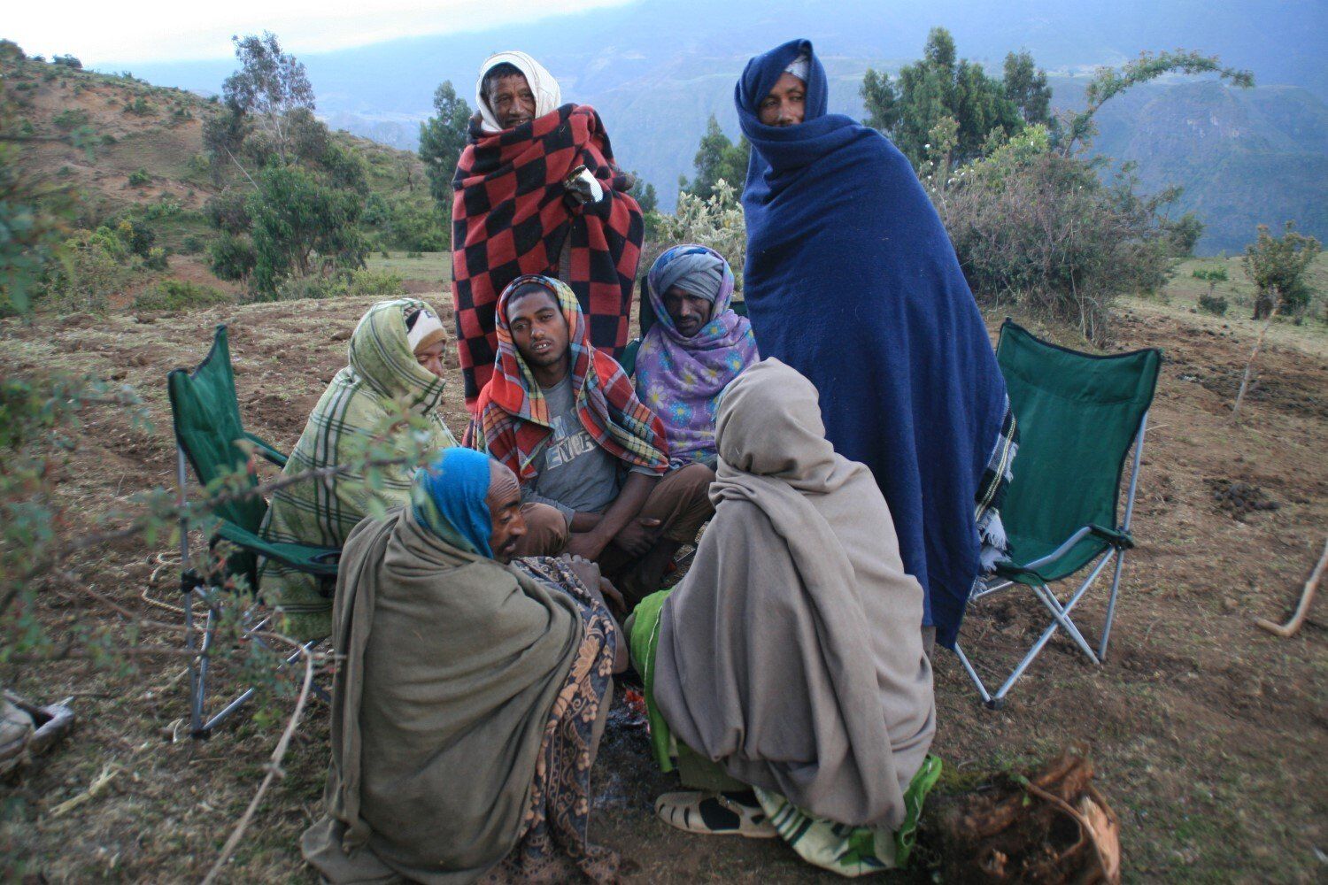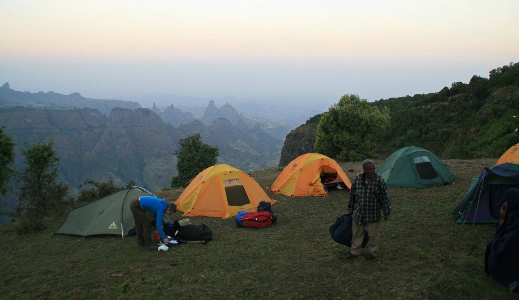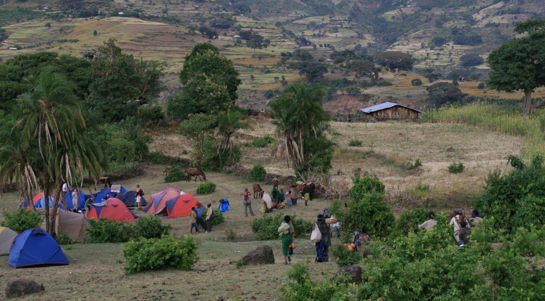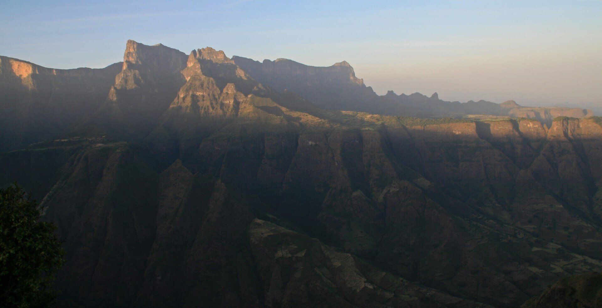 We worden weer wakker met een prachtig uitzicht. Terwijl onze begeleiders met ze allen nog zitten te bibberen rond een vuurtje, zien wij dat de opkomende zon langzaam de bergtoppen in het licht zetten. Het is een ontspannen wandeldag, hoofdzakelijk afdalen. We hebben 5 dagen doorgebracht op of boven de 3000 meter. Vandaag dalen we definitief af naar 1700 meter, waar het laagland (naar Ethiopische begrippen) begint. Van steen naar steen springen we een riviertje over, en even verderop bij een waterval, kunnen wij in een poeltje het vuil van de laatste 5 dagen af plonsen. Heerlijk.