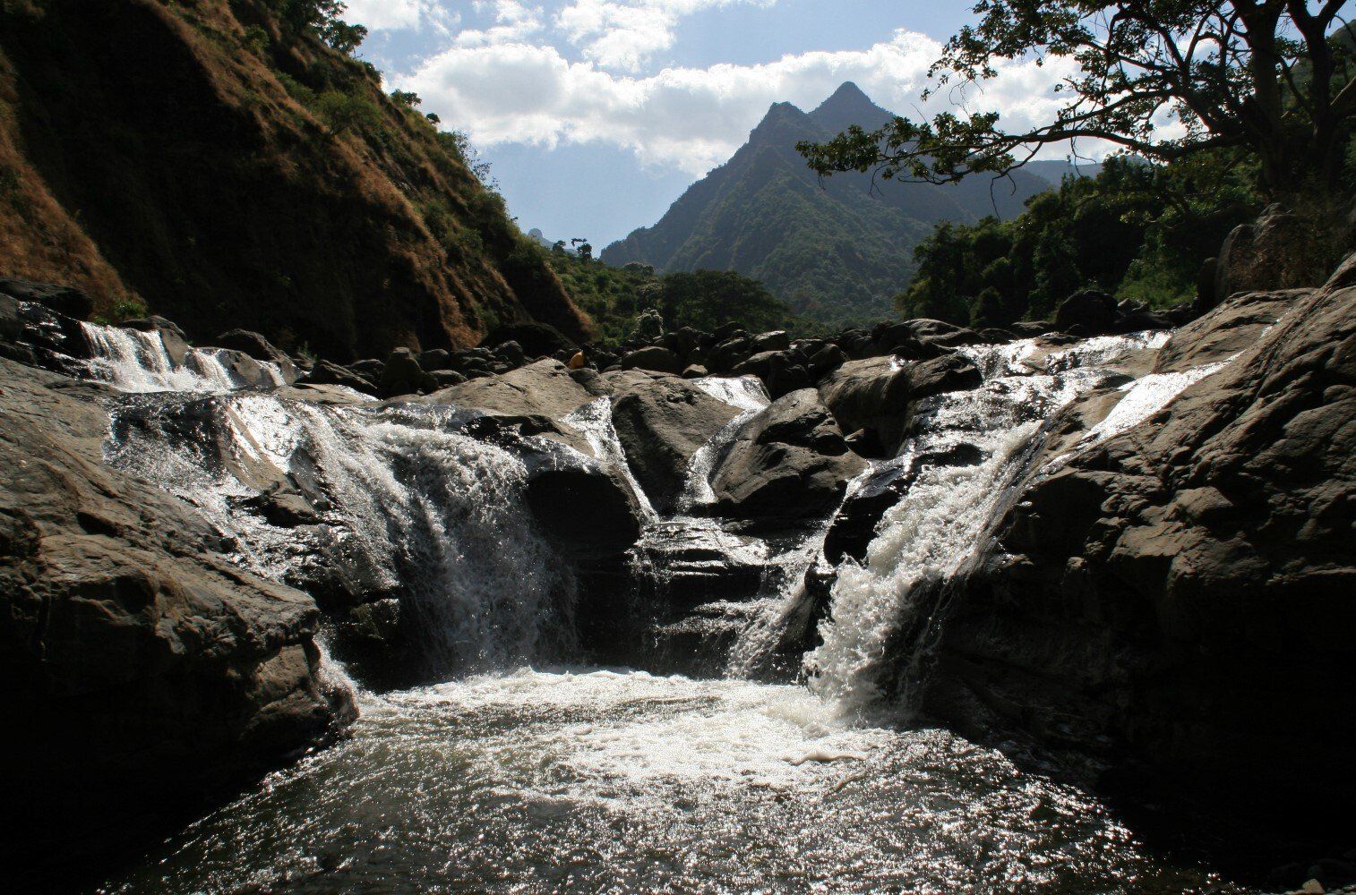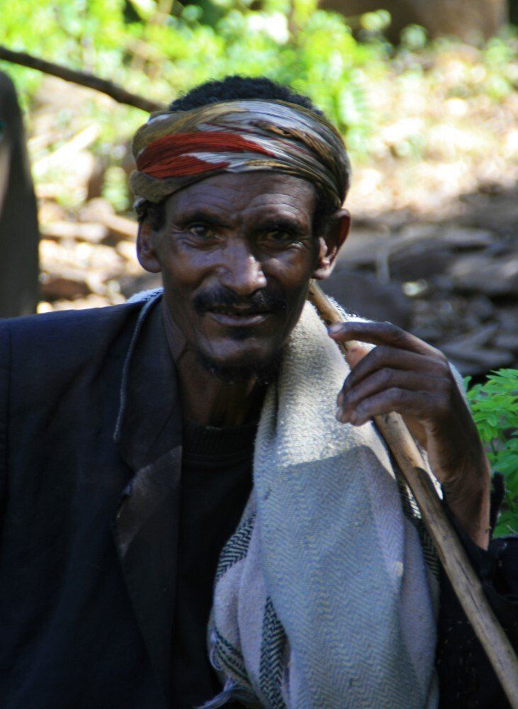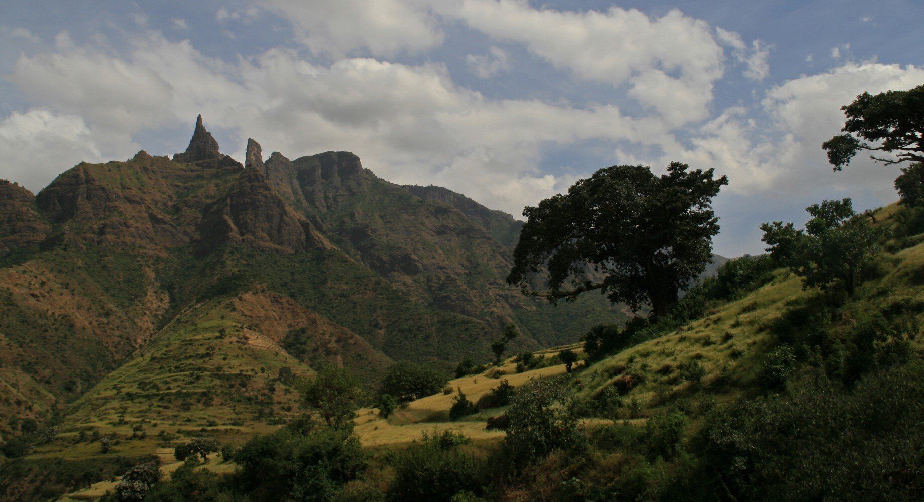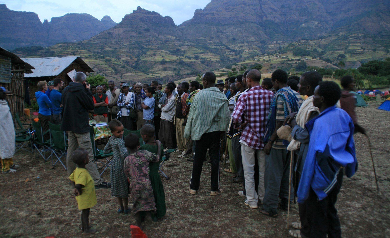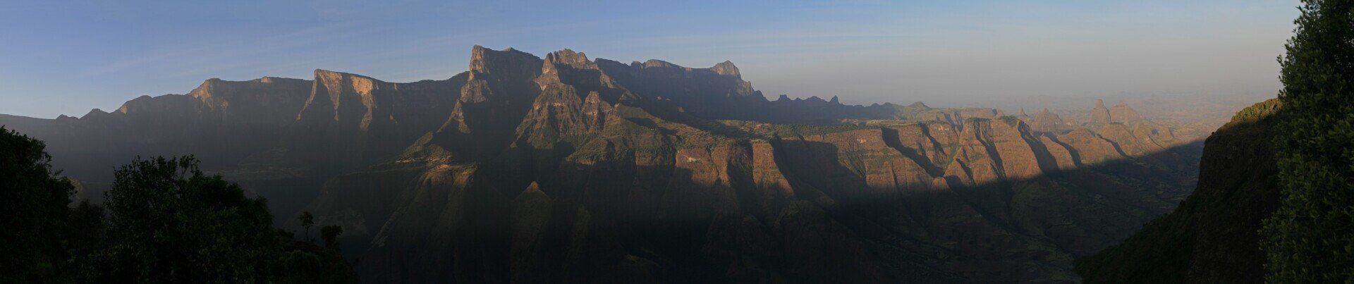 We worden weer wakker met een prachtig uitzicht. Terwijl onze begeleiders met ze allen nog zitten te bibberen rond een vuurtje, zien wij dat de opkomende zon langzaam de bergtoppen in het licht zetten. Het is een ontspannen wandeldag, hoofdzakelijk afdalen. We hebben 5 dagen doorgebracht op of boven de 3000 meter. Vandaag dalen we definitief af naar 1700 meter, waar het laagland (naar Ethiopische begrippen) begint. Van steen naar steen springen we een riviertje over, en even verderop bij een waterval, kunnen wij in een poeltje het vuil van de laatste 5 dagen af plonsen. Heerlijk.