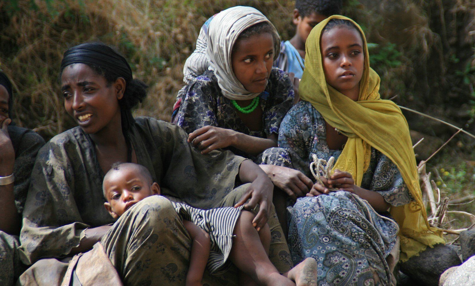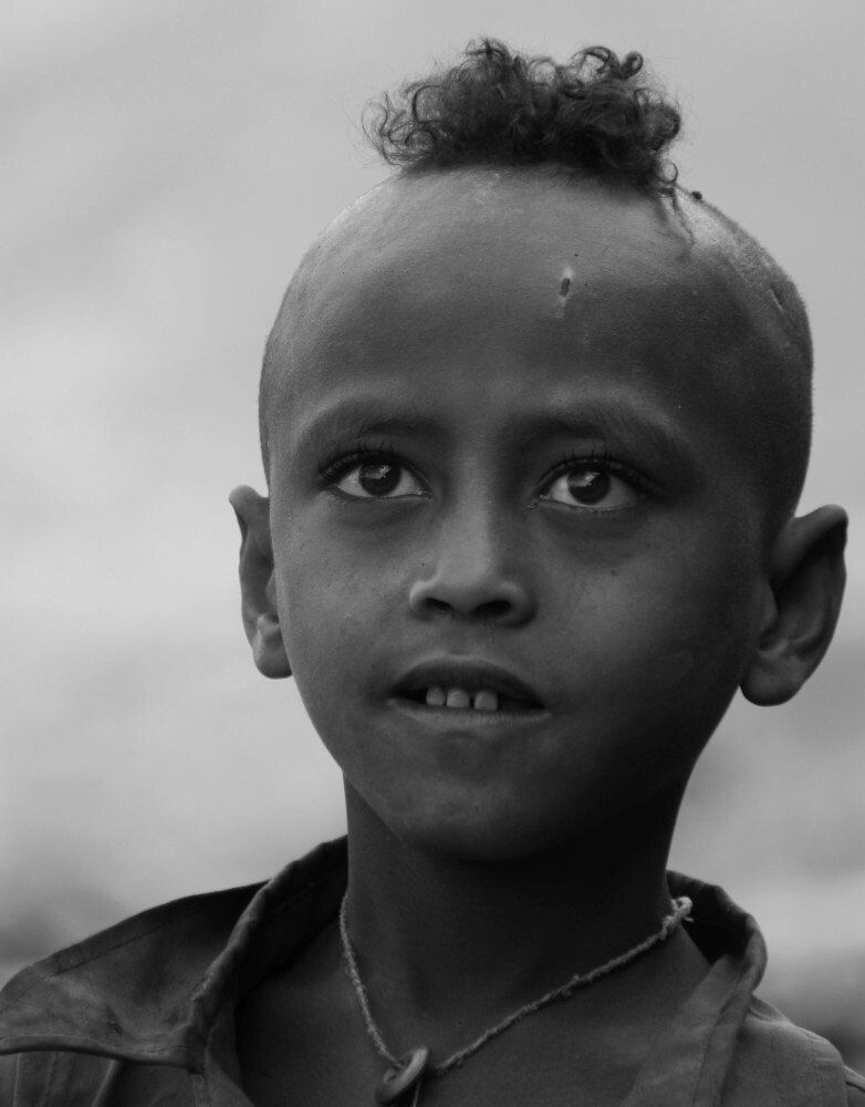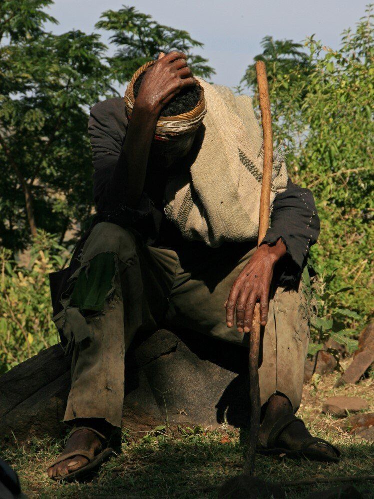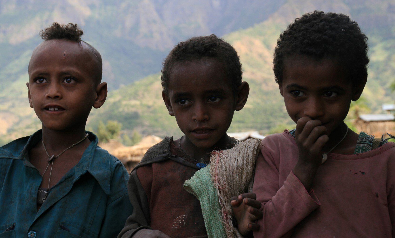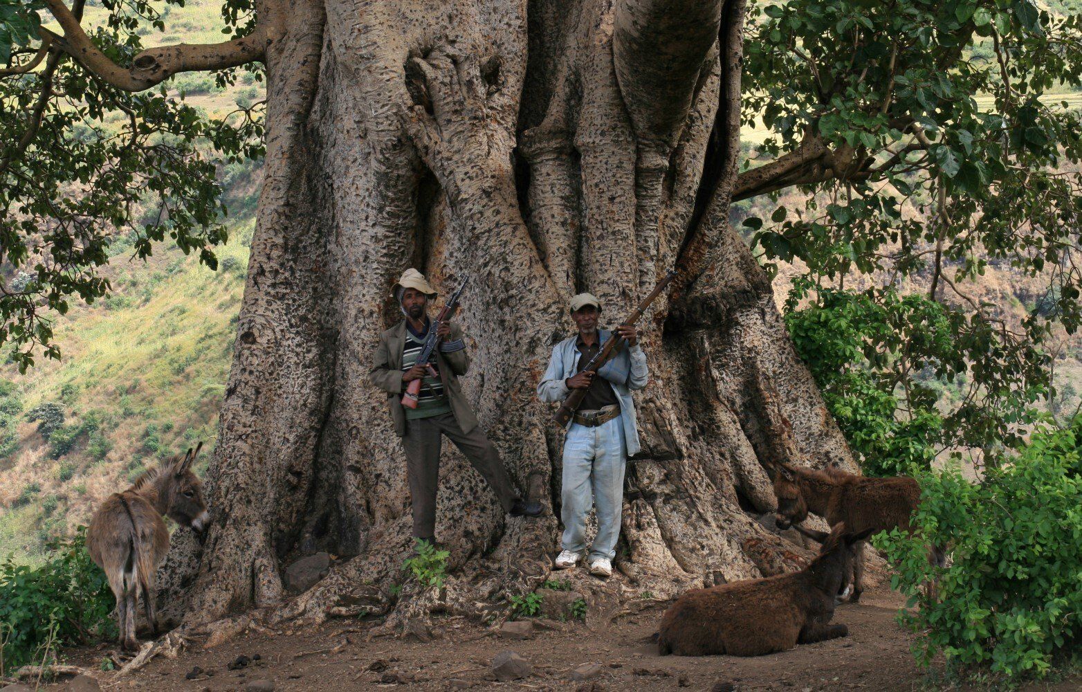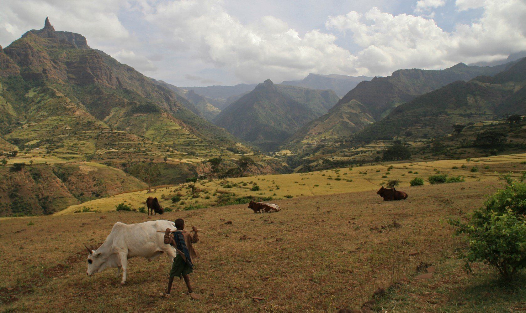 We worden weer wakker met een prachtig uitzicht. Terwijl onze begeleiders met ze allen nog zitten te bibberen rond een vuurtje, zien wij dat de opkomende zon langzaam de bergtoppen in het licht zetten. Het is een ontspannen wandeldag, hoofdzakelijk afdalen. We hebben 5 dagen doorgebracht op of boven de 3000 meter. Vandaag dalen we definitief af naar 1700 meter, waar het laagland (naar Ethiopische begrippen) begint. Van steen naar steen springen we een riviertje over, en even verderop bij een waterval, kunnen wij in een poeltje het vuil van de laatste 5 dagen af plonsen. Heerlijk.