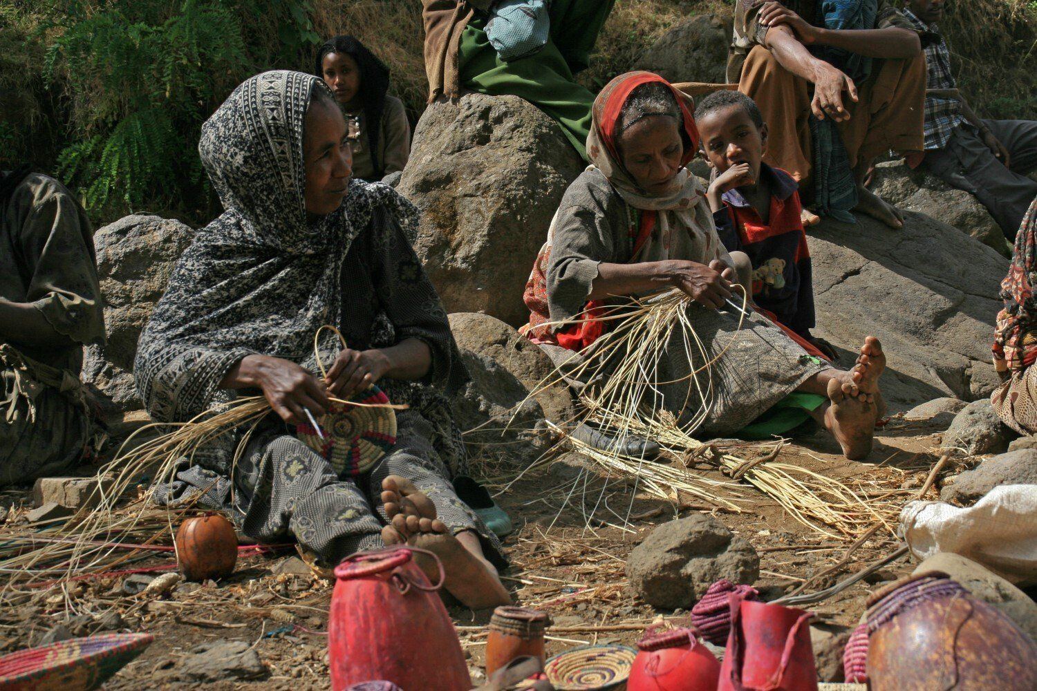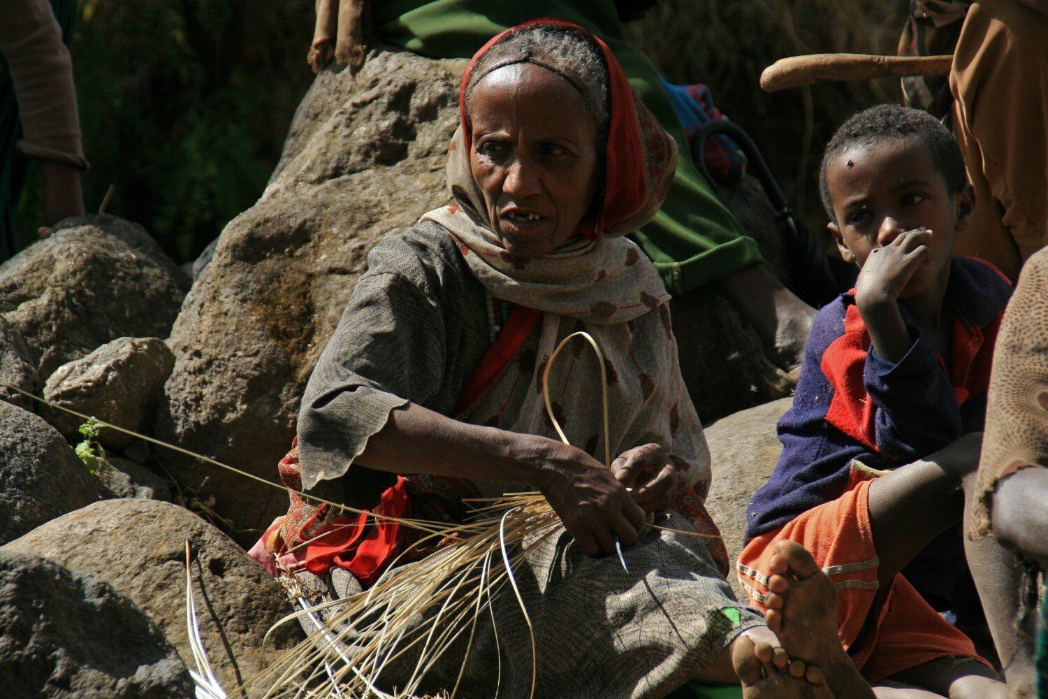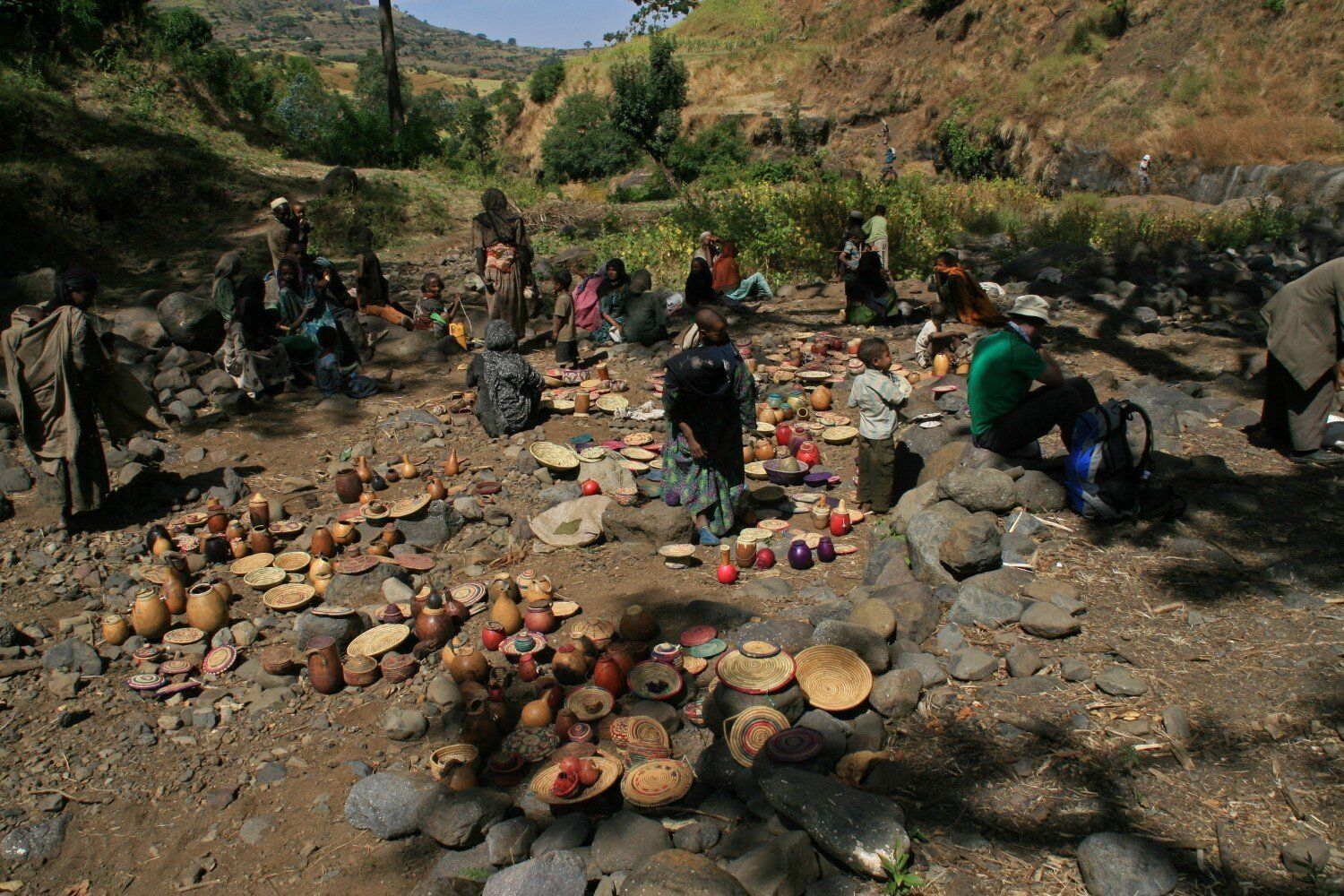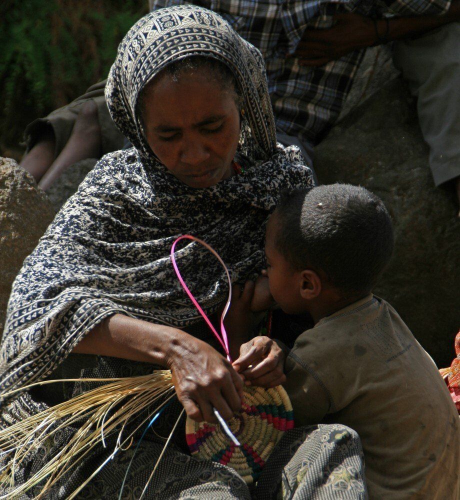 Niet veel verder bereiken wij, schoon en fris, onze lunch plek. De lokale bevolking zit al op ons te wachten en hebben al hun handwerk uitgestald. Het is een mooi tafereeltje, jong en oud, man en vrouw, zitten door elkaar. Er word ter plekke aan de rieten pannenonderzetters en schalen gevlochten, onderwijl worden kinderen gewoon de borst gegeven. Natuurlijk krijgen wij ook vers gebrande Ethiopische koffie aangeboden. Ik koop mijn pannenonderzetters hier.