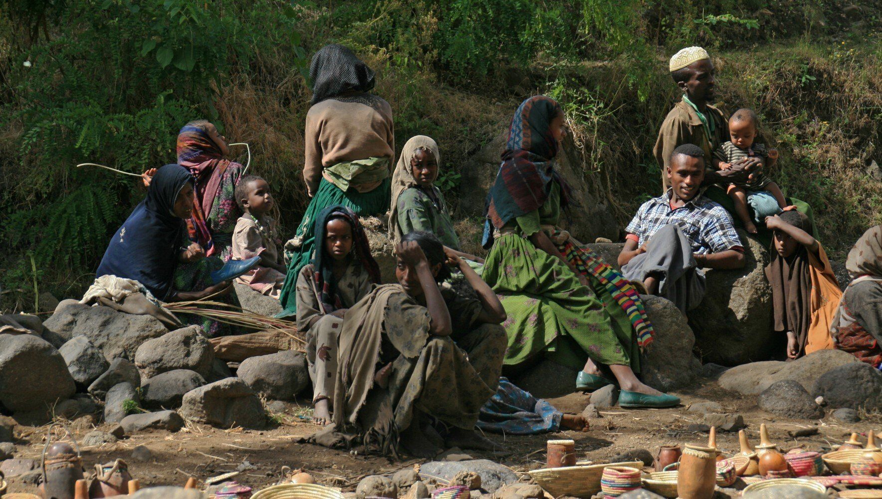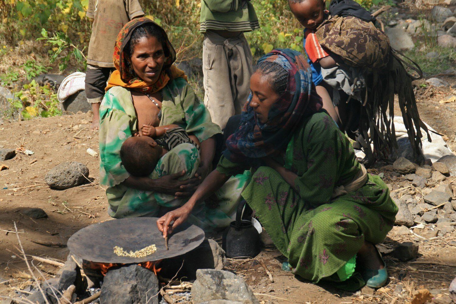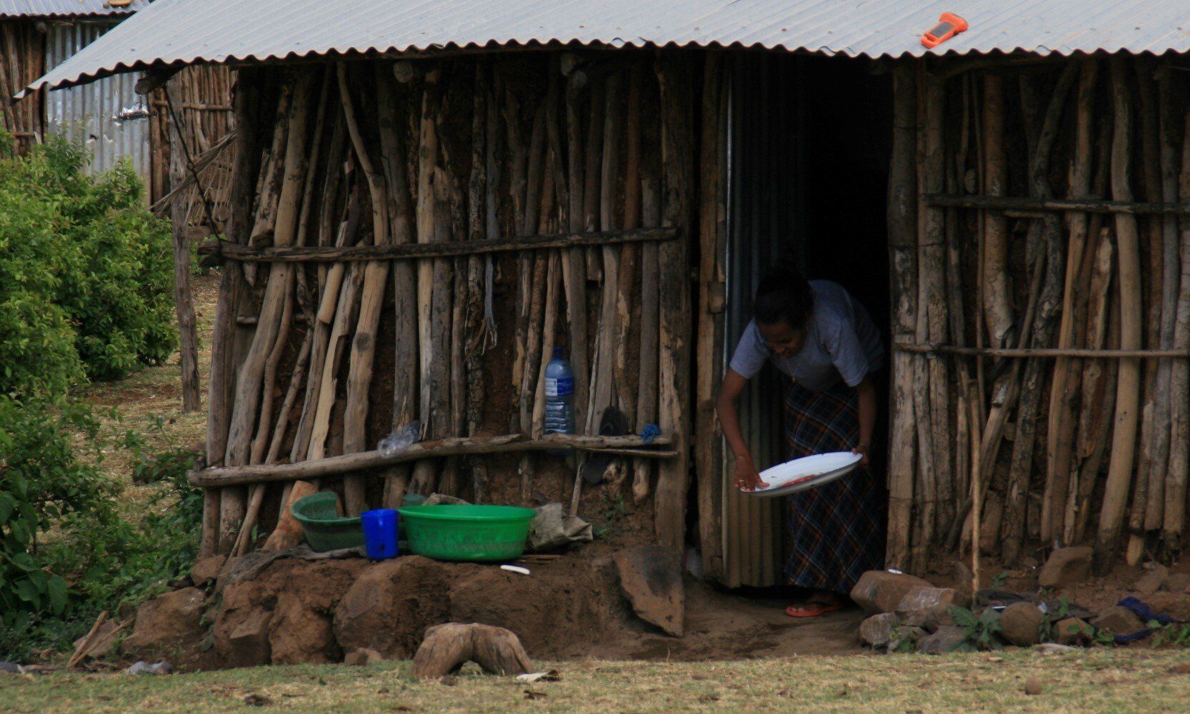Niet veel verder bereiken wij, schoon en fris, onze lunch plek. De lokale bevolking zit al op ons te wachten en hebben al hun handwerk uitgestald. Het is een mooi tafereeltje, jong en oud, man en vrouw, zitten door elkaar. Er word ter plekke aan de rieten pannenonderzetters en schalen gevlochten, onderwijl worden kinderen gewoon de borst gegeven. Natuurlijk krijgen wij ook vers gebrande Ethiopische koffie aangeboden. Ik koop mijn pannenonderzetters hier.