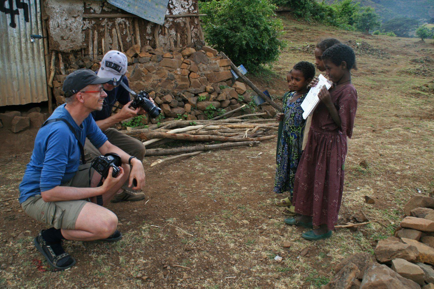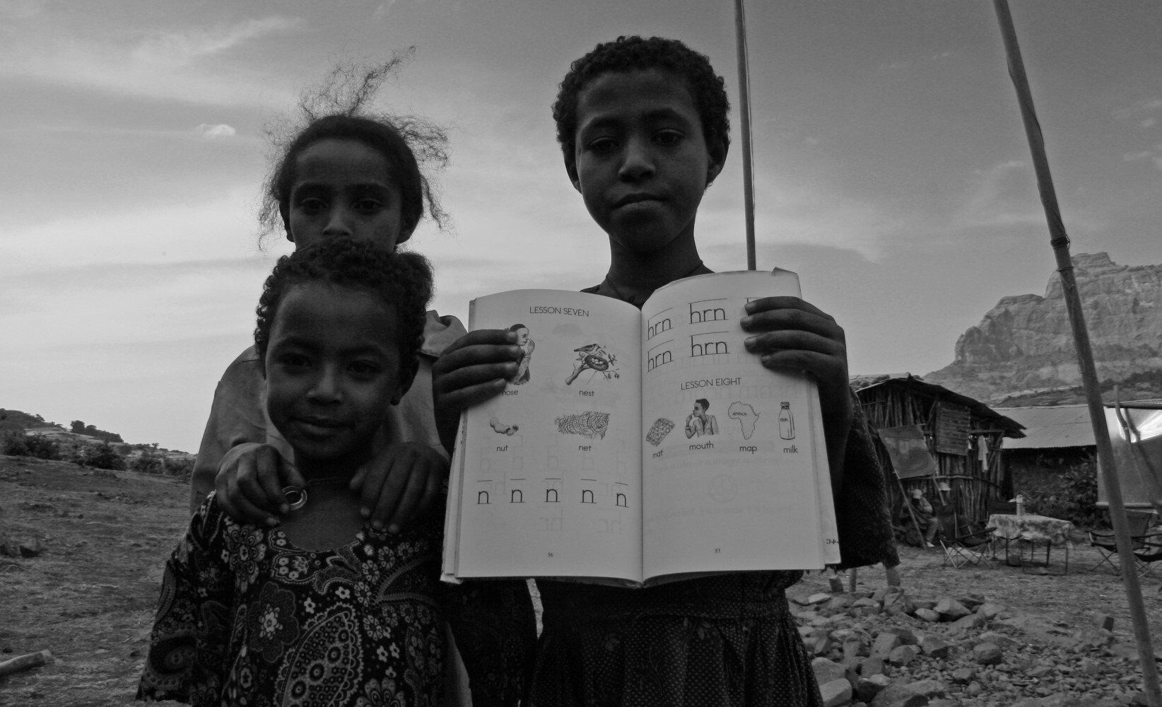 Kinderen laten zich gewillig fotograferen en tonen trots hun schoolboeken.