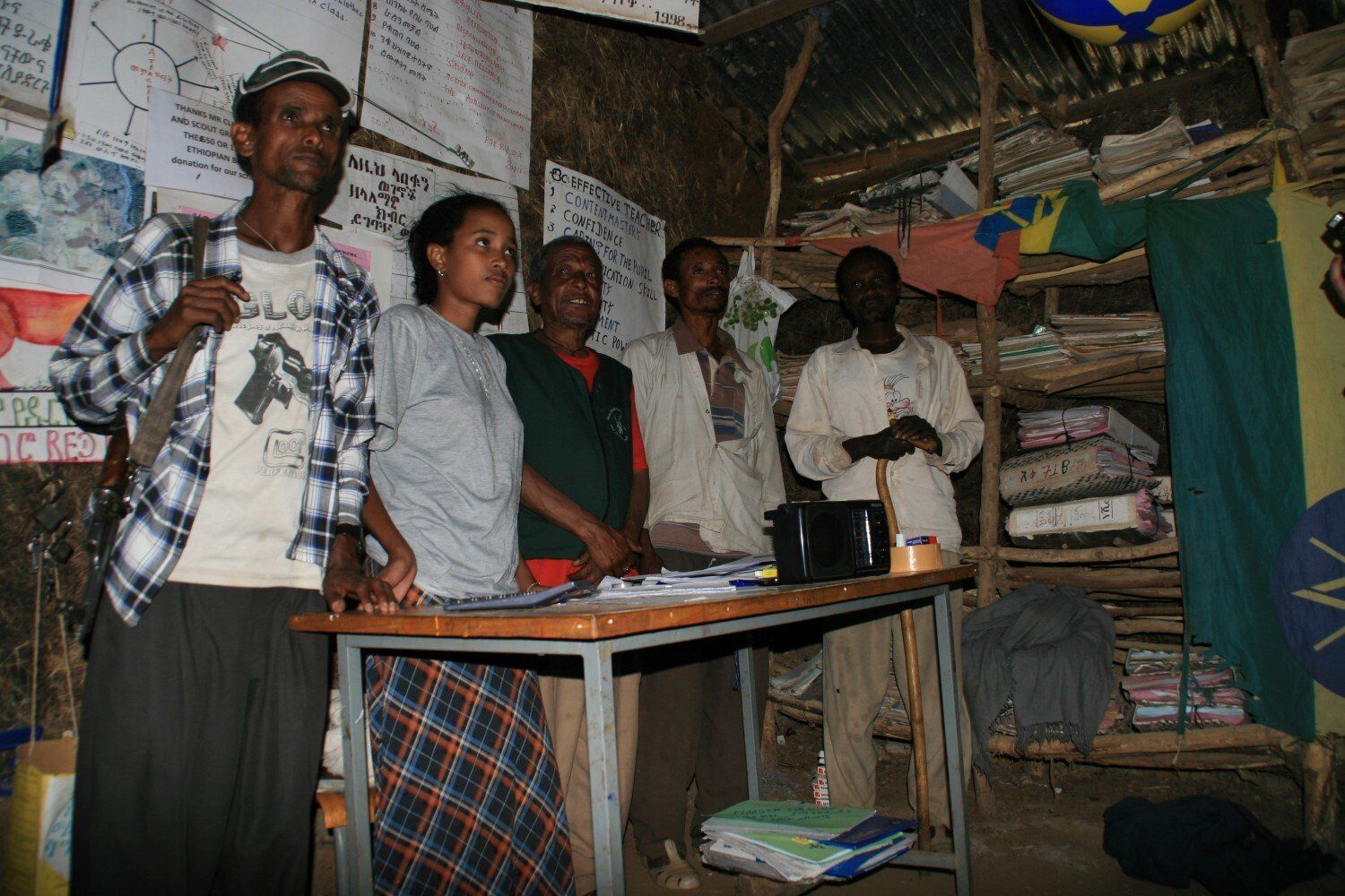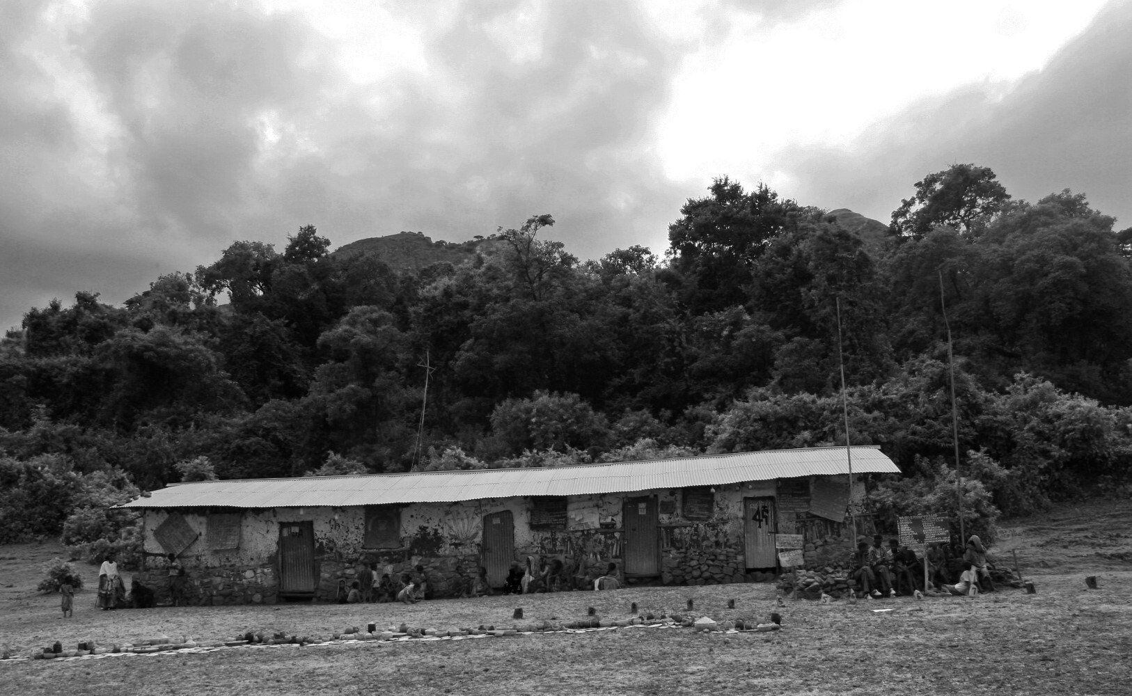 In het laagland komen we steeds meer akkers en weilanden tegen, een jongetje hoed een aantal koeien. Onze lijfwacht poseren met een paar andere ezels voor een gigantische woudreus. Vroeg in de middag bereiken wij het dorp Mekarebya. Op het schoolpleintje zetten wij onze tenten op, wat lager zien wij de tenten van een andere groep. Kinderen laten zich gewillig fotograferen en tonen trots hun schoolboeken. Van de jonge onderwijzeres/schoolhoofd mogen wij het schooltje bezichtigen. Haar kantoor ziet eruit als een chaotische archiefkast, de klaslokaal daarentegen kaal en leeg. Na de bezichtiging verzamelen wij geld in en onder veel bekijks en ceremonieel vertoon geven wij dat aan de onderwijzeres. Een goed einde van weer een mooie dag.