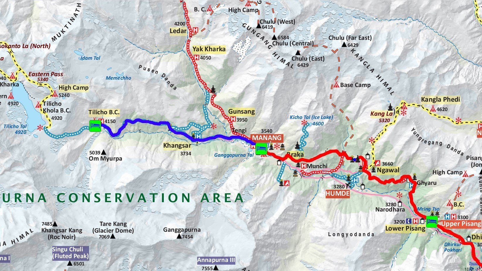 Ik ben vroeg wakker en nog voor het ontbijt maak ik een kleine ochtendwandeling door Manang. De ochtend nevel geeft Manang een vredige sfeer. Manang is het economische, culturele en politieke centrum van deze vallei. De 'Manangi's' hebben een sterke eigen cultuur en in het dorp is van alles te beleven. Er zijn winkeltjes, een medische hulppost, bakkerijen en zelfs een klein bioscoopje. Ik ontdek alleen gebedsmolens die gemaakt zijn van eenvoudige groenteblikken. Na het ontbijt gaan we op pad. Naar het oosten kijkend hangen de nevels nog steeds tussen de bergen boven Manang. We passeren weide velden met langharige yaks, die worden gebruikt als lastdieren, maar die ook leverancier zijn van boter, vlees, wol en kaas. We lopen door het grote dorp Khangsar. Dit is het laatste dorpje voor het Tilicho meer en we zijn hier weer van de normale "Rond Annapurna" route af. Er wordt flink gewerkt op de daken, tussen de gebedsvlaggen wordt de oogst gedroogd en veevoer opgeslagen. Net buiten Khangsar lunchen wij in het Blue Sheep Hotel/Lodge. Hier zullen wij op de terugweg van Tilicho meer overnachten. En inderdaad spotten wij de blue sheeps in de omgeving van het Blue Sheep Hotel/Lodge. De rest van de route is spectaculair, een smal pad langs een steile bergwand met een kans op steenslaggevaar en aardverschuivingen, maar oh zo mooi! Rond 4 uur bereiken wij Tilicho Base Camp, de meest primitieve lodge die we zullen aandoen op onze tocht.