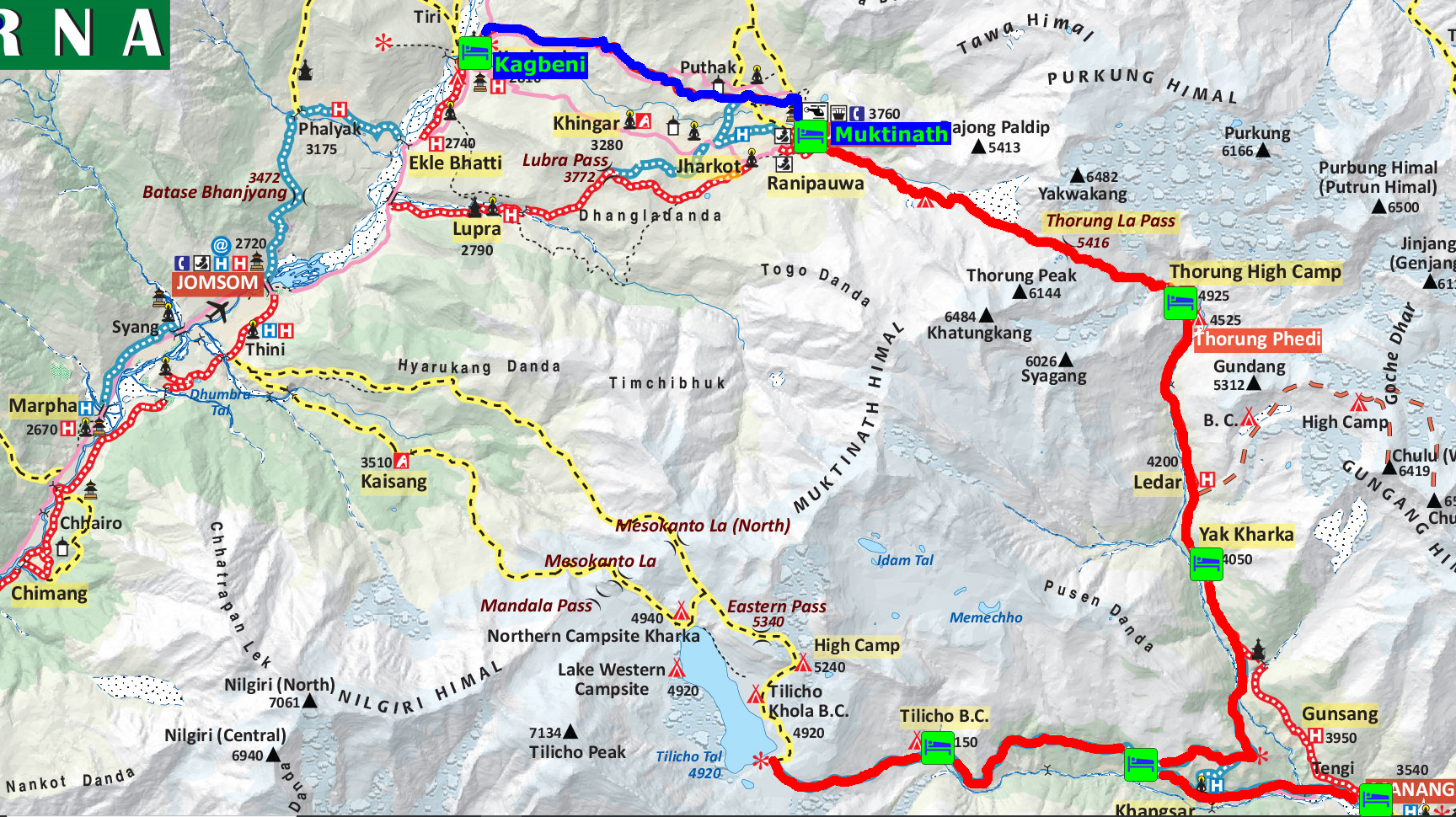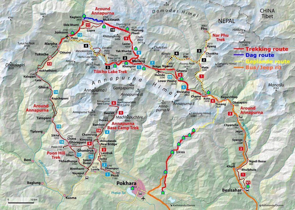 Terug in Muktinath pakken wij onze spullen voor de tocht naar Kagbeni. We lopen bovenlangs de vallei, met weidse vergezichten, de herfstkleuren maken het plaatje helemaal af. We hebben ook mooi zicht op de afdaling van de Thorung La die we gisteren gedaan hebben. Het pad voert verder langs mooie authentieke dorpjes, die veel weg hebben van de dorpjes in Upper-Mustang. Akkers worden door yaks omgeploegd terwijl de oogst op de daken ligt te drogen. De hele ochtend hebben wij zicht op het klooster van Jharkot dat midden in de vallei op een rotspunt ligt. Het laatste stuk naar Kagbeni gaat over een kaal en droog plateau, maar de kleuren van de aarde en de vormen van de rotspartijen zijn bijzonder. We hebben een mooie doorkijk op de indrukwekkend mooie geërodeerde vallei richting Upper-Mustang, tot in de jaren zeventig een zelfstandig koninkrijk dat grenst aan Tibet. Aan het begin van deze vallei ligt Kagbeni. Kagbeni is prachtig gelegen tussen het Annapurna en het Dhaulagiri massief op een plek waar een zijriviertje in de Kali Gandaki rivier stroomt. De graanakkers rondom het dorp zijn allemaal al geoogst. Een korte afdaling vanaf het plateau brengt ons in Kagbeni. Eindpunt van een schitterende en relaxte dag.