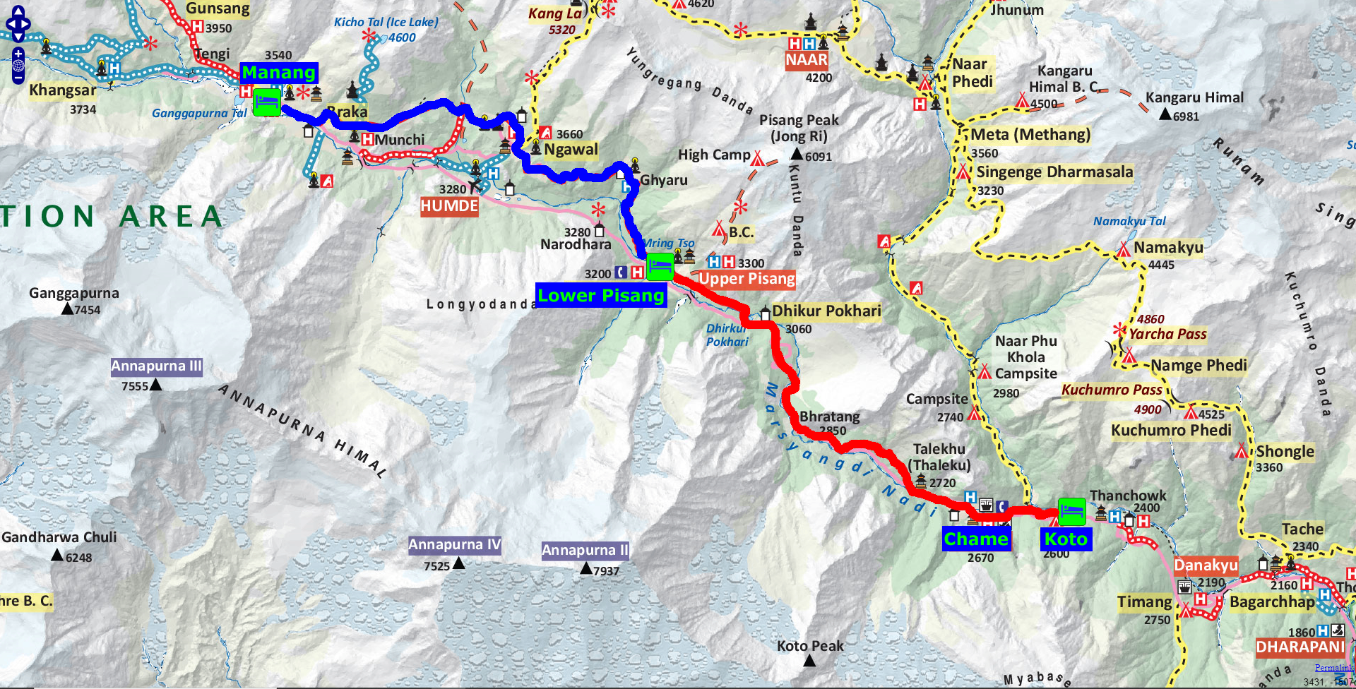 Daarna volgen wij de wonderschone 'high route' naar Ngawal (3650m), hoog boven het dal, met waanzinnige vergezichten, maar ook als wij achterom kijken, zien wij Ghyaru prachtig tegen de bergwand liggen. In Ngawal lunchen wij onder toeziend oog van een oude vrouw met een boeddhistisch gebedssnoer in haar handen. We passeren een bergweide met yaks, prachtige dieren. Een half uur voor Manang bereiken we het schilderachtige dorpje Braga, een tegen de rots geplakt dorp met een heel mooie, zeer oude Gompa, misschien wel de mooiste gompa uit de omgeving. 500 Jaar oud! Net na de ingang verwelkomt een rode demon met getrokken zwaard ons. Binnen heel veel boeddha's en een grote zware kluis waar je je donatie in kan gooien. We overnachten in Manang.
