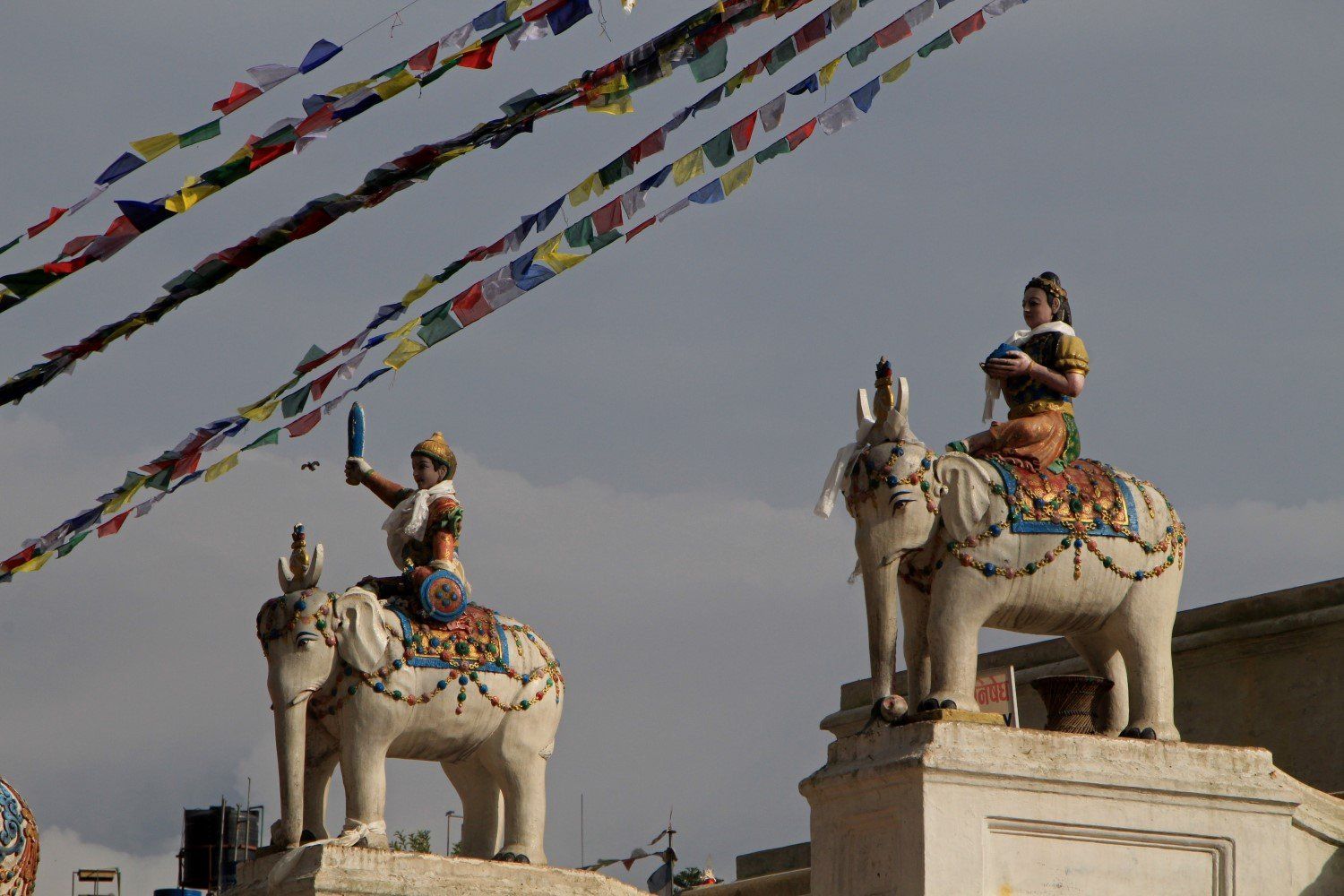 Terug in Kathmandu bezoeken wij in de namiddag de grote stupa Boudhanath. Al vele boeddhistische gelovigen zijn bezig met de kora, rondjes lopen rond de stupa, bidden en tegelijkertijd gebedsmolens ronddraaien. De echte gelovigen strekken zich helemaal op grond uit. Het is een rustgevende, misschien wel een spirituele ervaring al die boeddhisten hun geloof te zien beleven. Op een dakterras genieten wij van het diner maar ook van uitzicht op de stupa.