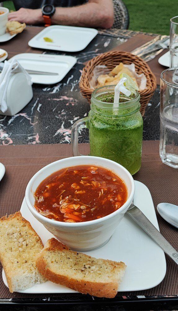 Terug in het hotel, bij een bank geld wezen pinnen om daarna op een terrasje Sweet en Sour soep gegeten met een Margarita zonder alcohol. Want anders had ik het niet gered tot het avondeten van 8 uur in het hotel.