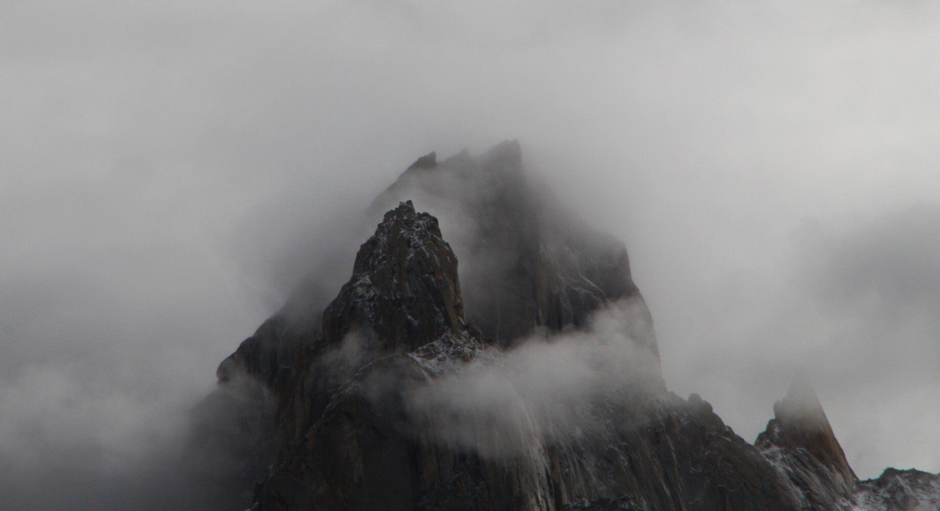 Wolken hebben nog steeds de overhand tussen de bergtoppen.