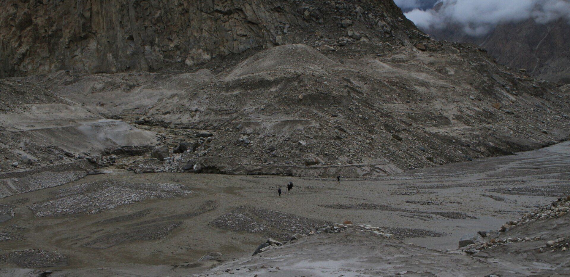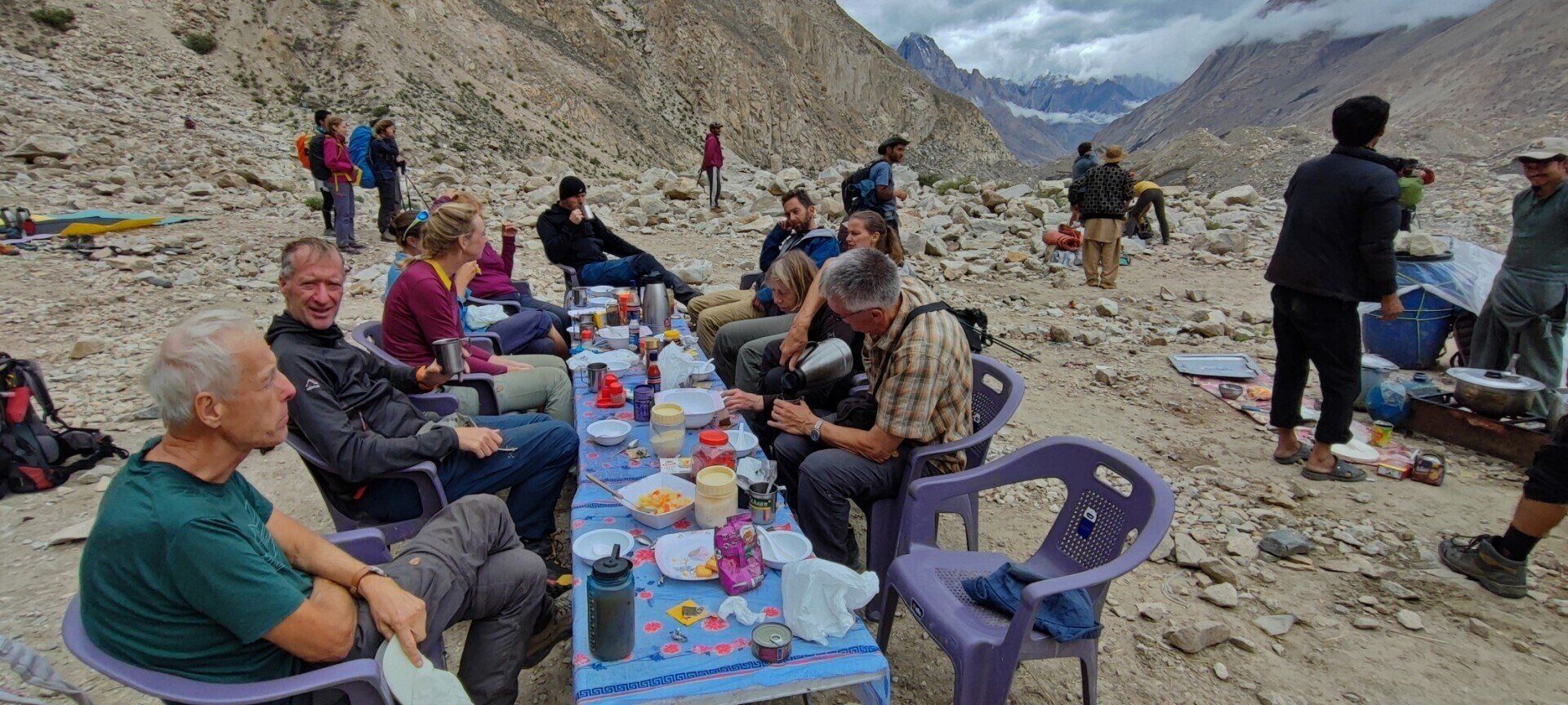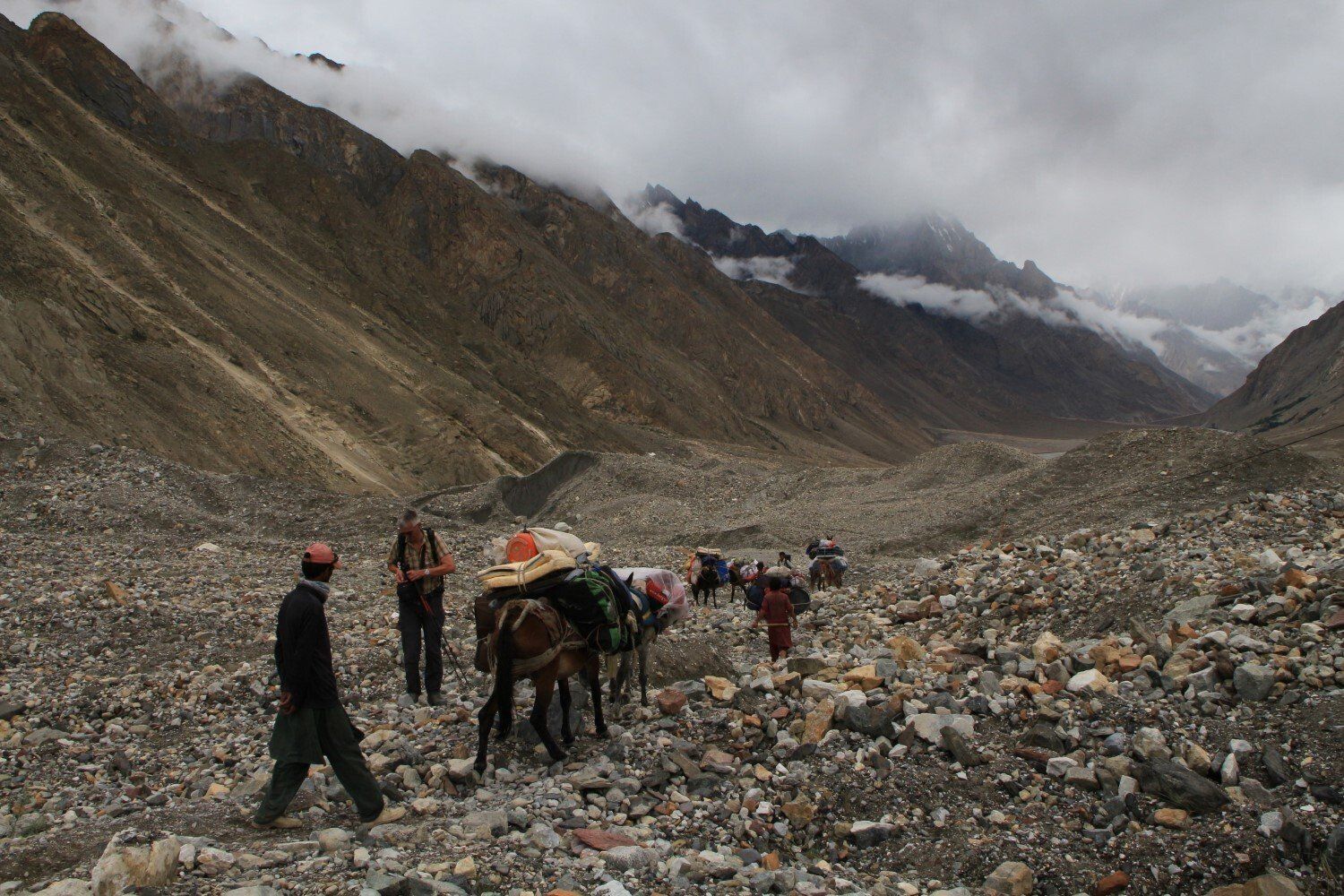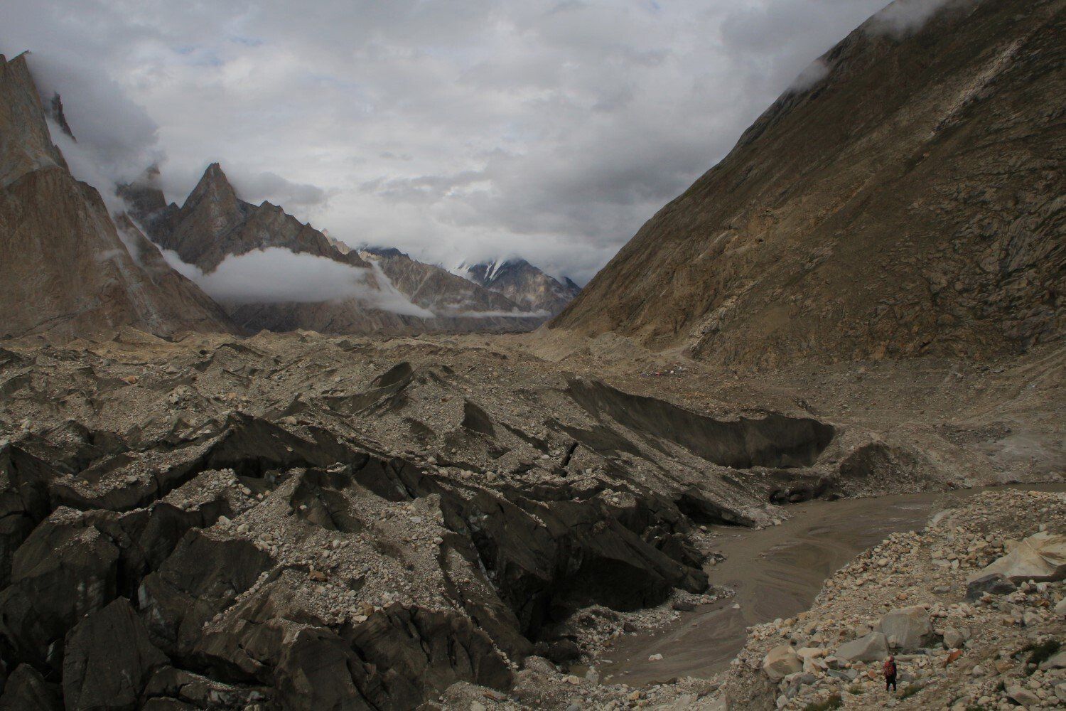Hoe dichter we bij de mond van de gletsjer komen hoe indrukwekkender het wordt. Met volle kracht stroomt het water uit de gigantische gletsjer. Een zalig gevoel ervaar ik als ik voor het eerst de gletsjer op loop, zelfde gevoel als voor het eerst weer op natuurijs staan. Het is allebei ijs maar het ijs van de gletsjer is wel duizenden jaren oud en een paar 100 meter dik. Het pad gaat veel op en neer over de met keien bezaaide heuvels van de gletsjer. Vaak ligt er wel een meter dik puin op het ijs en het is fascinerend om te bedenken dat deze stenen onder je voeten van de top van Broad Piek, Gasherbrum of K2 kunnen zijn gekomen. Als ik mij omdraai zie ik een golvende gletsjer overgaan in de Braldu rivier. Wolken hebben nog steeds de overhand tussen de bergtoppen. Tijdens de volgende break passeert een karavaan zwaar beladen muildieren ons. Ongemerkt hebben we in 2 uur ineens de gletsjer overgestoken en lopen we over de zijmorene met uitzicht op gigantische blokken zwart ijs. Heel indrukwekkend. Even verderop staan de tafels al klaar voor de lunch.