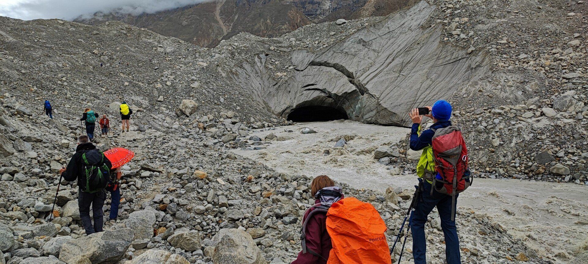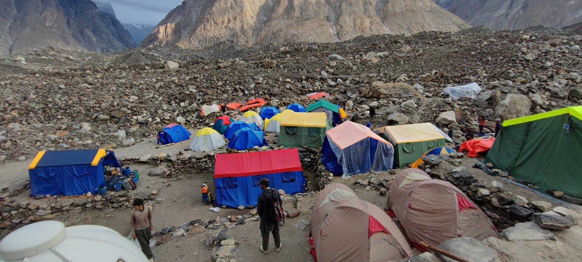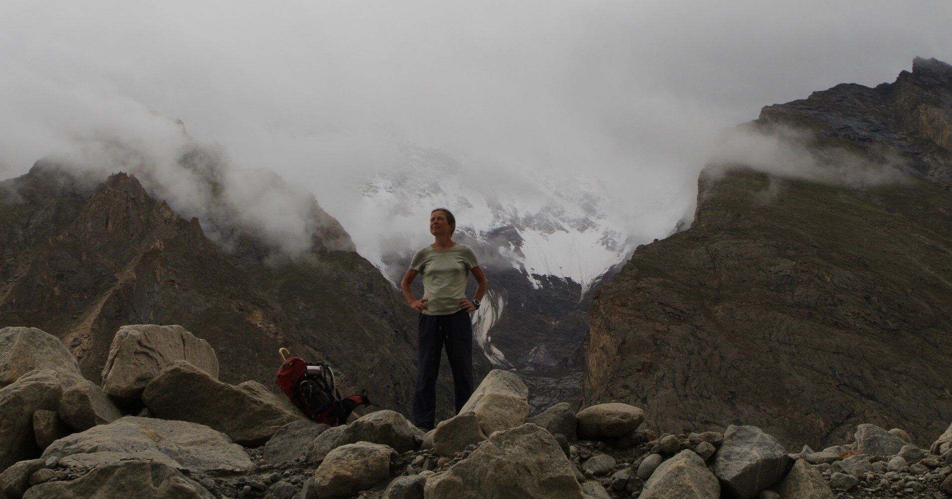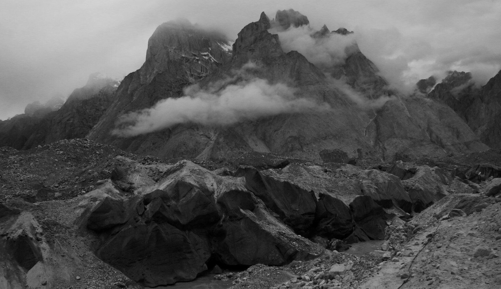 Hoe dichter we bij de mond van de gletsjer komen hoe indrukwekkender het wordt. Met volle kracht stroomt het water uit de gigantische gletsjer. Een zalig gevoel ervaar ik als ik voor het eerst de gletsjer op loop, zelfde gevoel als voor het eerst weer op natuurijs staan. Het is allebei ijs maar het ijs van de gletsjer is wel duizenden jaren oud en een paar 100 meter dik. Het pad gaat veel op en neer over de met keien bezaaide heuvels van de gletsjer. Vaak ligt er wel een meter dik puin op het ijs en het is fascinerend om te bedenken dat deze stenen onder je voeten van de top van Broad Piek, Gasherbrum of K2 kunnen zijn gekomen. Als ik mij omdraai zie ik een golvende gletsjer overgaan in de Braldu rivier. Wolken hebben nog steeds de overhand tussen de bergtoppen. Tijdens de volgende break passeert een karavaan zwaar beladen muildieren ons. Ongemerkt hebben we in 2 uur ineens de gletsjer overgestoken en lopen we over de zijmorene met uitzicht op gigantische blokken zwart ijs. Heel indrukwekkend. Even verderop staan de tafels al klaar voor de lunch.