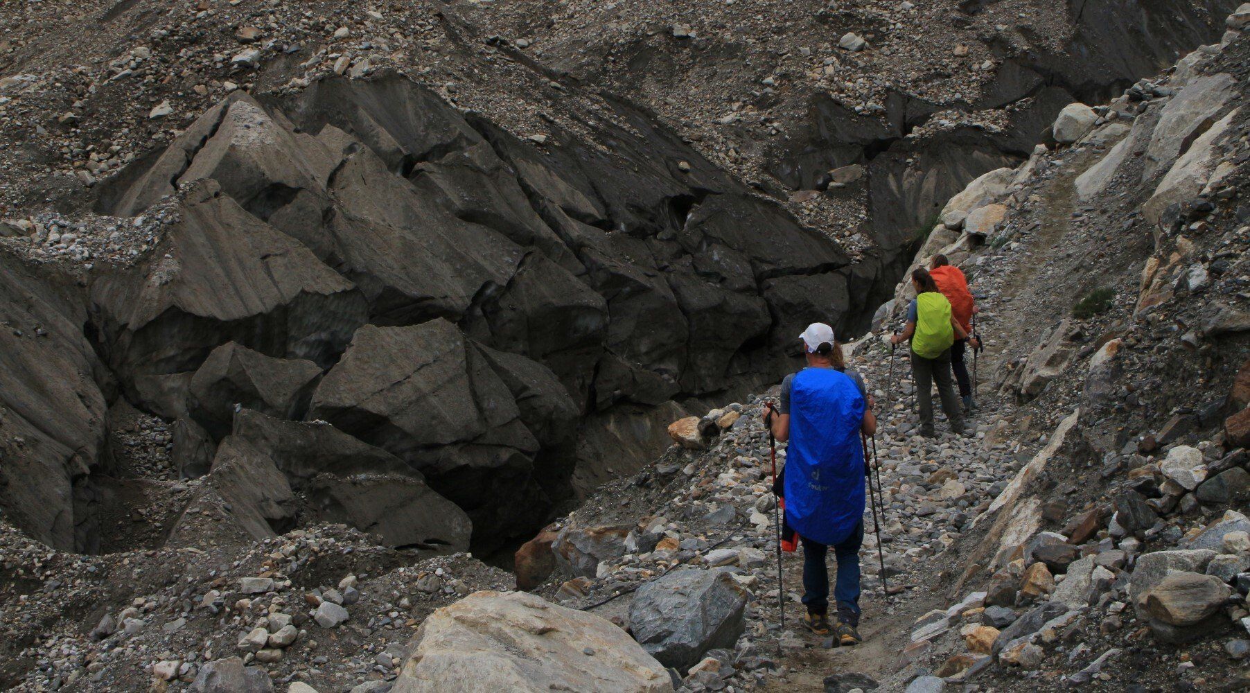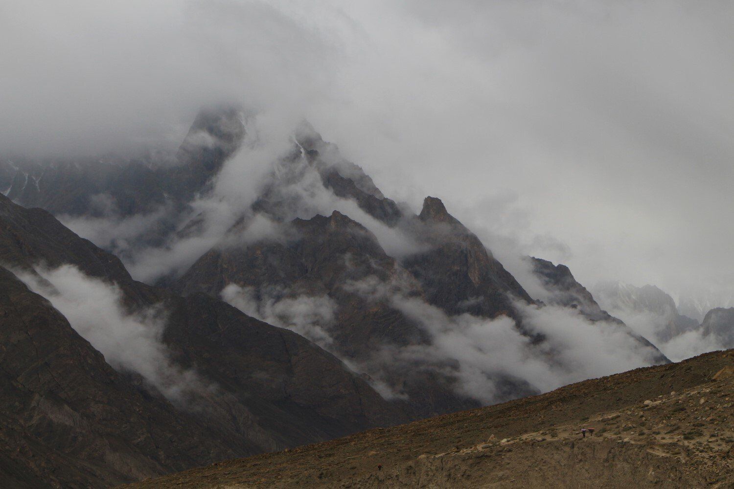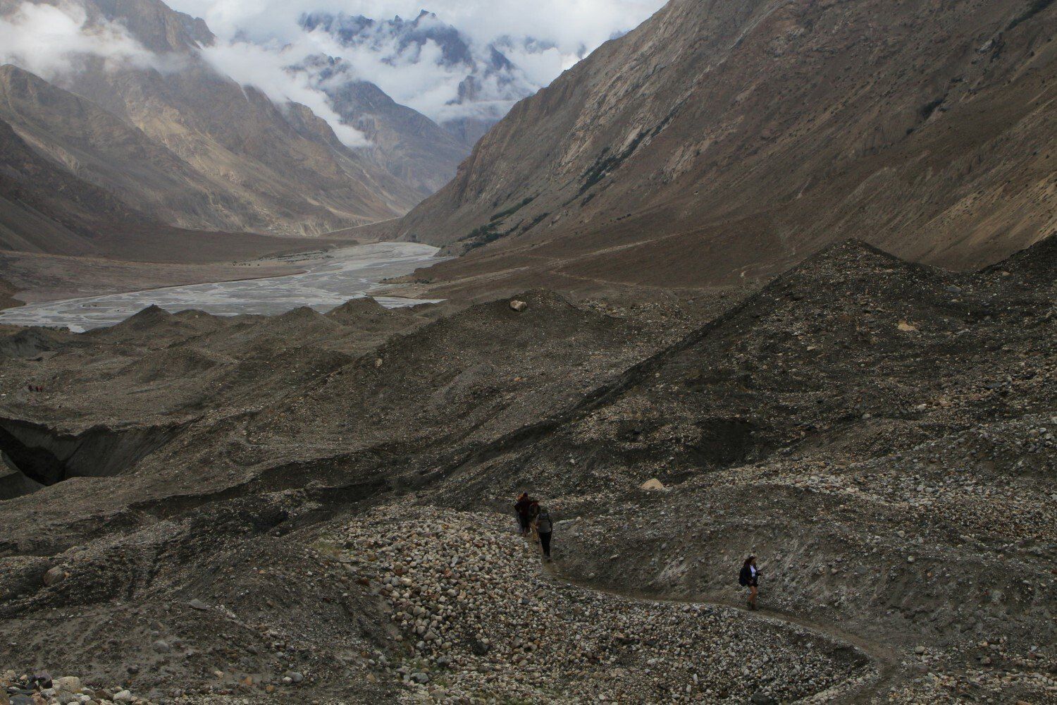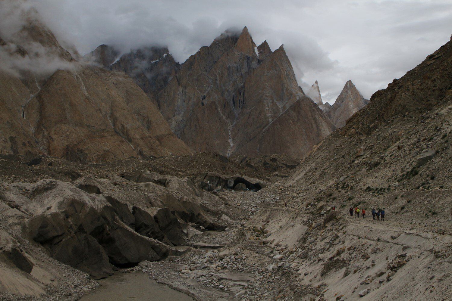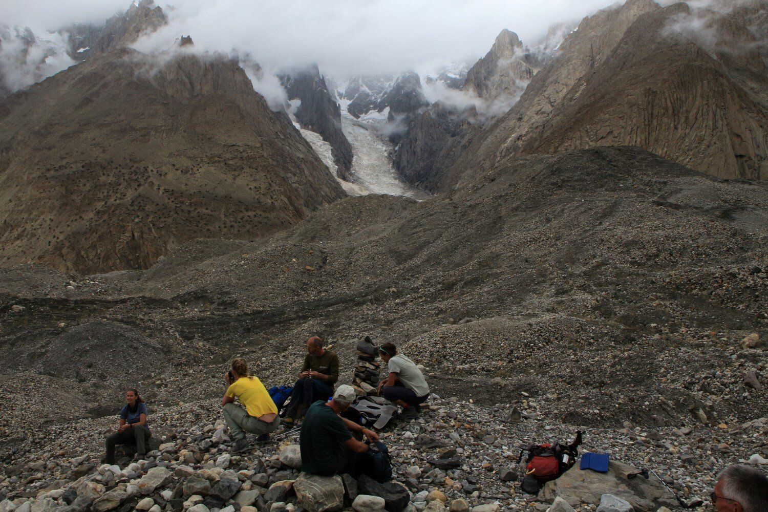 Wanneer we wakker worden zien we verse sneeuw op de bergtoppen liggen. Het is nu wel droog maar de grijze bewolking hangt er nog steeds. Net na 7 uur gaan we op pad. Ruim een uur later komt de tong van de machtige Baltoro gletsjer in zicht, een indrukwekkend gezicht. Tijdens de eerste break vallen er een paar druppels en de paraplu's en regenhoezen komen te voorschijn, gelukkig stelt het niet veel voor maar het blijft wel dreigend. Wolkenflarden zweven tussen de bergtoppen door.
