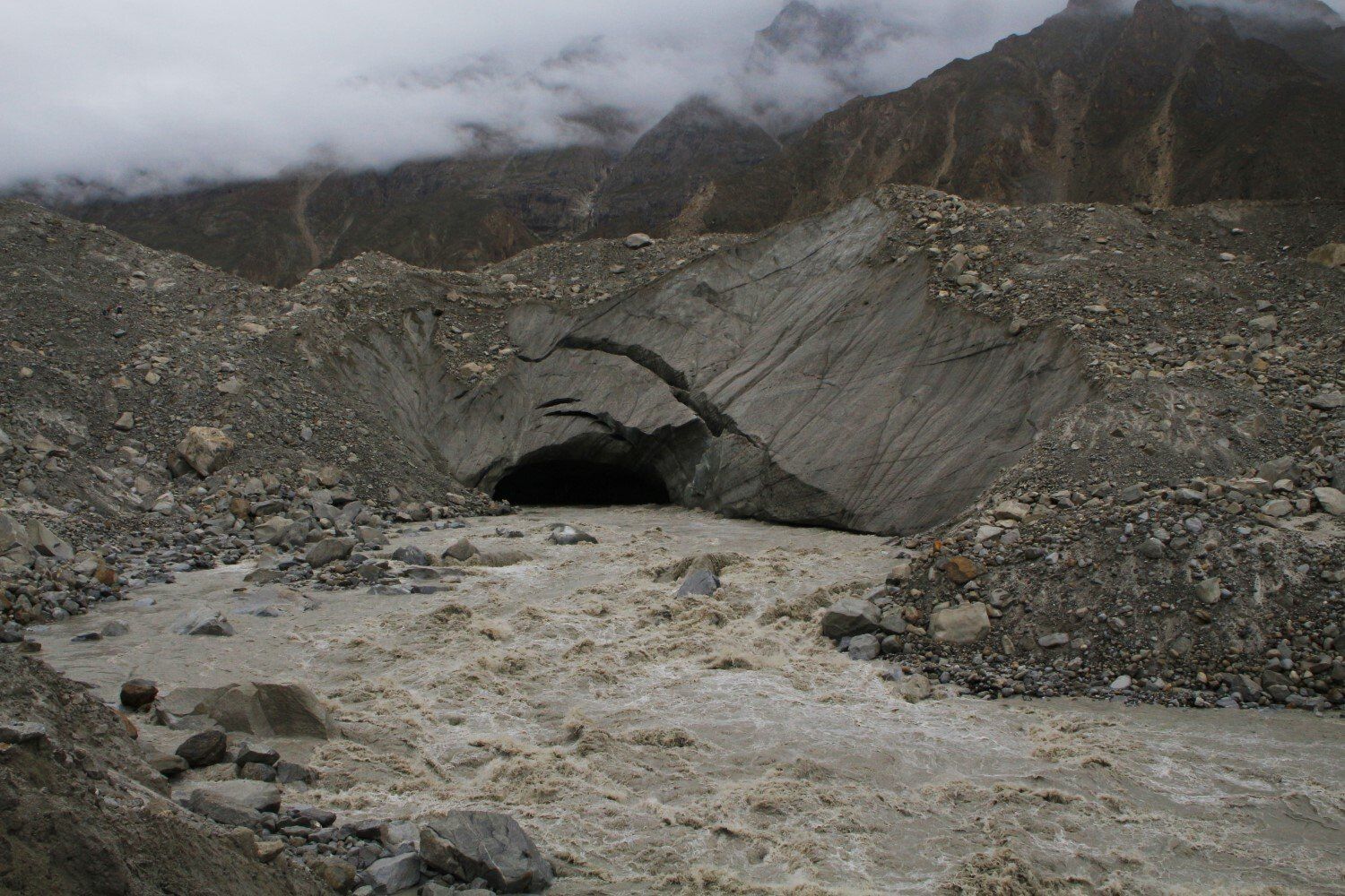 Als ik mij omdraai zie ik een golvende gletsjer overgaan in de Braldu rivier.