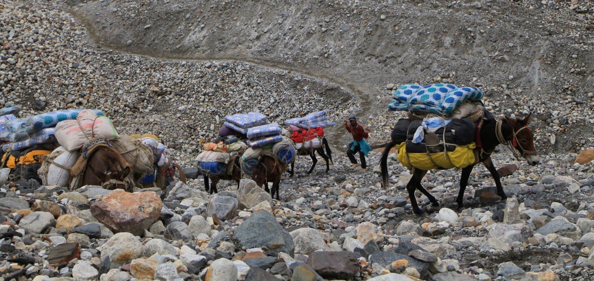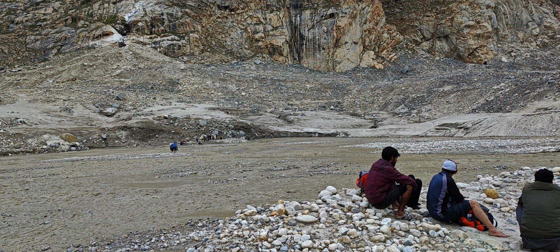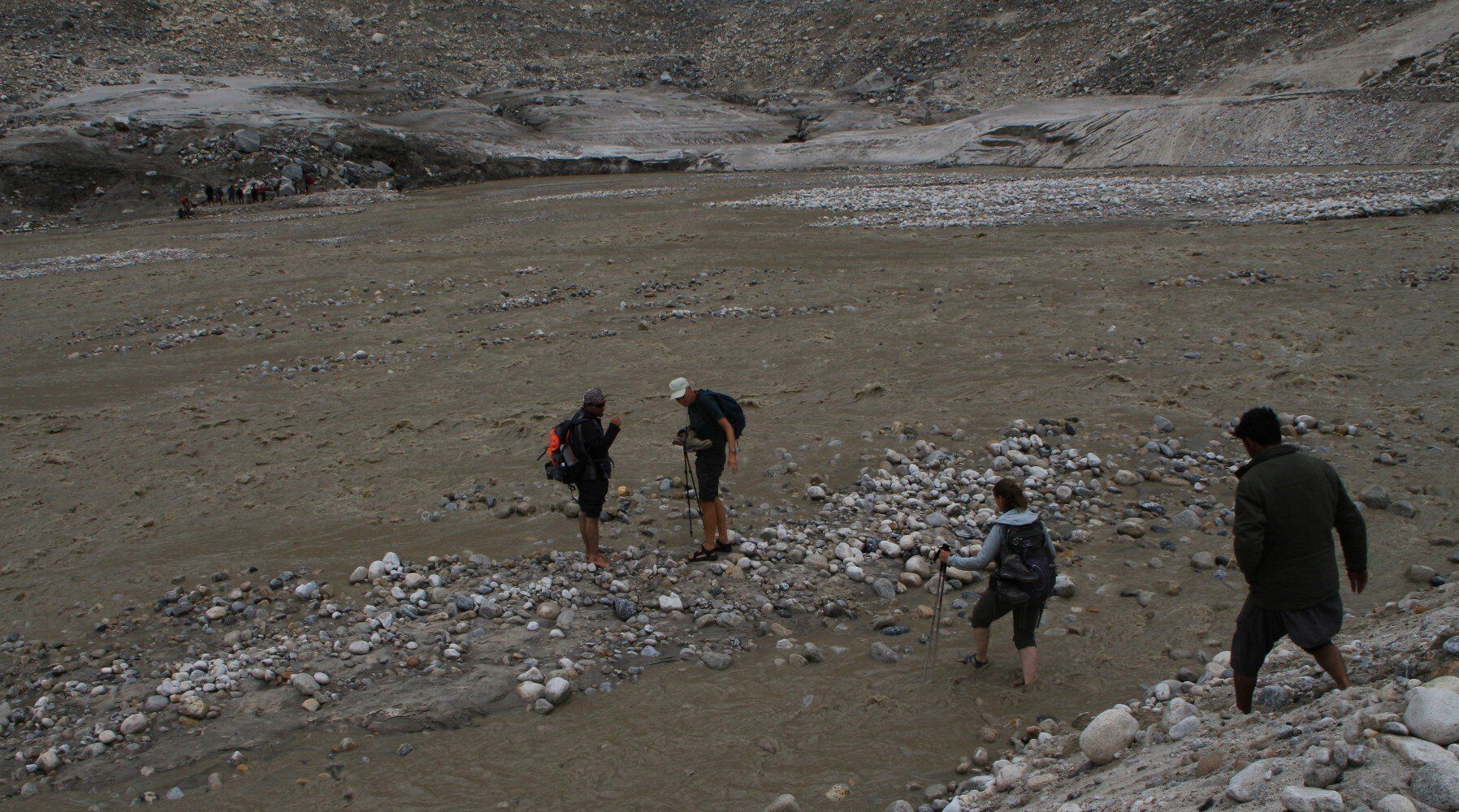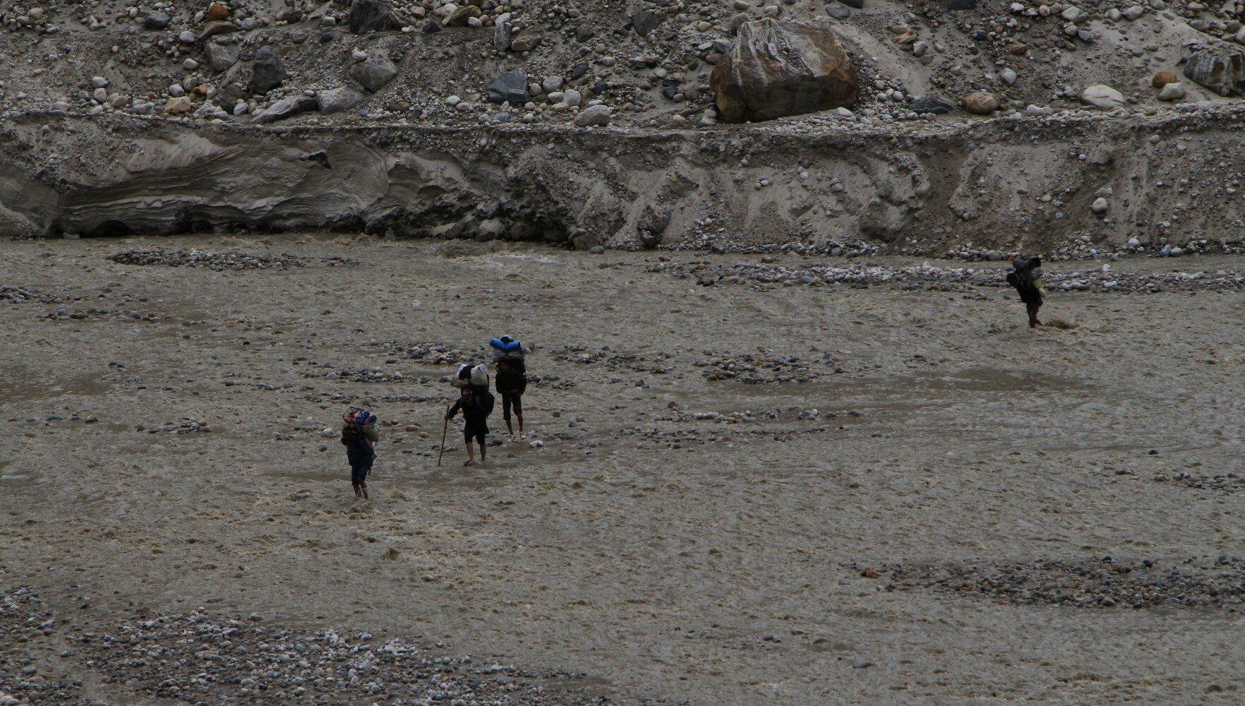 Het pad gaat verder over de zijmorene langs de gletsjer met zijn uit de kluiten gewassen ijsblokjes en daarachter scherpe bergtoppen tussen de wolken. Het kampement is in de verte al te zien, maar er volgt nog een surprise, een brede ijskoude snel stromende rivier oversteken, zo van een zij gletsjer. Het eerste stuk loop ik alleen, het water komt tot boven je knieën, het water is zo koud dat het pijn doet. Halverwege op een eilandje moet ik mijn bijna verloren Teva's weer vastzetten voordat ik door een porter aan de hand wordt genomen om het laatste stuk te doorwaden. Op het klimmetje zie ik een aantal porters met volle bepakking het ijskoude water ovetsteken. Gezamelijk zoeken ze hun weg naar de overkant. Na het klimmetje bereiken we Khobursai, ons kamp van komende nacht.