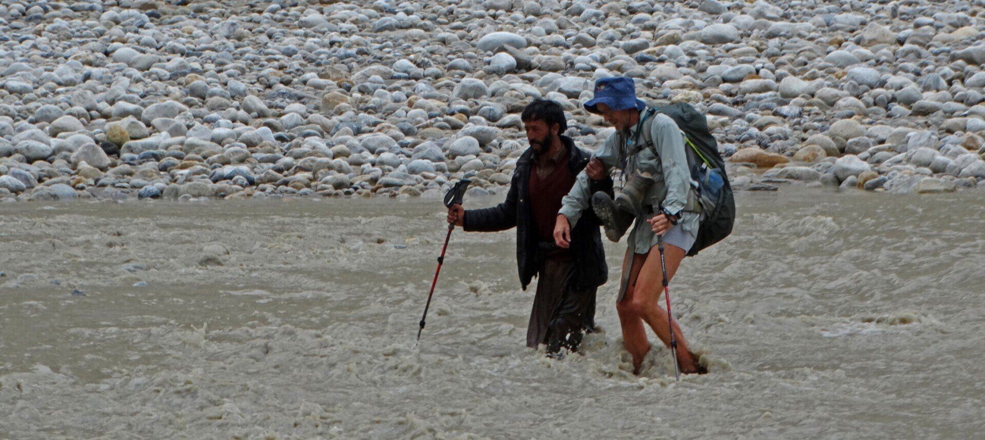 Halverwege wordt ik door een porter aan de hand genomen om het laatste stuk te doorwaden. (foto van Peggy)